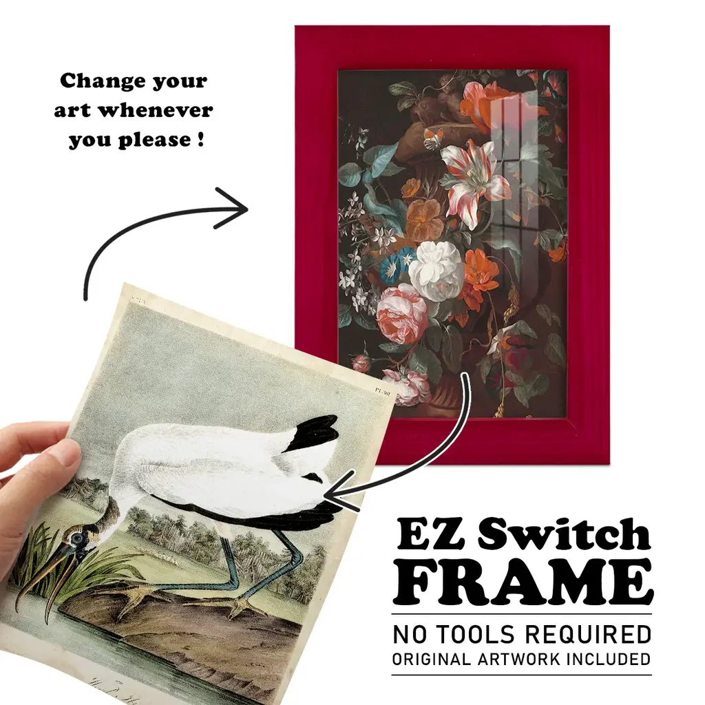 Wood Ibis -EZ SWITCH Framed Print w/glass-Cherry Red A delightful, framed print. Featuring a solid wood frame with real wood glass. This premium print is giclee quality. In addition, every frame features a removable back and table top stand. This allows you to change your art in the future or to just stand the art on a table for a new look. We are sure you'll enjoy our new series of EZ SWITCH Framed Art. Solid Wood Frame Real Glass Removable / Replaceable Art Built in Tabletop Stand Sizes range from 4x6 up to 12x15 - buy just one or pair them up as sets as you see fit.