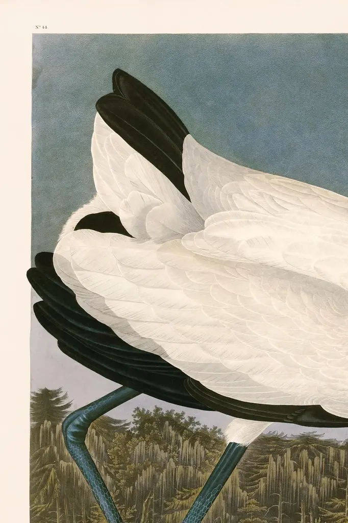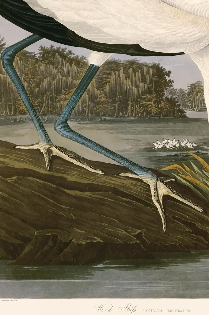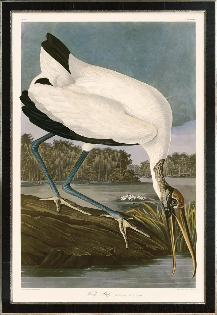 Giclee reproduction Wood Ibis from John J. Audubon's The Birds of North America Double Elephant Folio. Framed in a beautiful black wood moulding with acrylic glazing. The moulding is a real wood veneer moulding the is hand finished and made in Italy. Framed using archival acid free foam core and acrylic this giclee reproduction is the highest quality. The back has a dust cover and hooks and wire to easily hang on the wall. Please note that colors on your computer screen with vary slightly from what it actually is. The image is printed on acid free cotton rag paper with archival inks that have a light-fastness of over 140 years so it will not fade for a very, very long time. This has been produced and framed just outside of Atlanta Georgia in the USA.