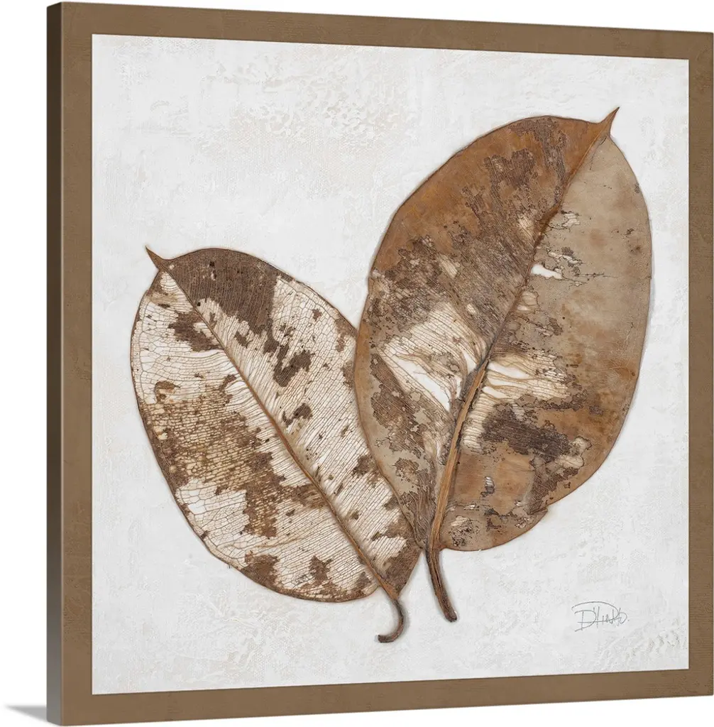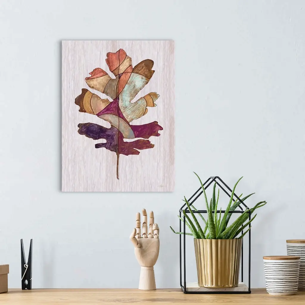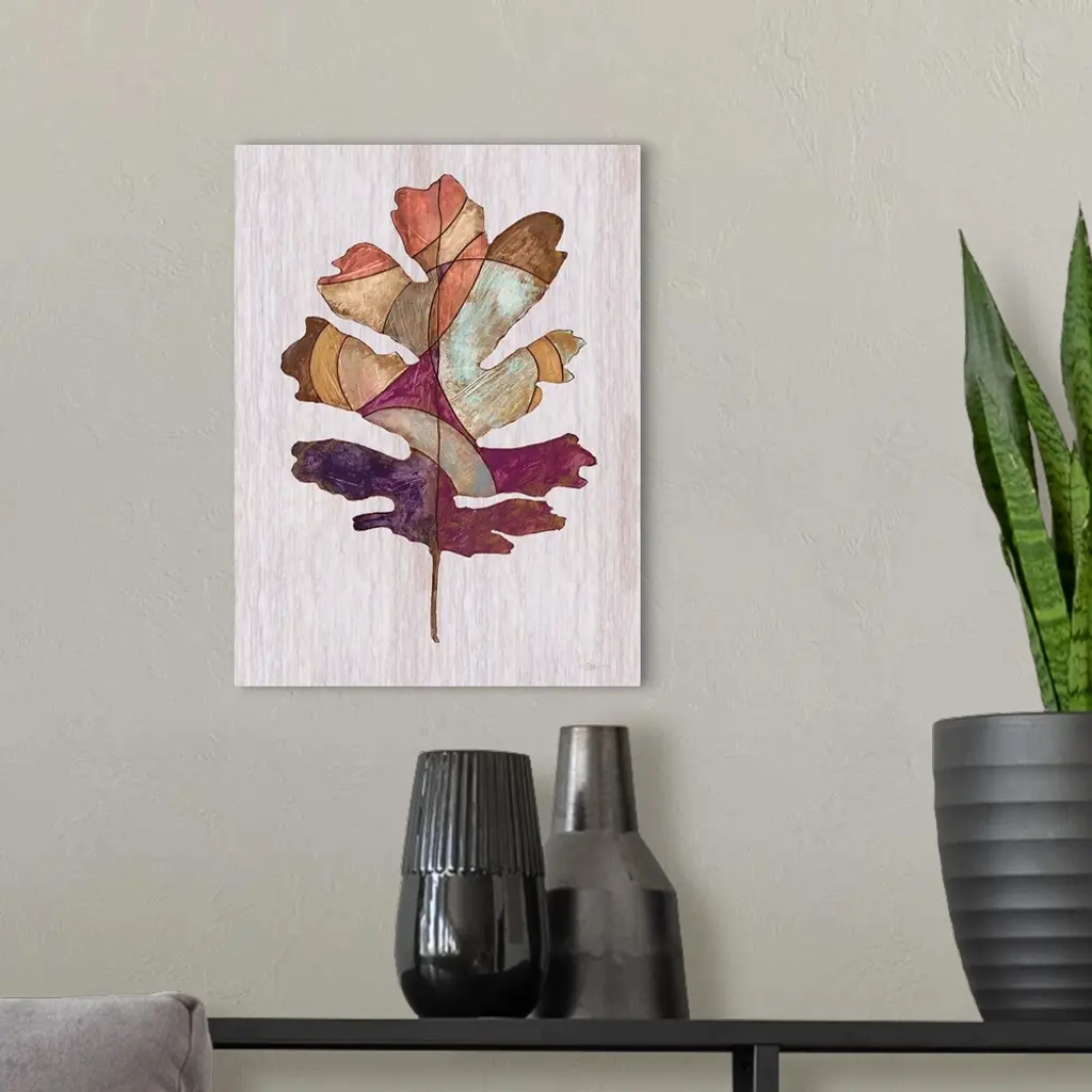 Contemporary painting of a leaf displayed as a wood inlay against a neutral background.