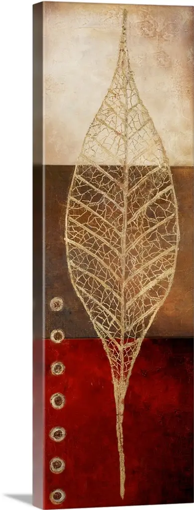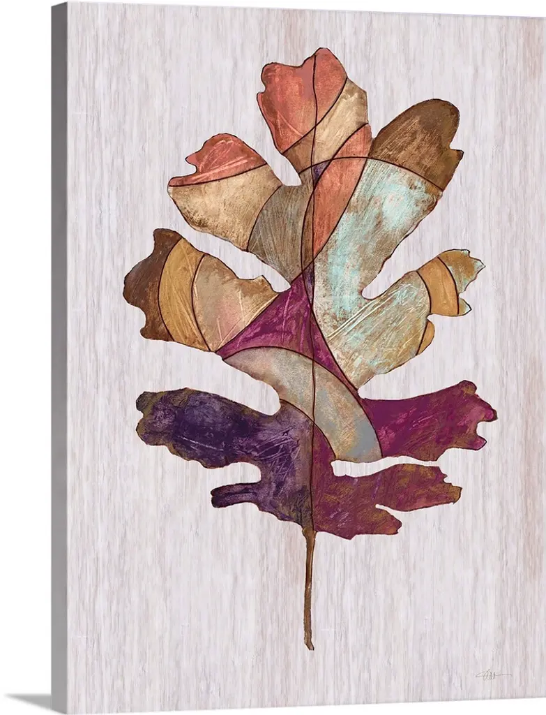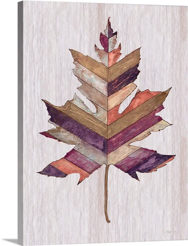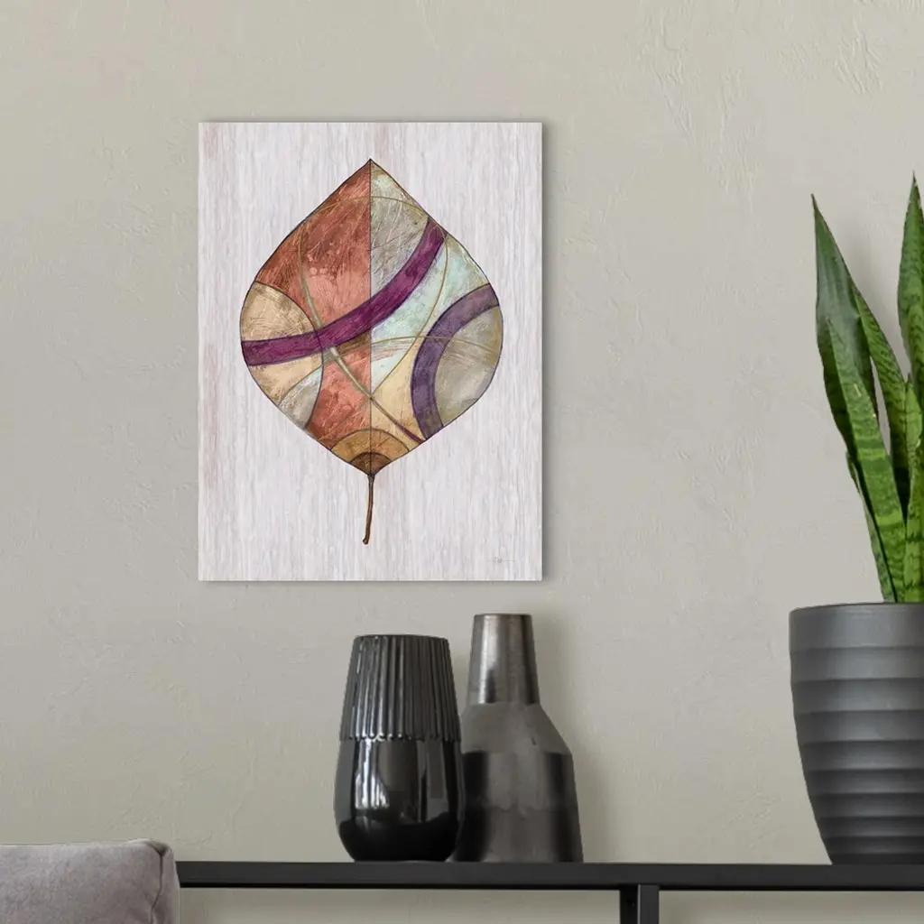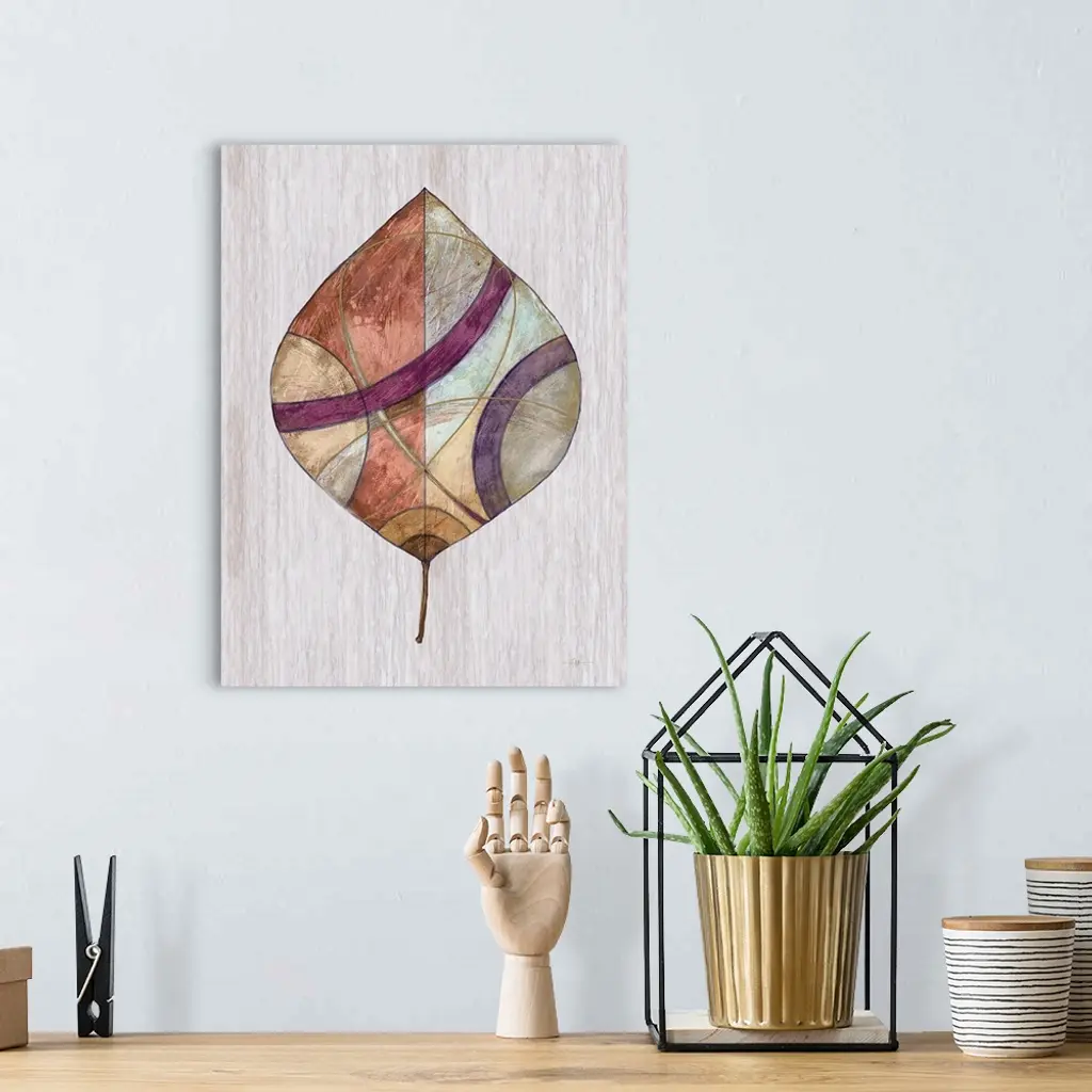 Contemporary painting of a leaf displayed as a wood inlay against a neutral background.