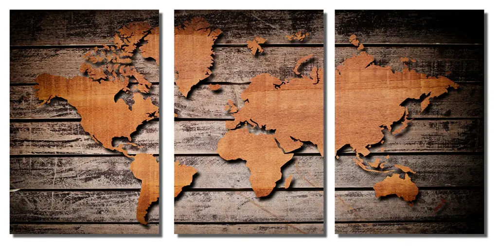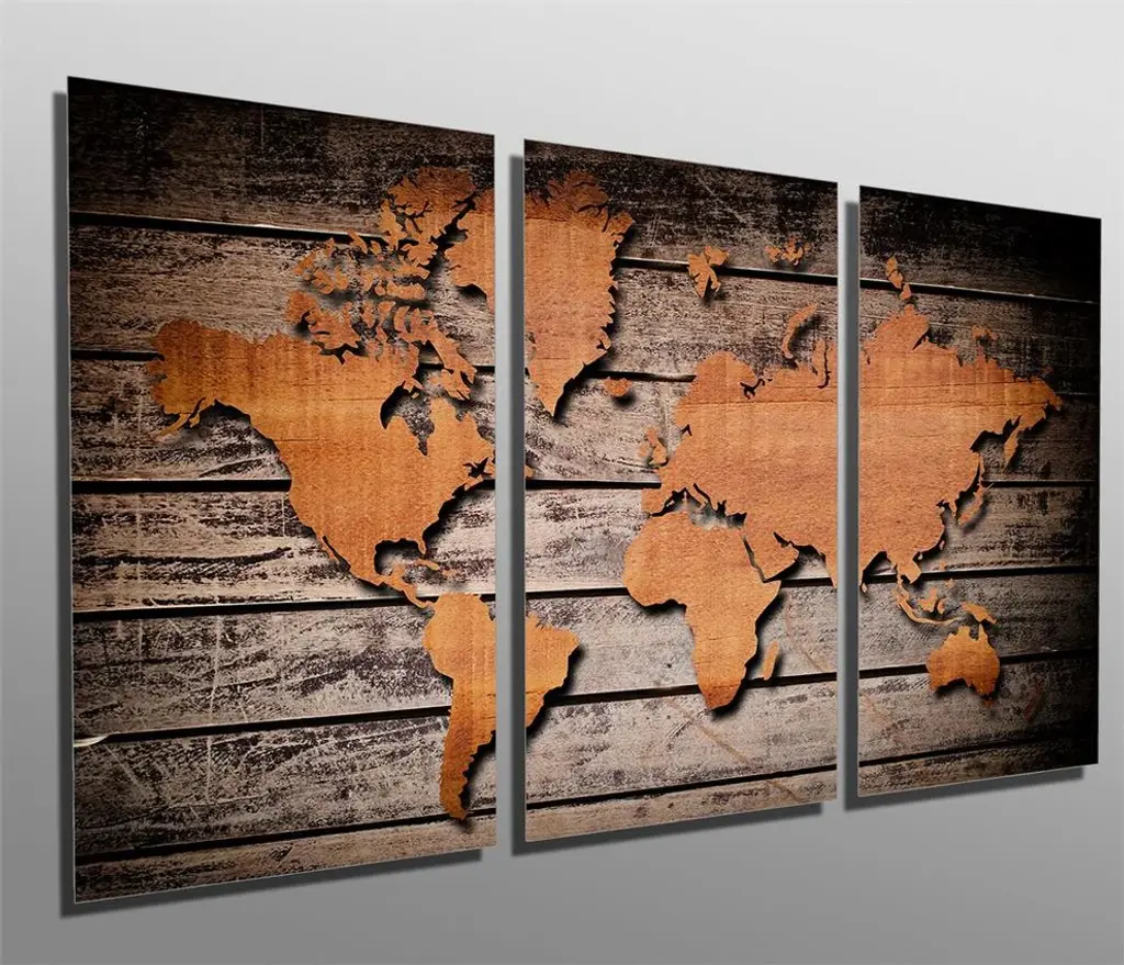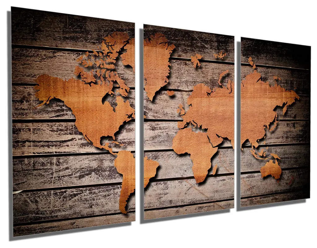 36"œ x 18"œ total size. Ready To Hang! (3 pieces - 12"œ x 18"œ each). 3 Panel Split (Triptych) Wood Style effect World Map Metal Print. Modern metal wall art for home or office wall decor & interior design. Printed on Luxurious, HD aluminum glossy metal panels. Multi panel art.. HD aluminum panels. Metal print wall art. Includes Shadow Wall Mount on the back.• Aluminum Metal Wall Art• Made in USA• Ready to hang - No assembly required• Shadow mount hardware on the back• 0.045"œ thick HD Aluminum Panels• Scratch resistant, glossy finish• Superb color clarity, luxurious prints• Epson printing process• For indoor or moisture rich environment use• Easy to clean. Gently wipe with microfiber cloth.