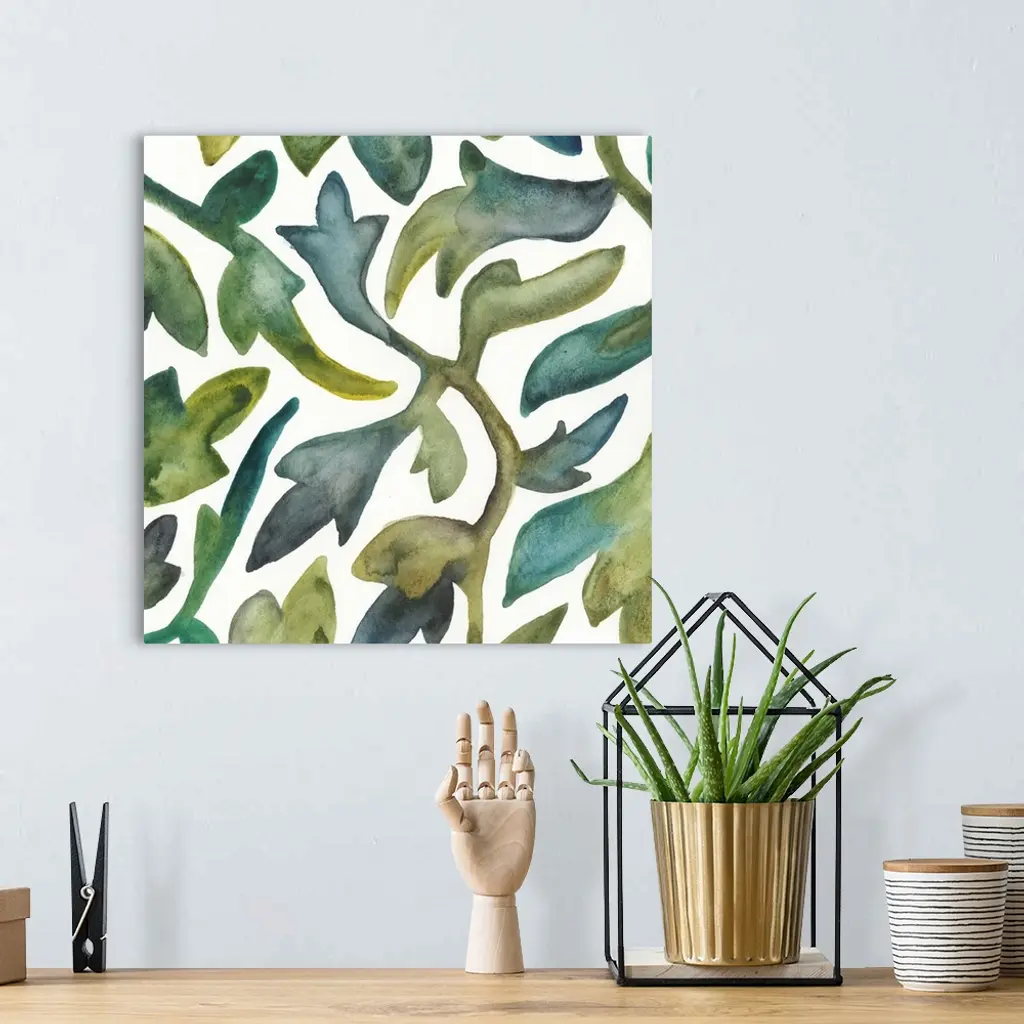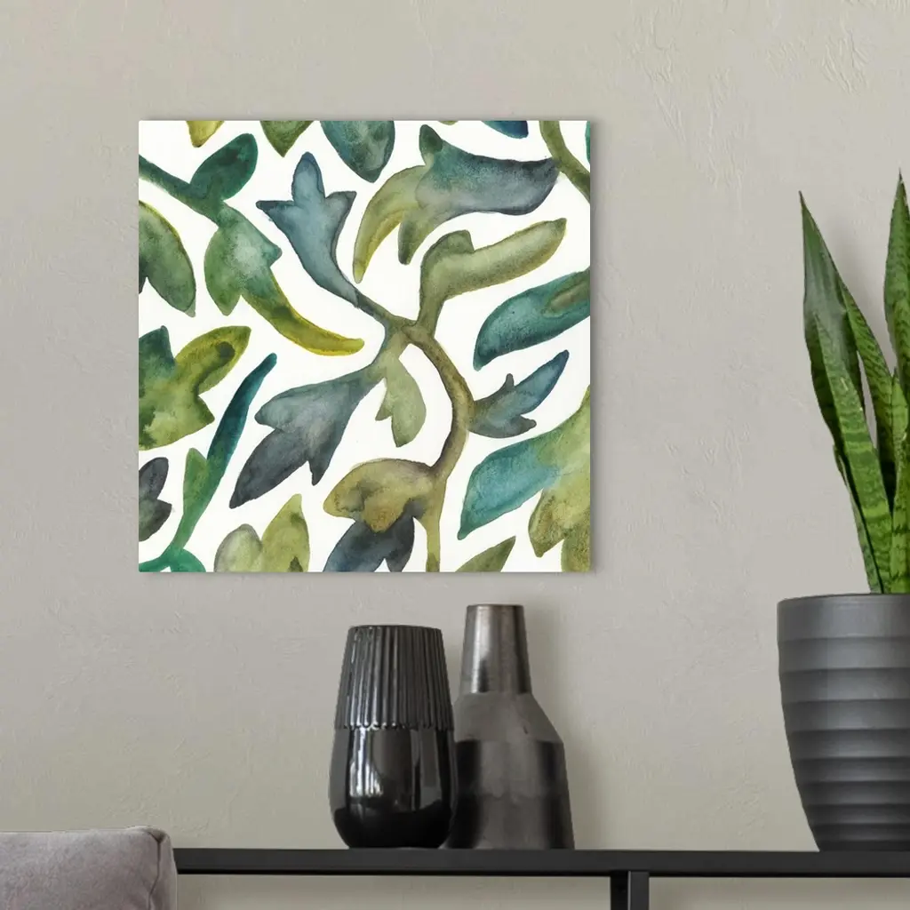 Square abstract painting of a modern interpretation of greenery in varies shades of green on a white backdrop.