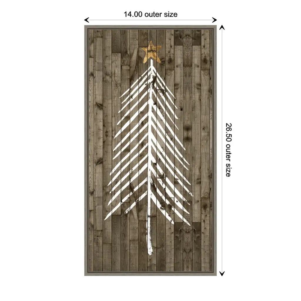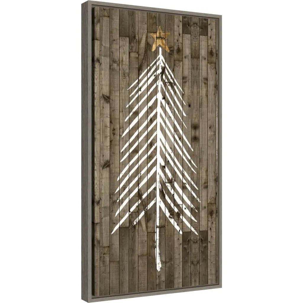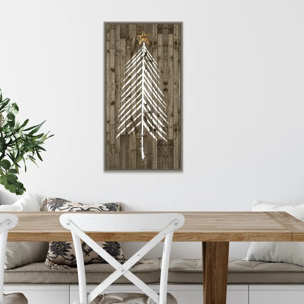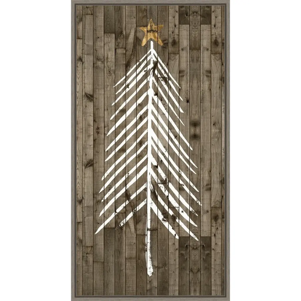 Keep it simple and chic when showcasing your holiday decorating style with this eye-catching piece. Crafted to look like a simple pine Christmas tree painted upon rich, brown wooden planks, the artwork adds a touch of holiday whimsy and wonder without adding too much busyness and frills to your walls.Features:FLOAT FRAMED CANVAS ART: Canvas is framed in a floated style that showcases a narrow gap between the edge of the gallery wrapped canvas and the frame. The wrapped canvas appears as if it's "floating" on the frame. The overall look is clean, modern and upscale.QUALITY: Canvas is printed with high quality, fade-resistant inks and stretched to hide corner folds. Canvas is stretched across a solid surface to resist sagging.AUTHENTICITY: Canvas is printed and professionally framed in Madison, Wisconsin USA with authentically licensed artwork.EFFORTLESS HANGING: Ready to hangfor easy installation. The metal sawtooth hangers come attached on the inset back for easy wall display.CUSTOM PACKAGED: Canvas is custom packaged for protection in shipment to arrive without damage.Details:Artist: Grace PoppTitle: Wooded Whimsy I (Tree)Product type: Framed Canvas BoxStyle: Modern ContemporaryFormat: portraitSize: SmallSubject: VintageFrame: Sylvie Greywash .5"Image dimensions: 25 inches high x 12.50 inches wideOutside dimensions: 26.50 inches high x 14 inches wide x 1.875 inches deep