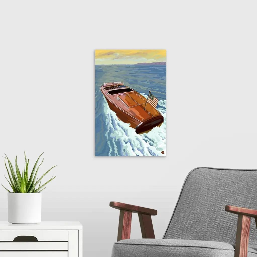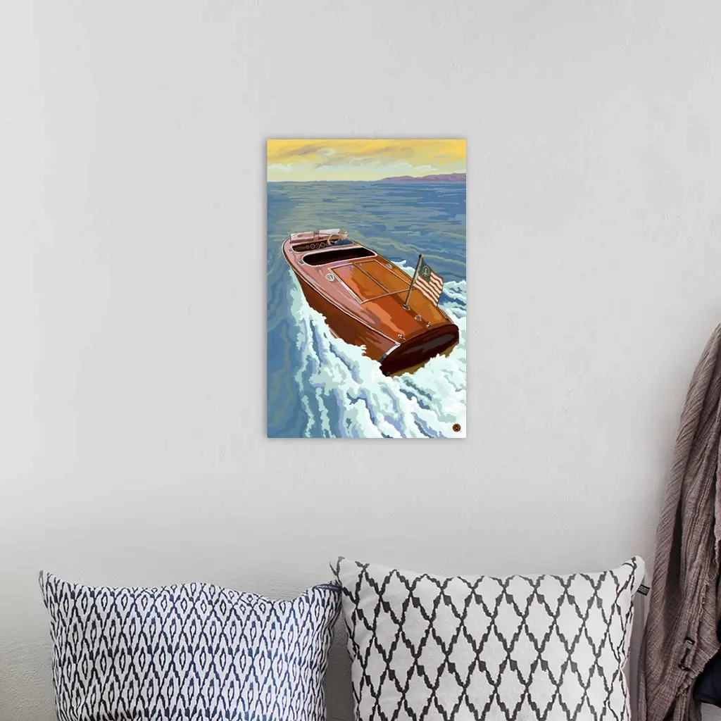Retro stylized art poster of a wooden speed boat on the open sea.
