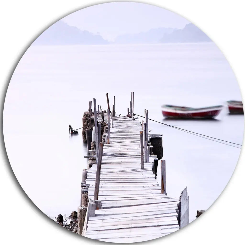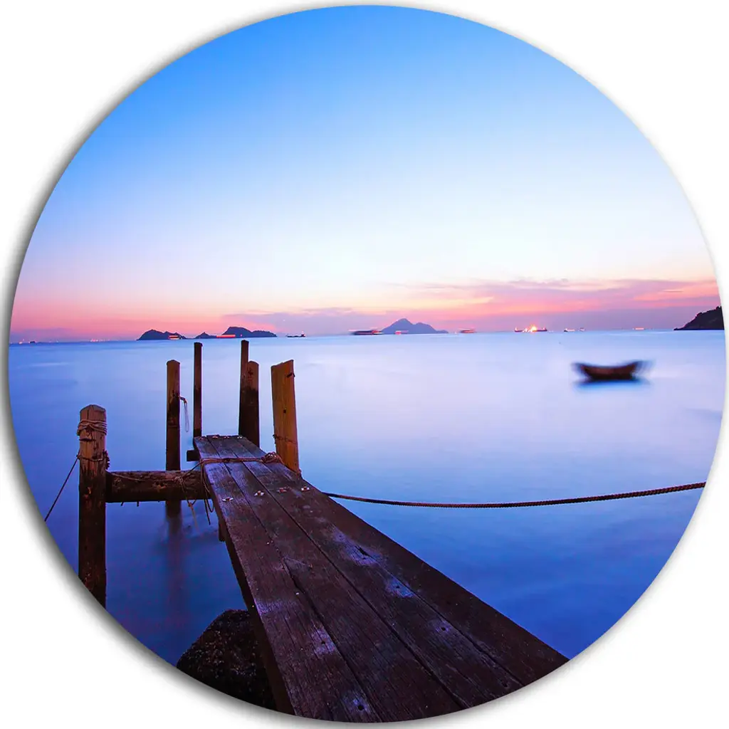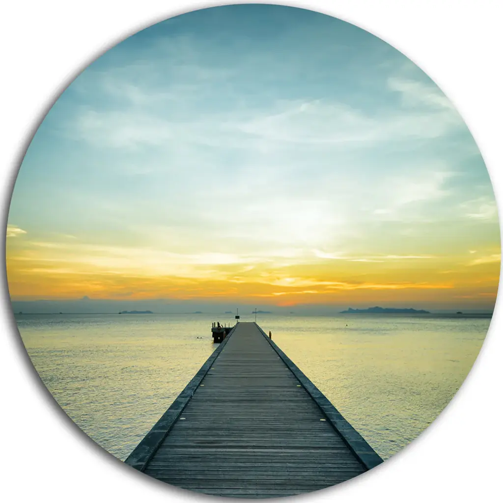 Bring Contemporary Abstraction to your home with this large Circle Metal wall art. This Wooden Bridge into Blue Sea Metal Artwork makes it the focal point of any room or office. - White Gloss Coating ensures colors are extra vibrant with light reflection.- Aluminum grade Sheet Metal with 1 inch mounting frame on the back giving the illusion that the artwork is floating on the wall..- Mounting Brackets are included along with instructions.- High Quality Digital images are created directly into a glossy aluminum panel producing a stunning and captivating print into the glossy finish of the metal.- Water, Fire and Scratch resistant HD Aluminum panels.- Looks better than any photo paper and guaranteed to last at least 20 years- Easy to clean with a microfiber cloth. Colors are far superior to regular Canvas Art. - Easy to Hang
