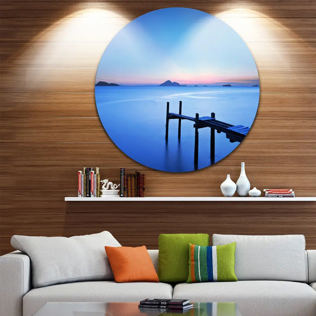 Wooden Pier In Blue Sea, Seascape Photo Large Disc Metal Wall Art, 23"