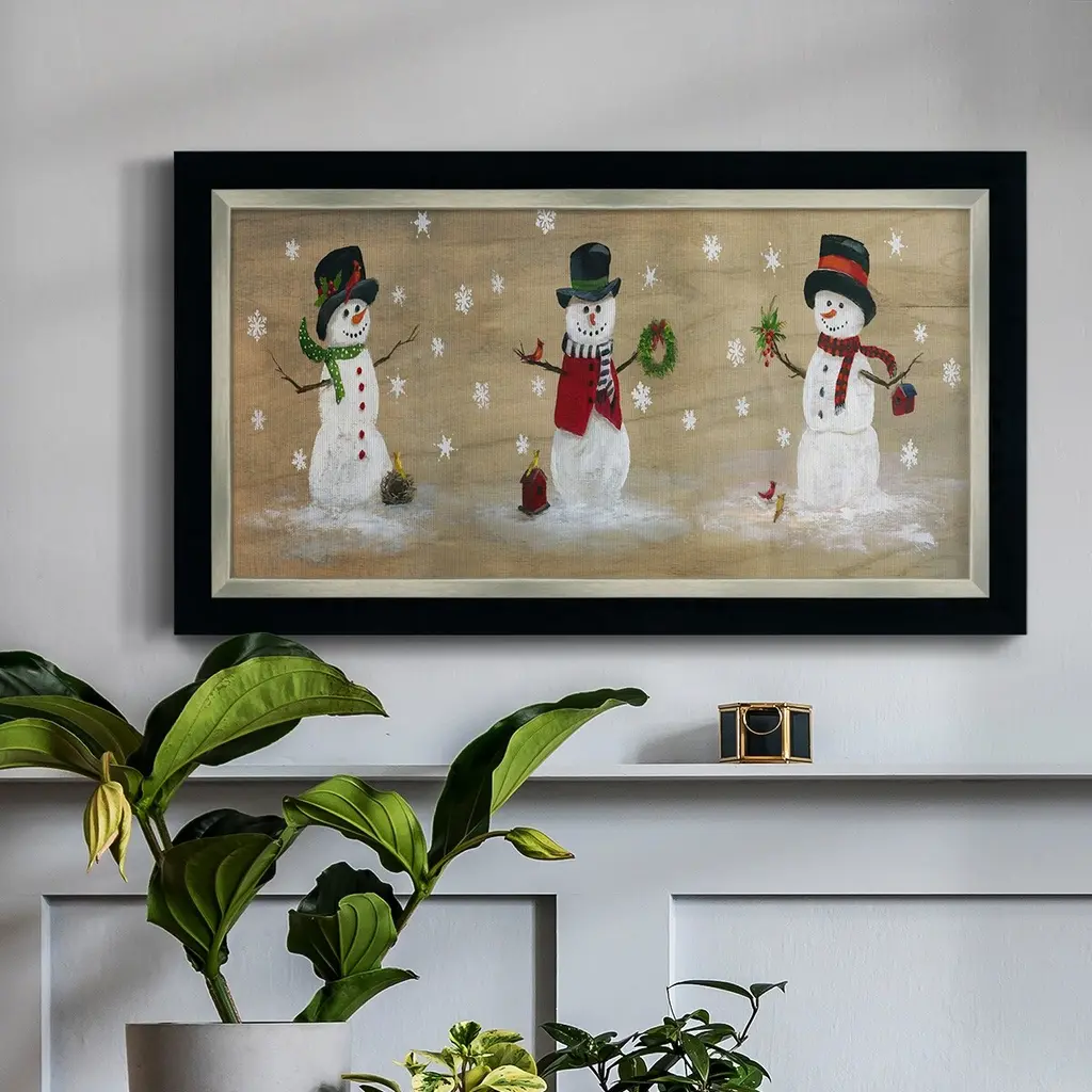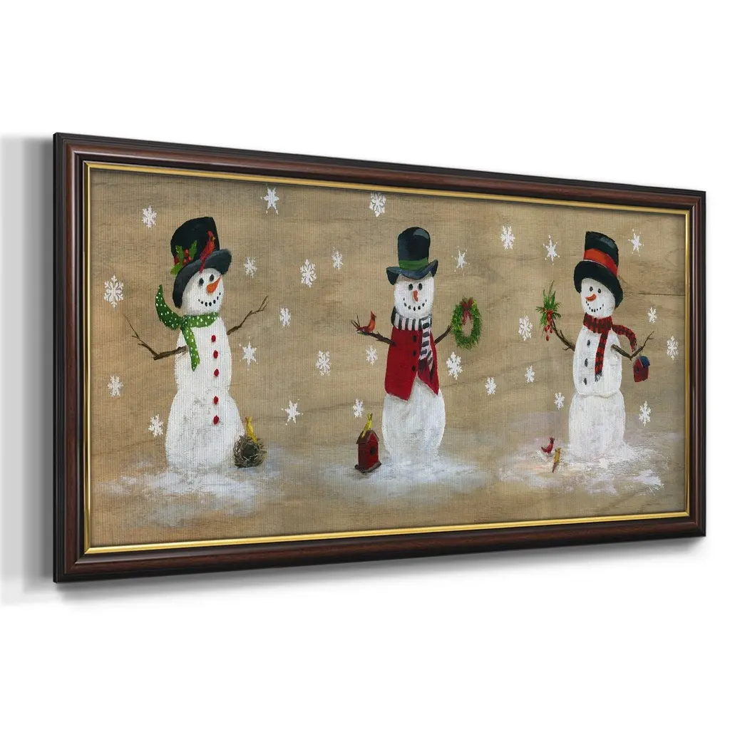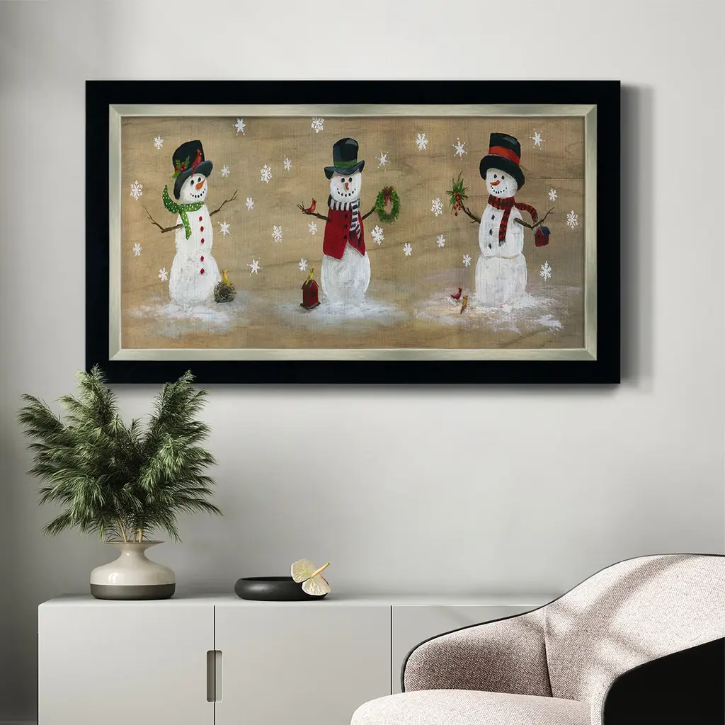 Wooden Snowman Panel Premium Framed Canvas- Ready to Hang A Premium Framed Canvas created to last. Framed in distressed wood and available in an array of sizes and colors Featuring a beveled a solid wood stretcher bar, each piece comes ready to hand 3 SIZES AVAILABLE 21''X37'' - Overall Size 25''X45'' - Overall Size 29''x53'' - Overall Size Each piece is made to order. Each piece comes with hanging hardware. Made in the USA Ready to Hang Giclee Paper Print Acrylic Glass Beveled Matt Board