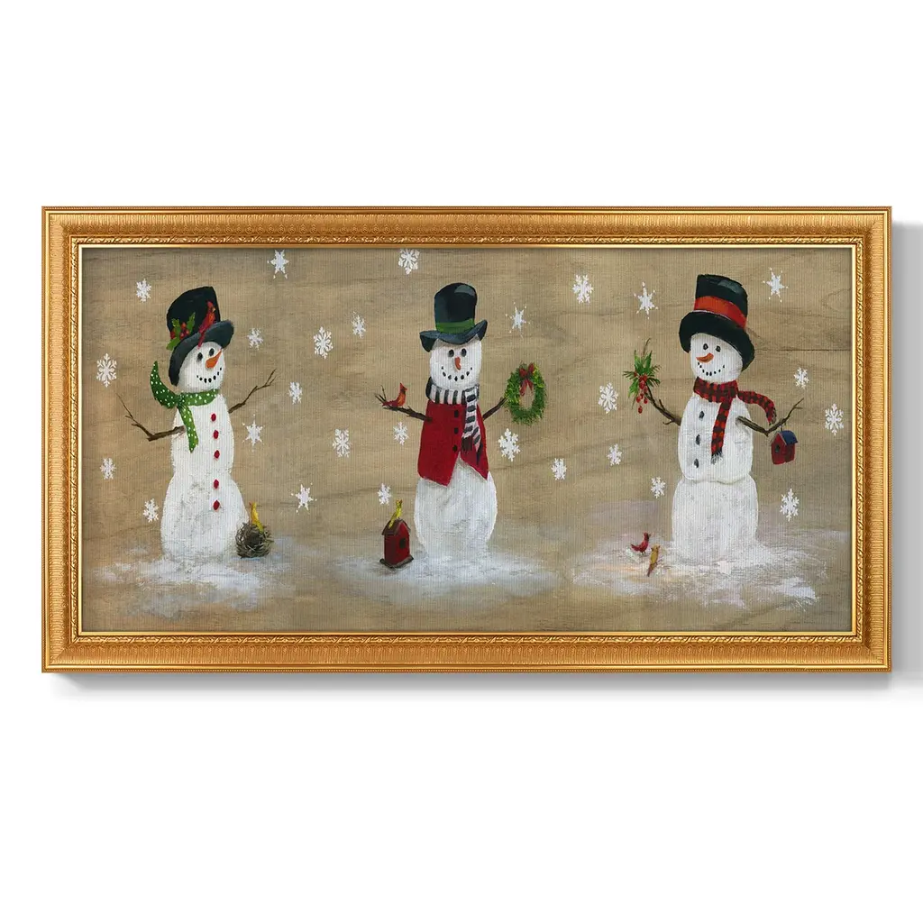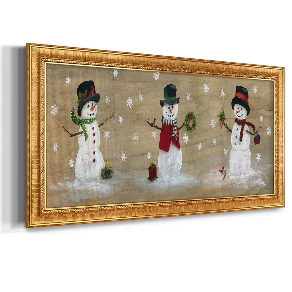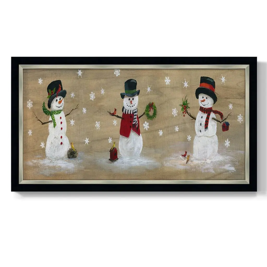 Wooden Snowman Panel Premium Framed Canvas- Ready to Hang A Premium Framed Canvas created to last. Framed in distressed wood and available in an array of sizes and colors Featuring a beveled a solid wood stretcher bar, each piece comes ready to hand 3 SIZES AVAILABLE 21''X37'' - Overall Size 25''X45'' - Overall Size 29''x53'' - Overall Size Each piece is made to order. Each piece comes with hanging hardware. Made in the USA Ready to Hang Giclee Paper Print Acrylic Glass Beveled Matt Board