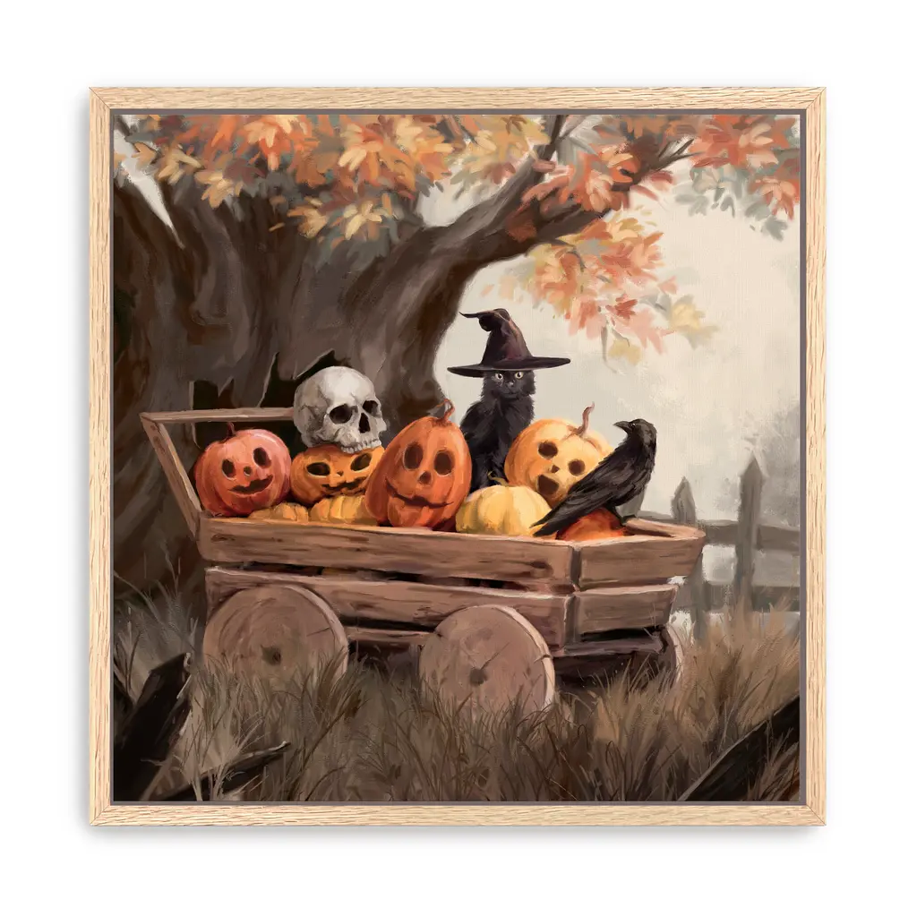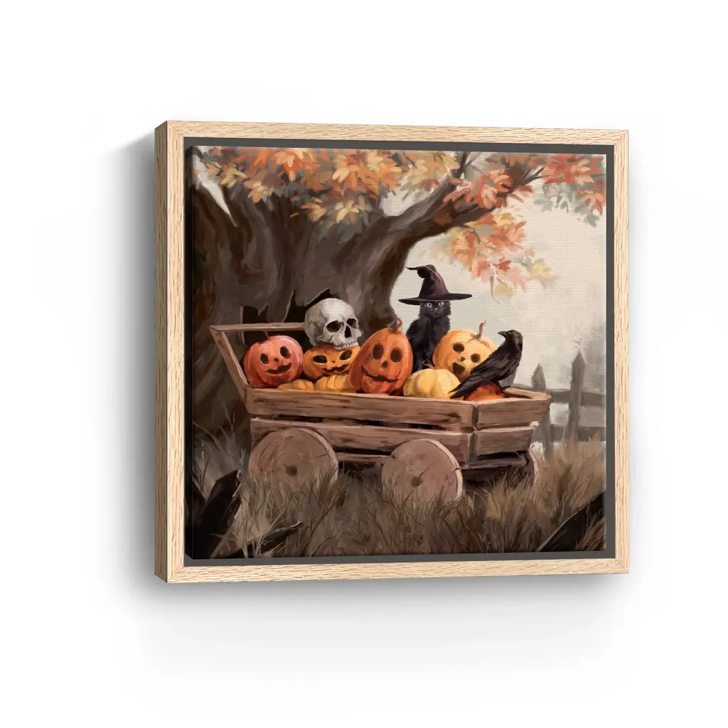 A wooden wagon brims with carved jack-o-lanterns, nestled among golden gourds and eerie accents like a skull and witchs hat. Warm tones of burnt orange, sepia, and soft gray create a cozy yet spooky autumn scene. Our Gallery Wrap Canvas Prints are proudly assembled with high quality materials in California, USA. Each piece is printed on a thick, archival grade canvas using Giclee technology. It is then hand-stretched by our experienced artisans over solid wood bars, which will not warp over time. The final product is a piece personally crafted for you to confidently display on your wall. Care and Assembly: Ensure that the location of your piece has little to no exposure to heat, sunlight, and moisture. Wipe clean, only if needed. Each piece includes hanging hardware to hang on your wall horizontally.