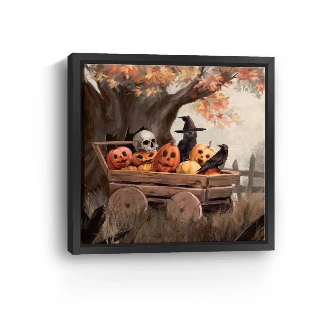 A wooden wagon brims with carved jack-o-lanterns, nestled among golden gourds and eerie accents like a skull and witchs hat. Warm tones of burnt orange, sepia, and soft gray create a cozy yet spooky autumn scene. Our Gallery Wrap Canvas Prints are proudly assembled with high quality materials in California, USA. Each piece is printed on a thick, archival grade canvas using Giclee technology. It is then hand-stretched by our experienced artisans over solid wood bars, which will not warp over time. The final product is a piece personally crafted for you to confidently display on your wall. Care and Assembly: Ensure that the location of your piece has little to no exposure to heat, sunlight, and moisture. Wipe clean, only if needed. Each piece includes hanging hardware to hang on your wall horizontally.