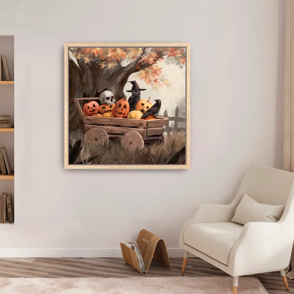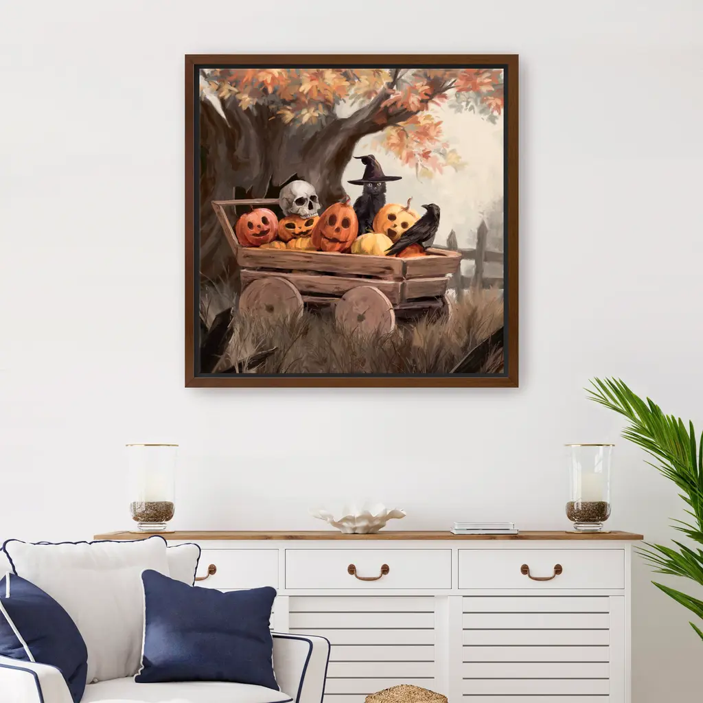 A wooden wagon brims with carved jack-o-lanterns, nestled among golden gourds and eerie accents like a skull and witchs hat. Warm tones of burnt orange, sepia, and soft gray create a cozy yet spooky autumn scene. Our Gallery Wrap Canvas Prints are proudly assembled with high quality materials in California, USA. Each piece is printed on a thick, archival grade canvas using Giclee technology. It is then hand-stretched by our experienced artisans over solid wood bars, which will not warp over time. The final product is a piece personally crafted for you to confidently display on your wall. Care and Assembly: Ensure that the location of your piece has little to no exposure to heat, sunlight, and moisture. Wipe clean, only if needed. Each piece includes hanging hardware to hang on your wall horizontally.