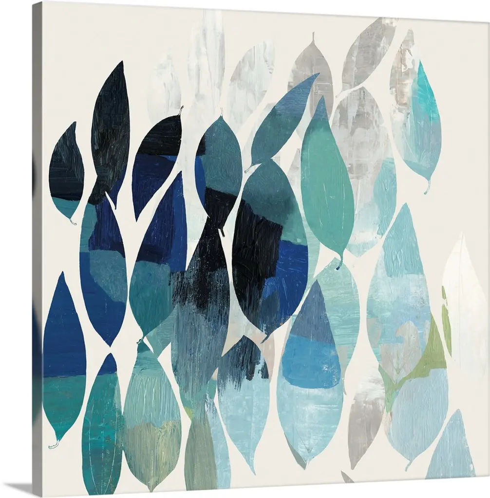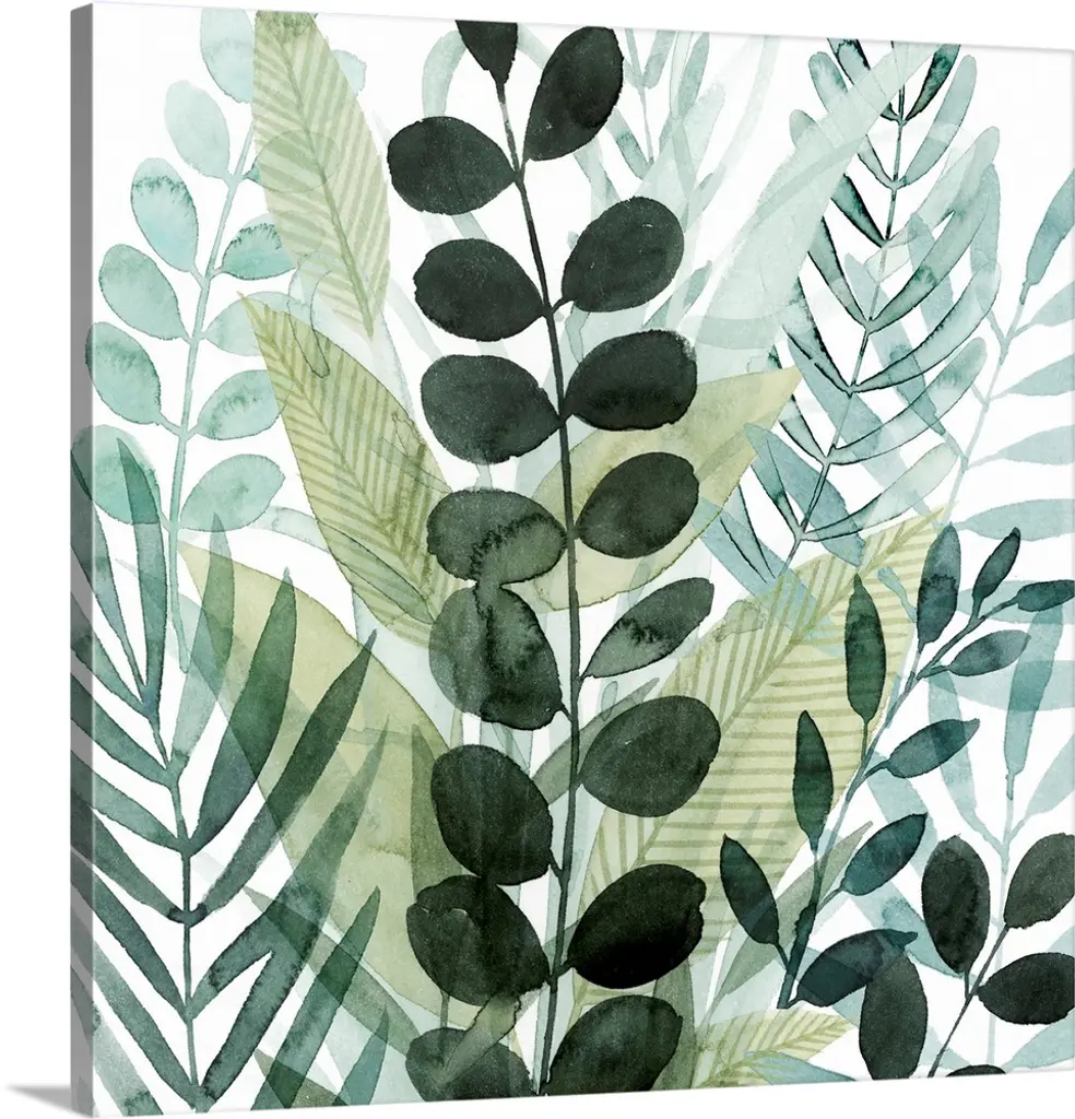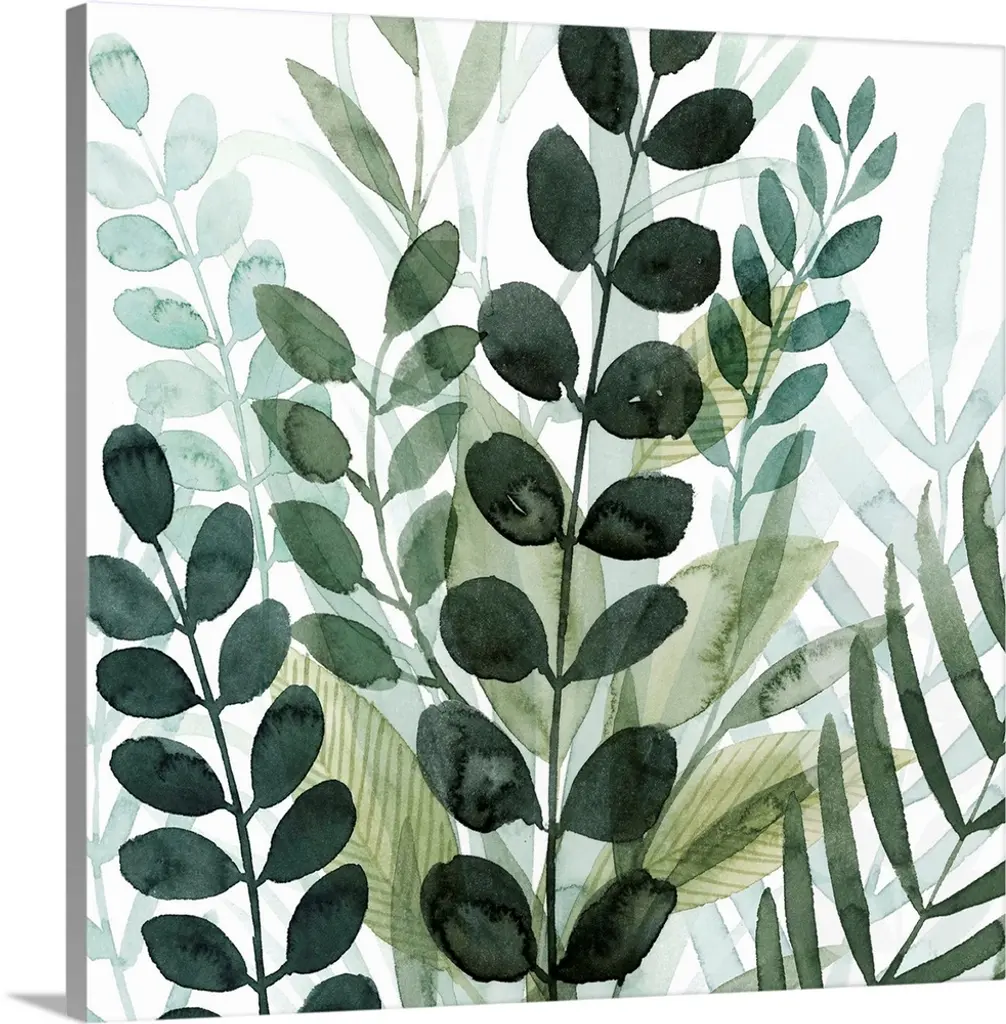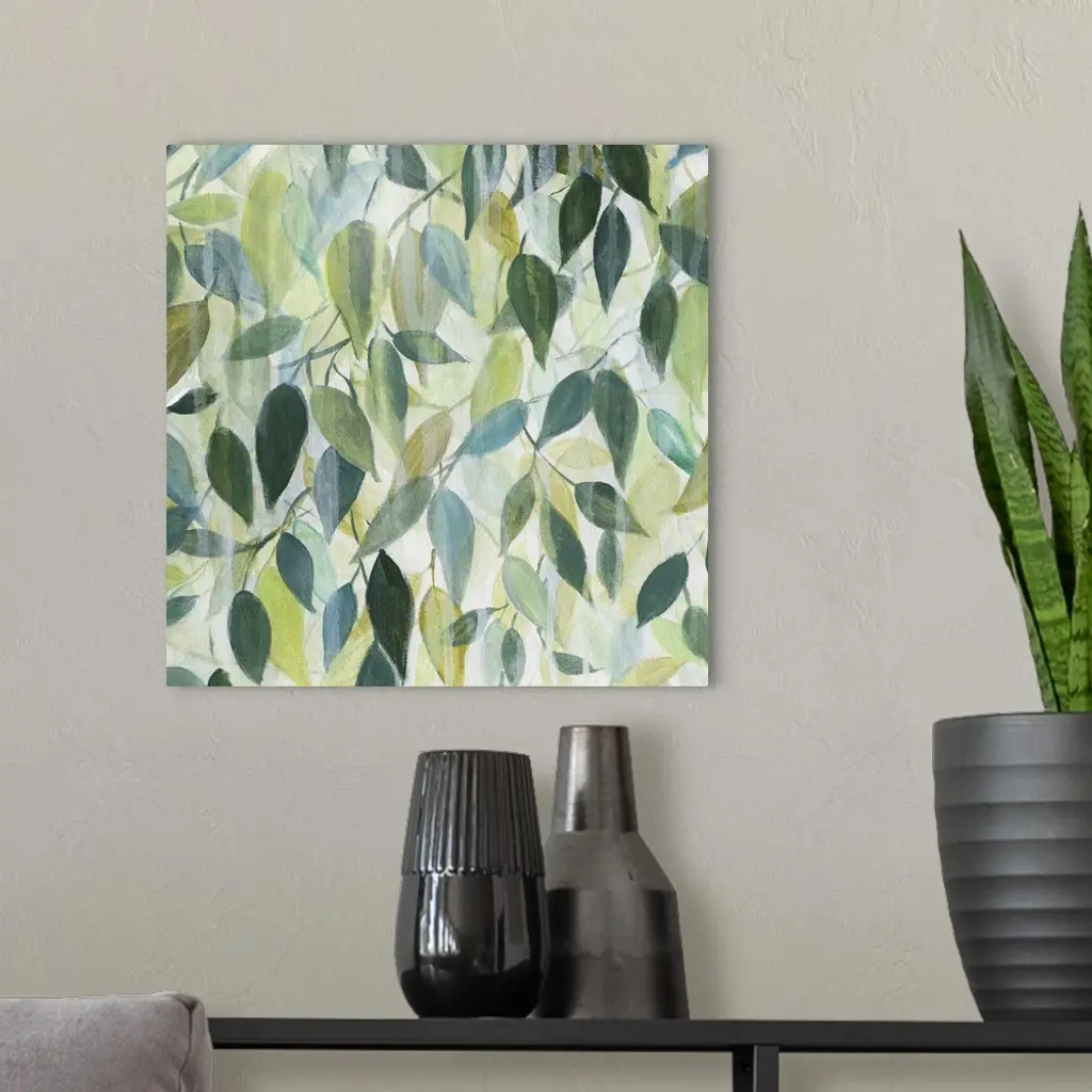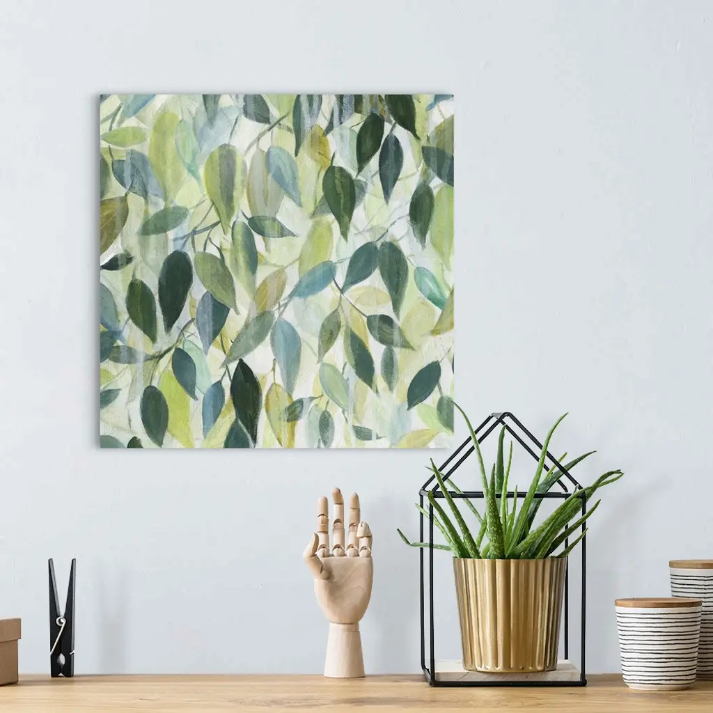 Contemporary square painting of leaves in different shades of green with faint drips of rain on top.