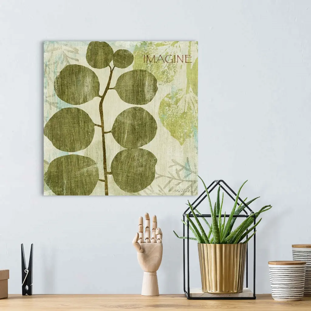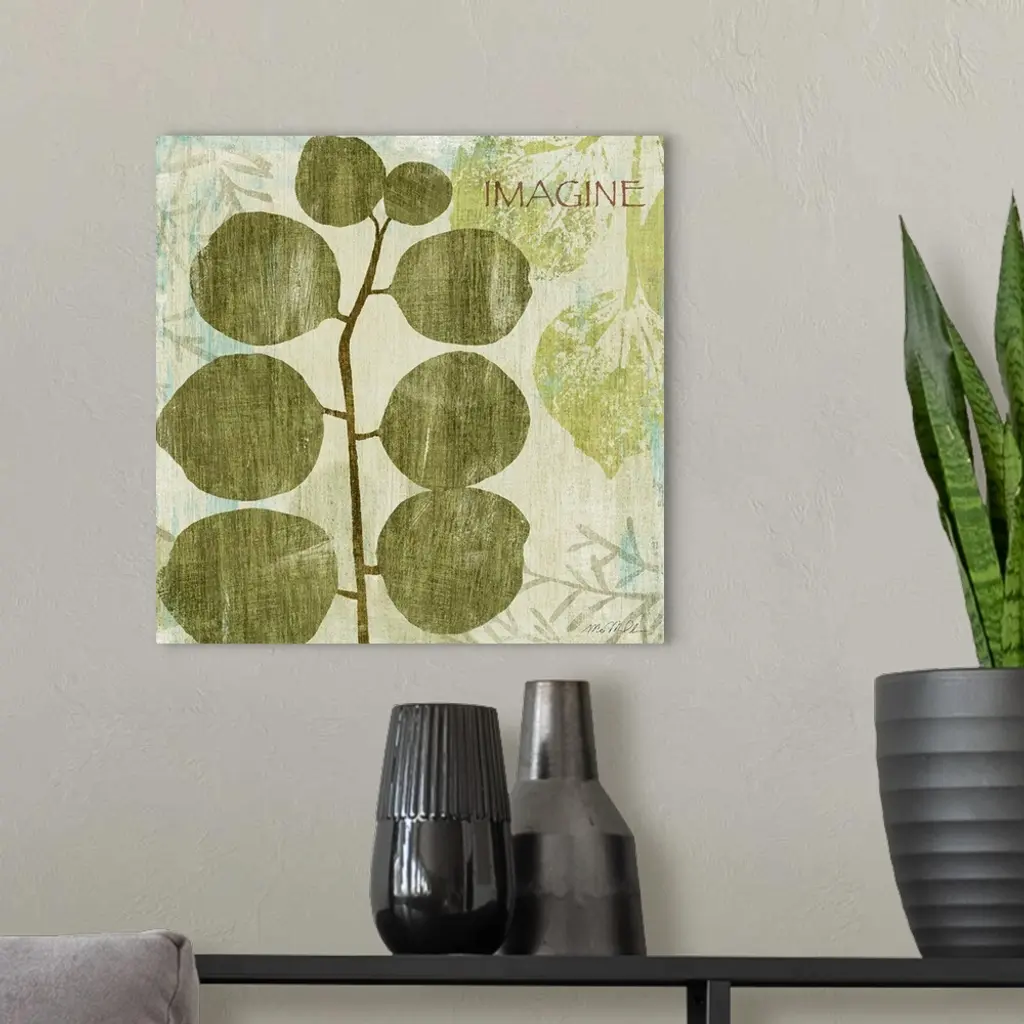 Square painting on canvas of the stenciled print of a plant on top of other faded stencil marks.