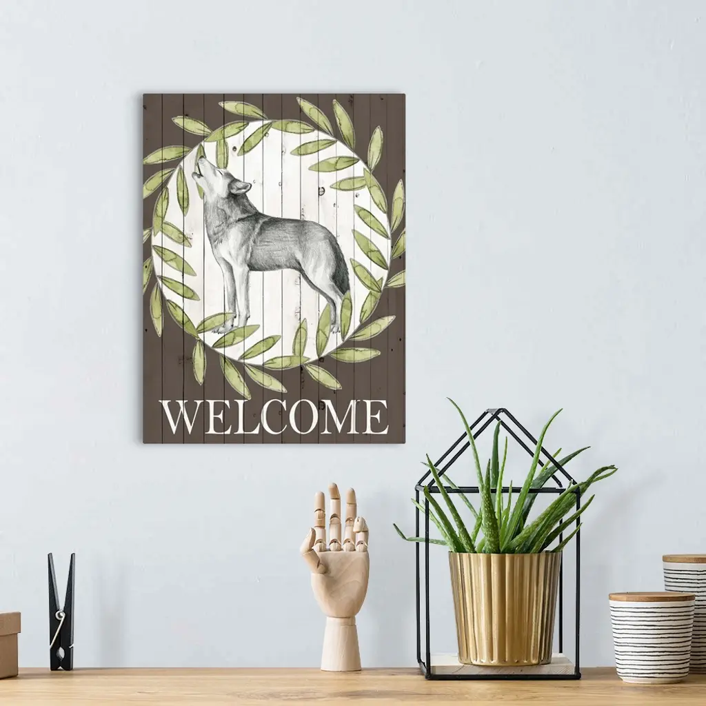 Cabin style artwork on a brown wood paneled background of a sketched wolf inside of a green wreath and "Welcome" written across the bottom.
