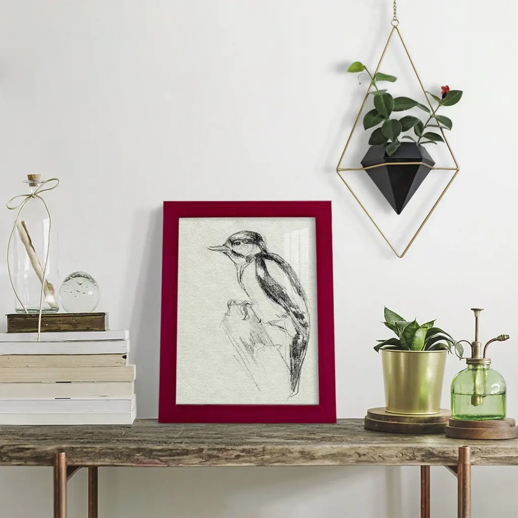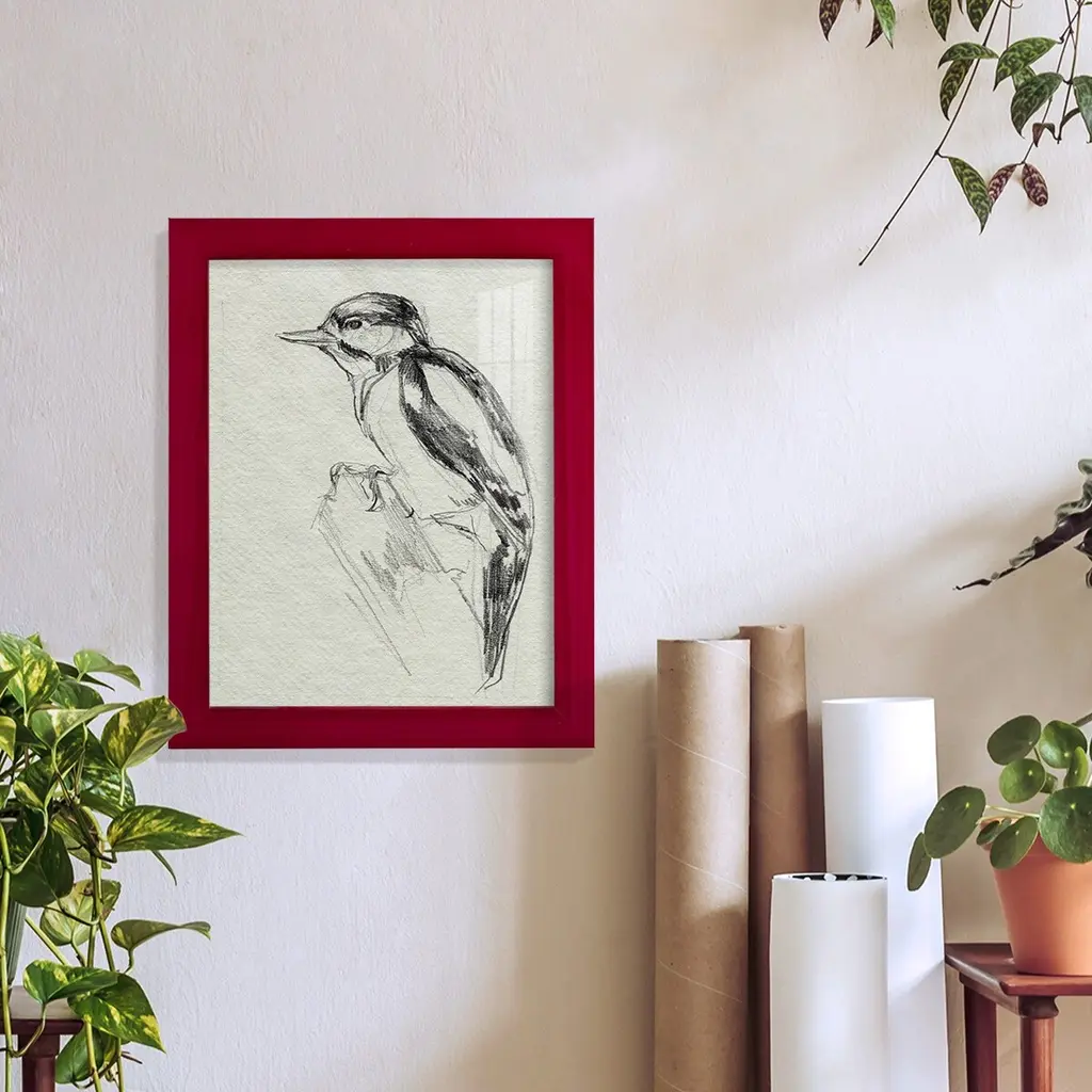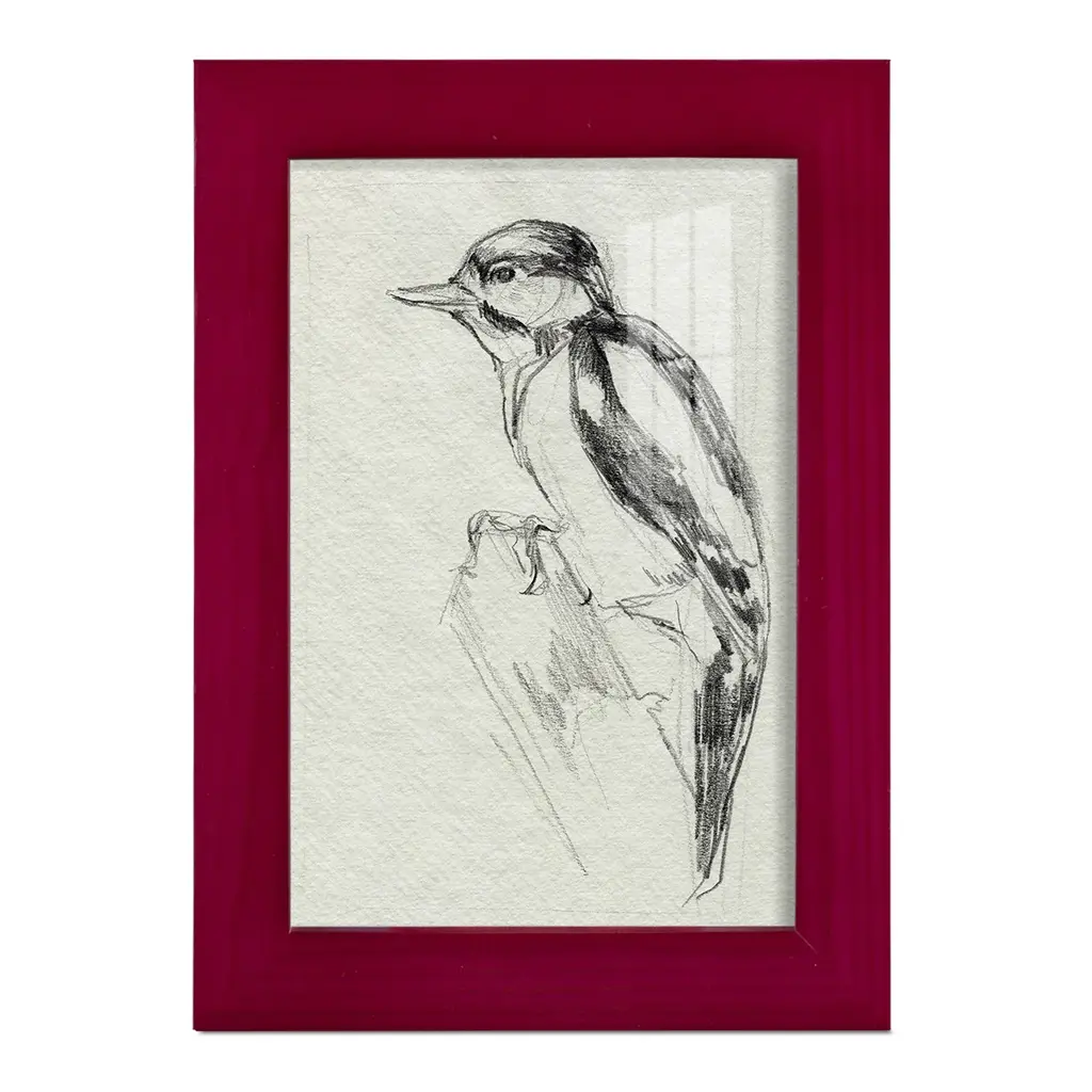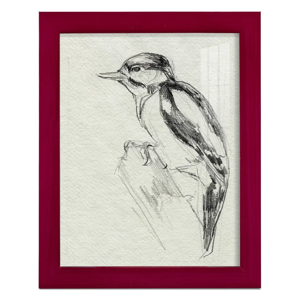 Woodpecker Sketch I -EZ SWITCH Framed Print w/glass-Cherry Red A delightful, framed print. Featuring a solid wood frame with real wood glass. This premium print is giclee quality. In addition, every frame features a removable back and table top stand. This allows you to change your art in the future or to just stand the art on a table for a new look. We are sure you'll enjoy our new series of EZ SWITCH Framed Art. Solid Wood Frame Real Glass Removable / Replaceable Art Built in Tabletop Stand Sizes range from 4x6 up to 12x15 - buy just one or pair them up as sets as you see fit.