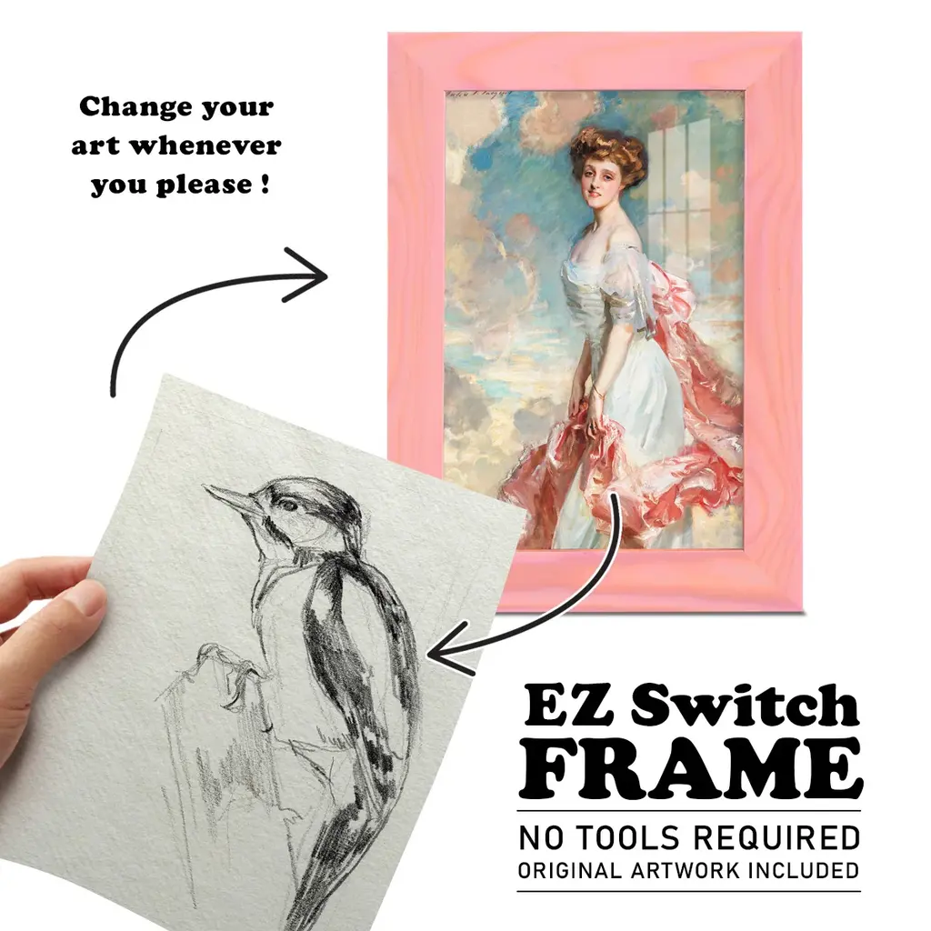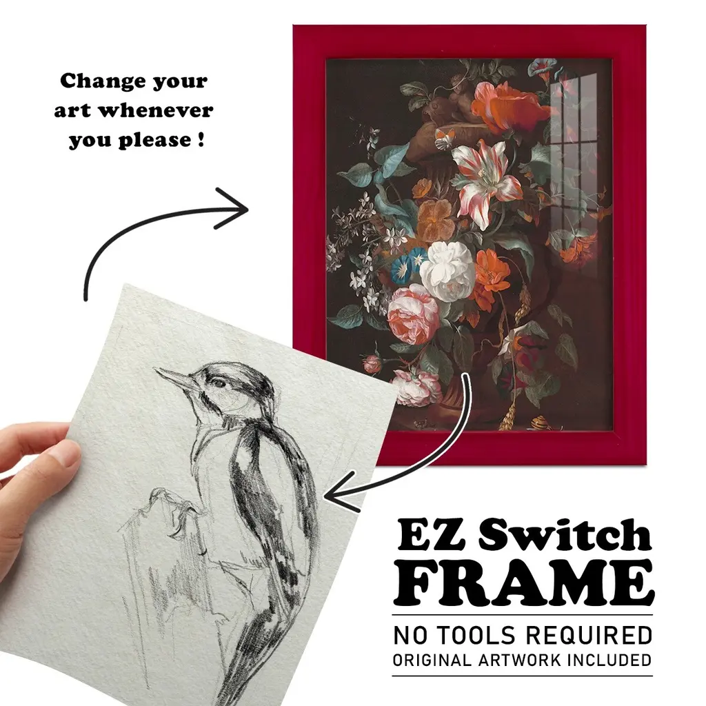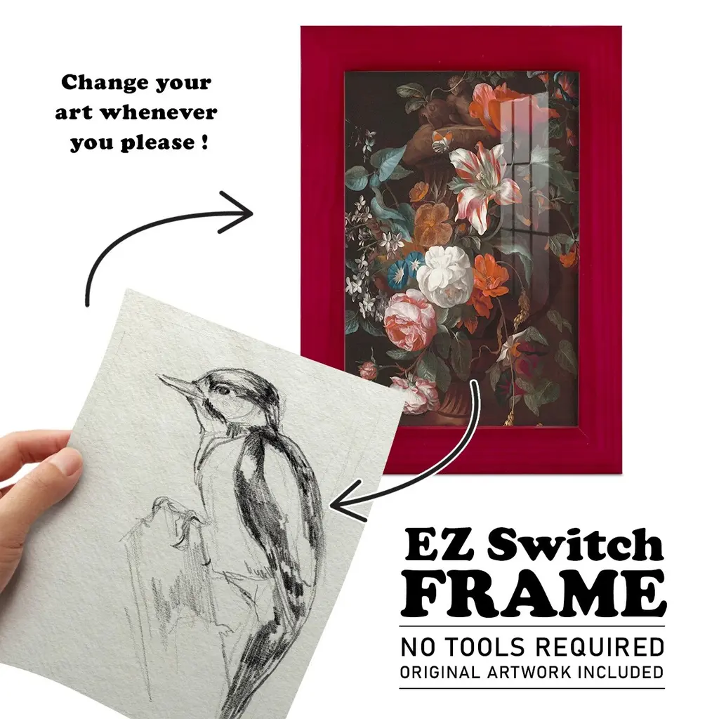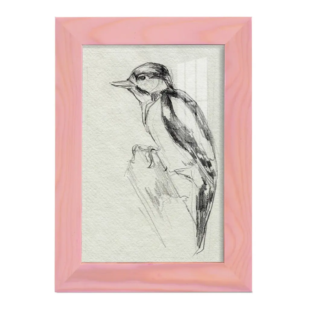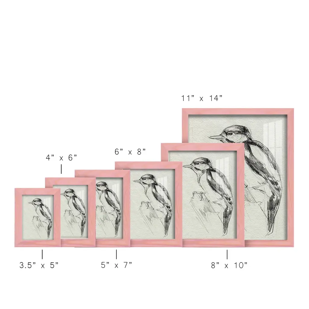 Woodpecker Sketch I -EZ SWITCH Framed Print w/glass-Cherry Red A delightful, framed print. Featuring a solid wood frame with real wood glass. This premium print is giclee quality. In addition, every frame features a removable back and table top stand. This allows you to change your art in the future or to just stand the art on a table for a new look. We are sure you'll enjoy our new series of EZ SWITCH Framed Art. Solid Wood Frame Real Glass Removable / Replaceable Art Built in Tabletop Stand Sizes range from 4x6 up to 12x15 - buy just one or pair them up as sets as you see fit.