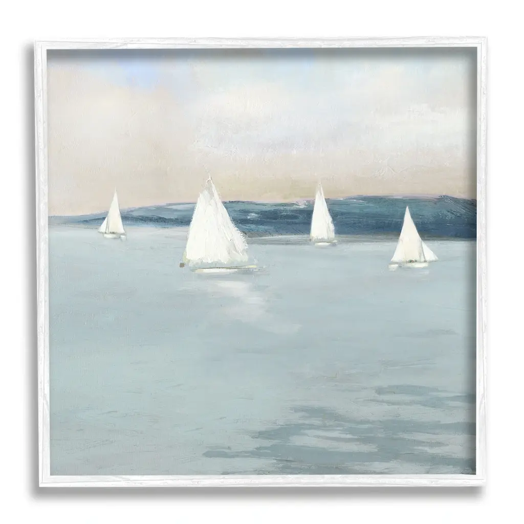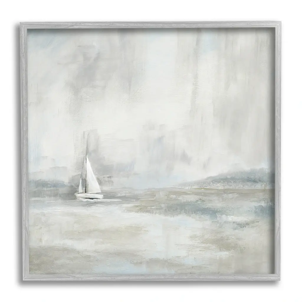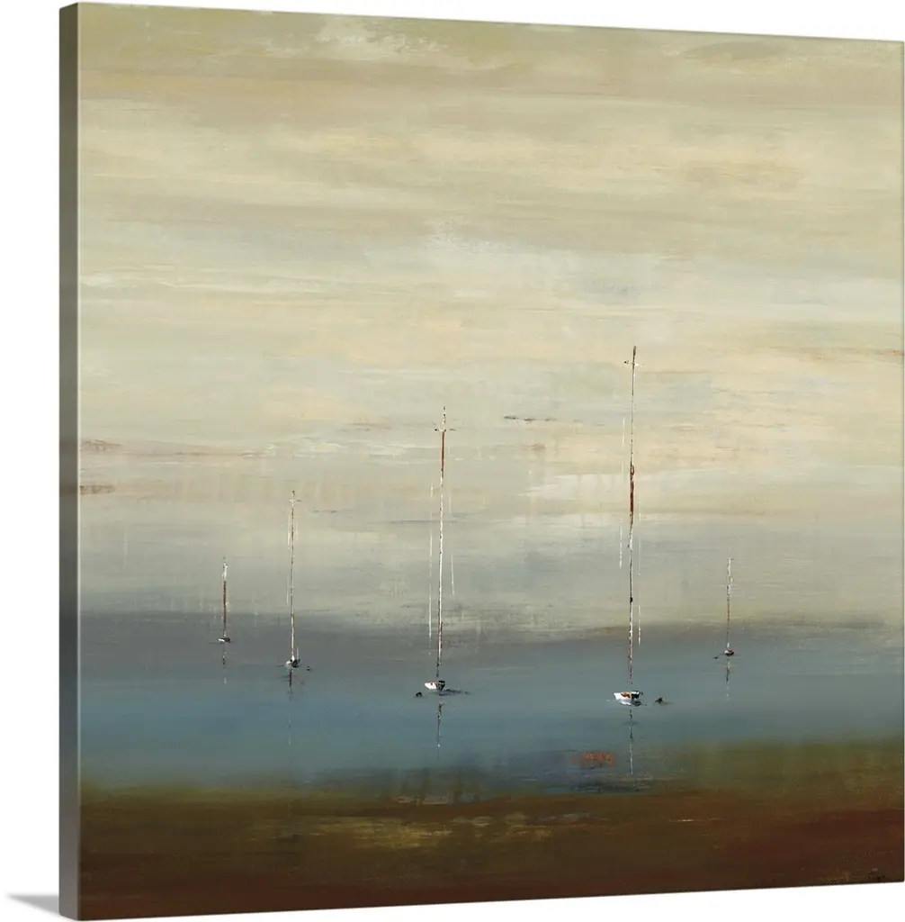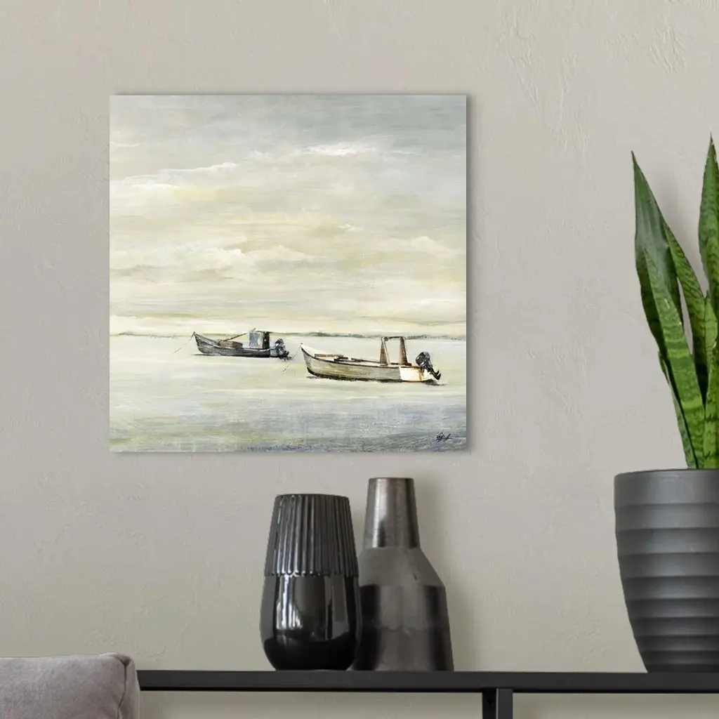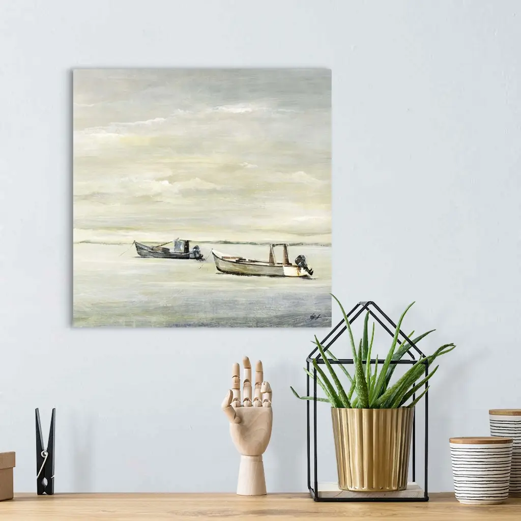 Painting of two small fishing boats sitting in calm water beneath a cloudy grey sky.