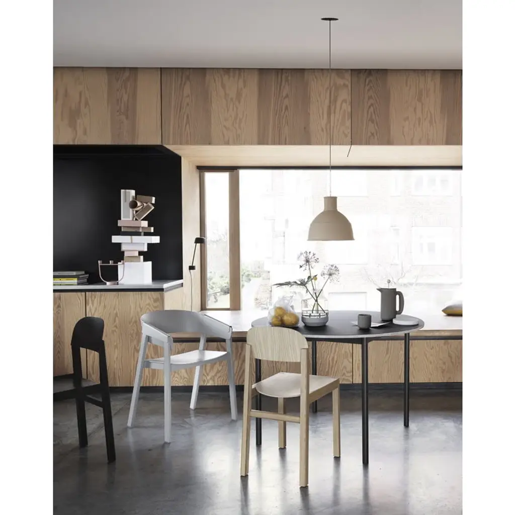 The Workshop chair, designed by Cecilie Manz for Muuto, is a charming combination of traditional craftsmanship, contemporary design and beautiful details. The name Workshop refers to the design process that took place at Manz’s Copenhagen studio: sketches were transformed into full-scale models over the course of only a few weeks. The chair has a round veneer back that creates a pleasant contrast with the sturdy, solid wood frame and its sharp edges. Workshop makes a great dining chair for both domestic and public environments. In 2020 Muuto changed the chairs’ finish to a more environmentally-friendly, water-based lacquer. Please note that, as a result, the hue of the chairs is slightly different than before.
