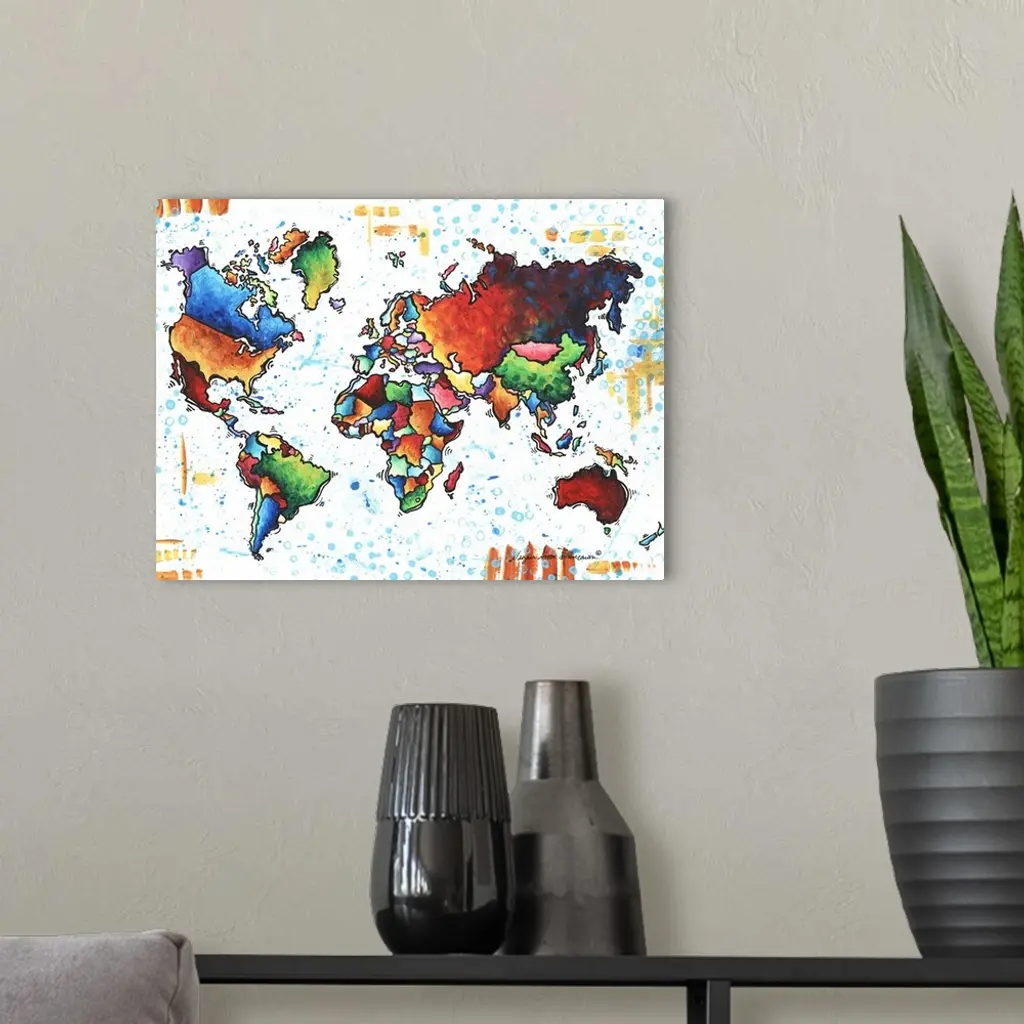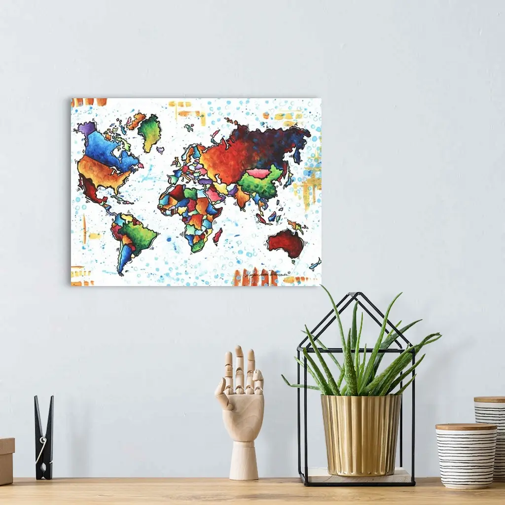 Contemporary painting of a colorful world map against a white background.