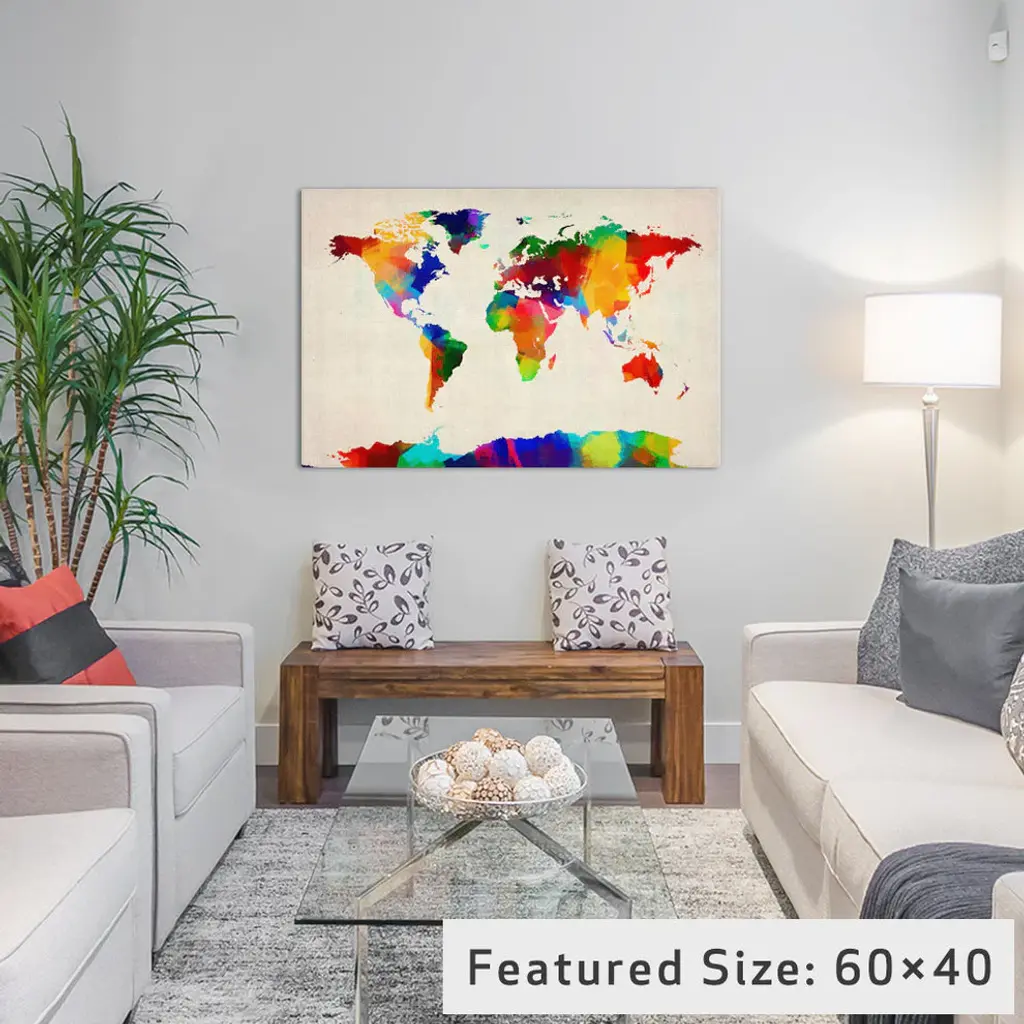 The World Map in Great Colors canvas art print is sure to make an impression on anyone who sees it. This artwork is gallery wrapped around a 1-inch solid wood frame and arrives carefully packaged and entirely ready to hang on the wall. Design Art only uses the highest resolution and pigments to ensure a crisp colorful print that is never faded or pixelated. This artwork is sure to be a conversation starter in any home or office.