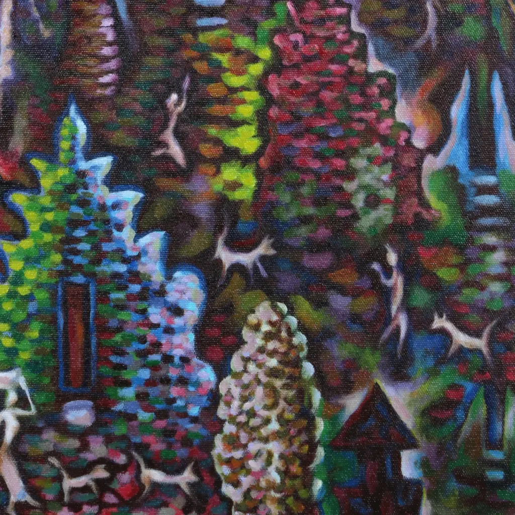 "A painter has a very abstract option of beauty to describe achieving peace. Beauty is infinite in this world full of peace with love for God, family, and the environment. By respecting others and caring for each other, this world will become beautiful and peaceful. If not us, who else can begin to create peace?" says Nyoman Tomblos."Starting in nature, peace finds its way to every corner of the globe, to every human and every animal." The Balinese artist creates an expressionist composition within the realm of the pointillist style. Every detail is created with vibrant colors. This painting suggests that all peace on Earth originates from the three main Hindu gods of Bali. Titled "Khayangan Tiga Temple," which means "The Three Main Temples."
