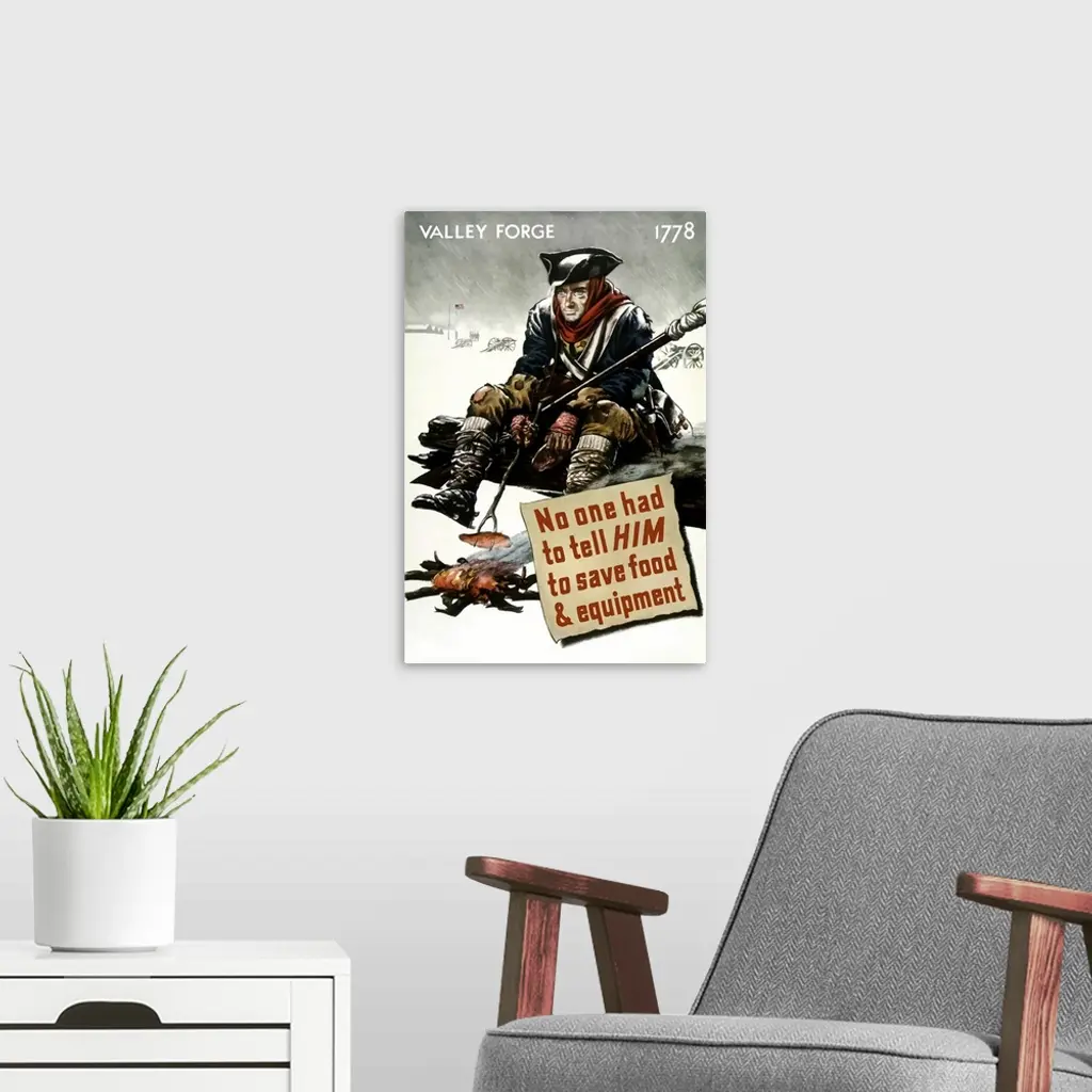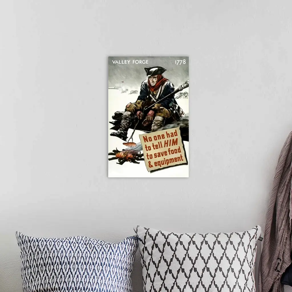 Vintage World War II poster featuring a Revolutionary War soldier cooking over a fire at Valley Forge during a snowstorm. It reads, Valley Forge 1778, No one had to tell him to save food