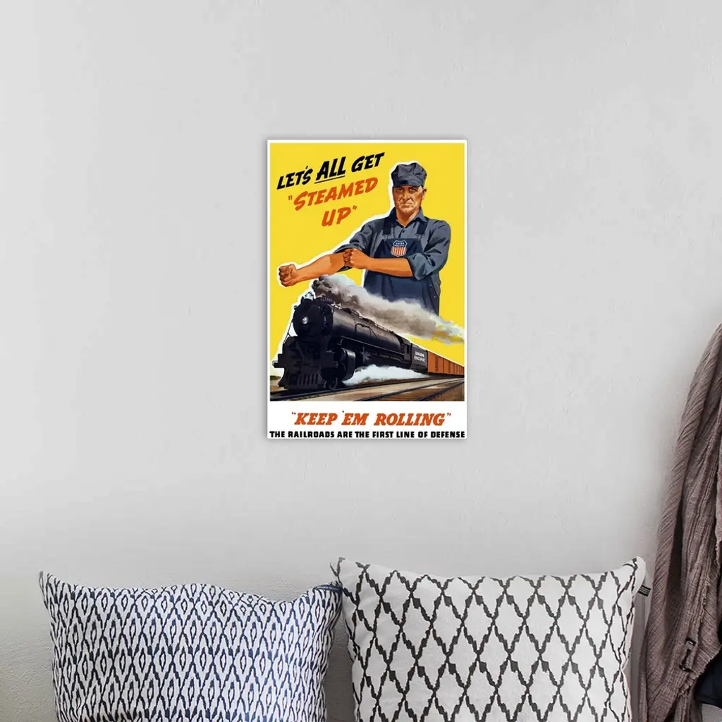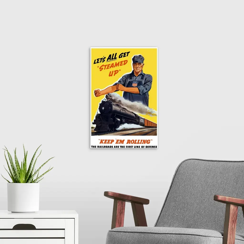 Vintage World War II poster of a train engineer rolling up his sleeves and a locomotive steaming down the track. It reads, Let's all get steamed up, keep 'em rolling, the railroads are the first line of defense.