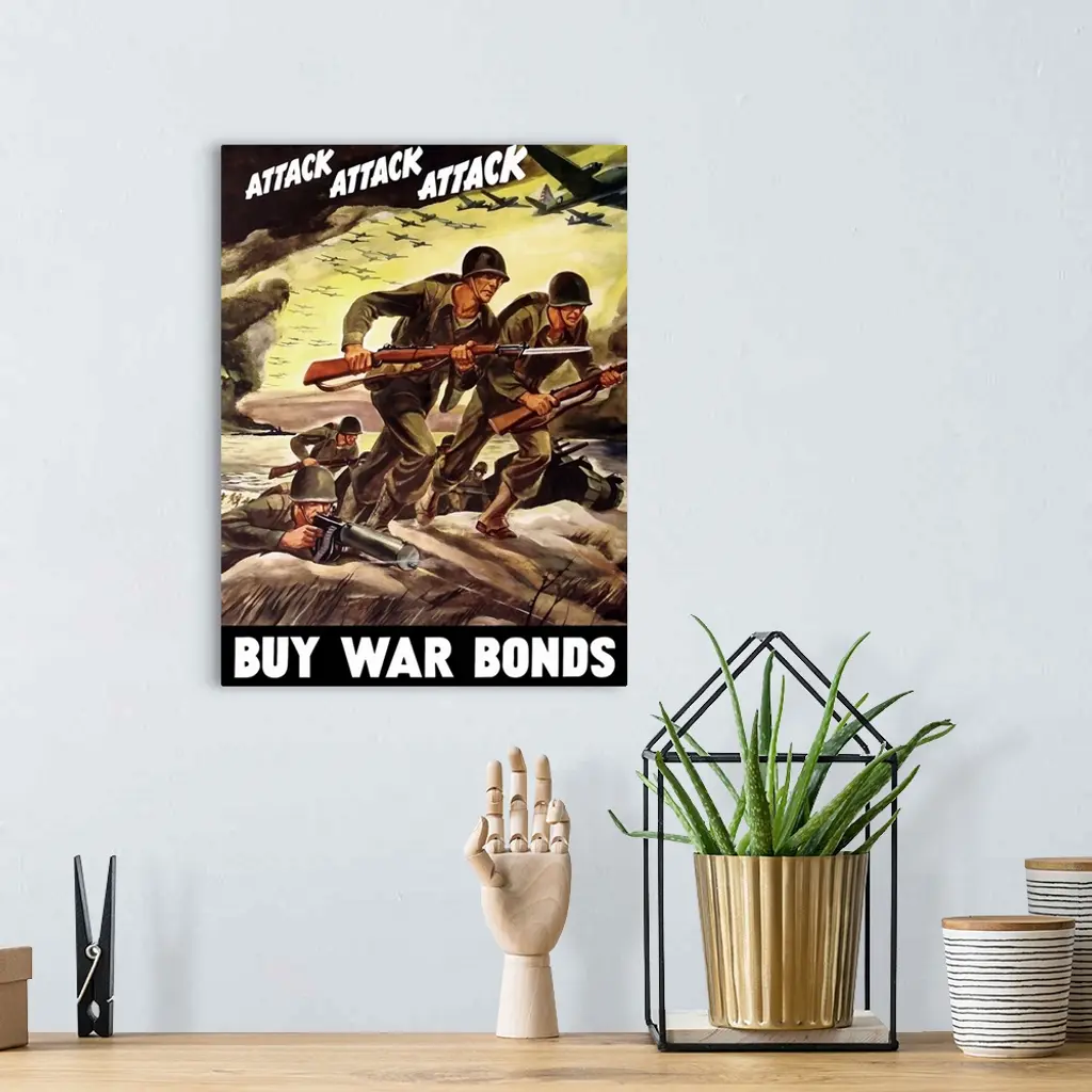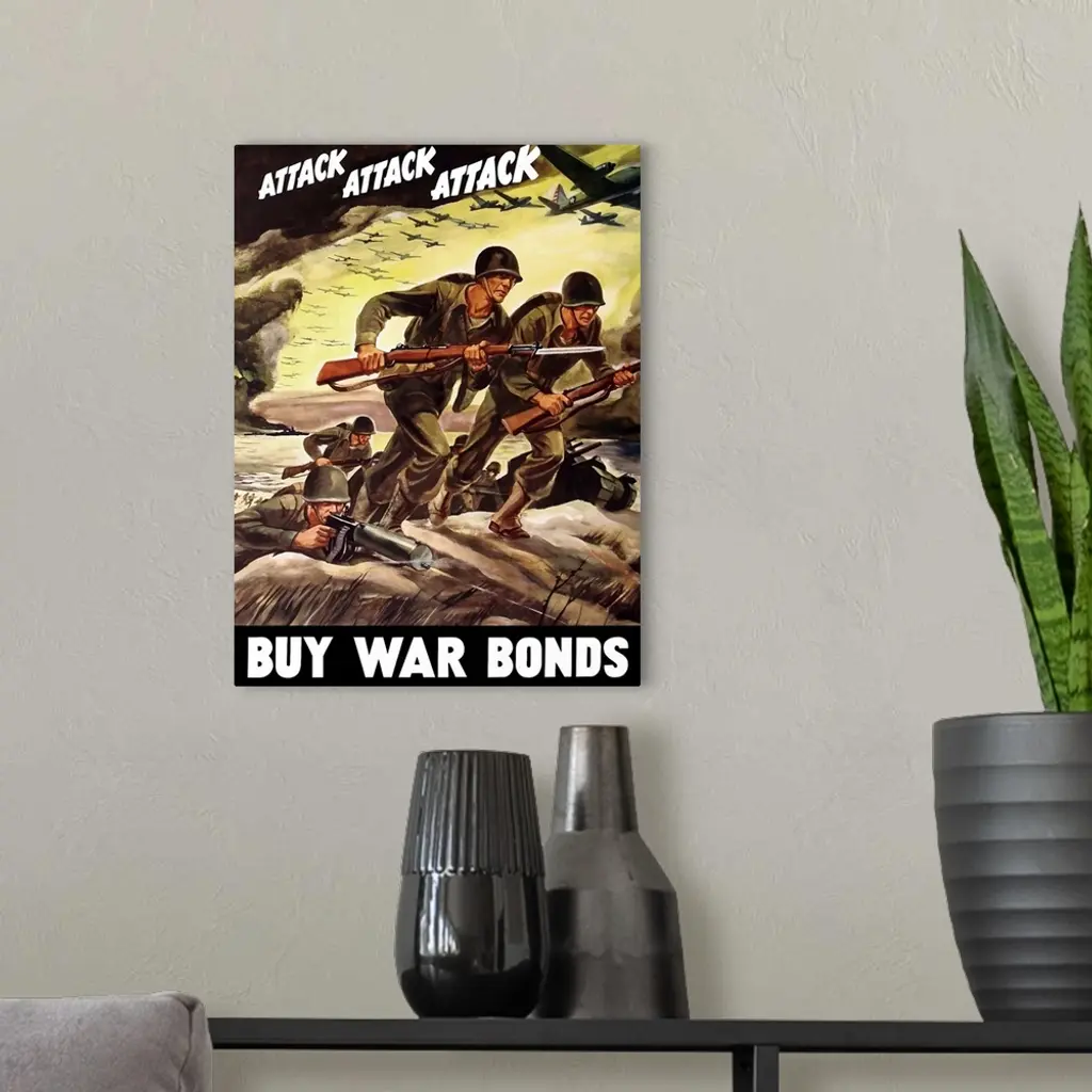Vintage World War II propaganda poster featuring soldiers assaulting a beach with rifles, and bombers flying through the sky. It reads, Attack Attack Attack Buy War Bonds.