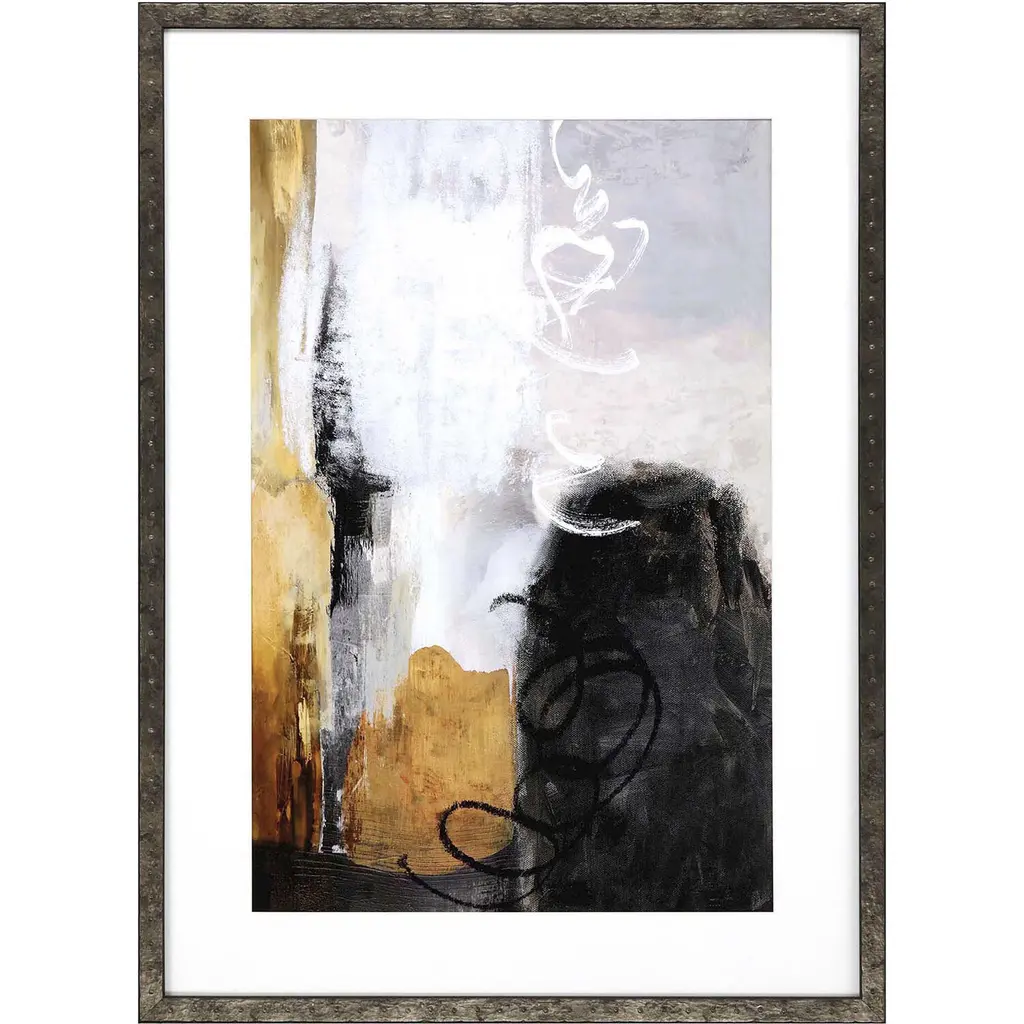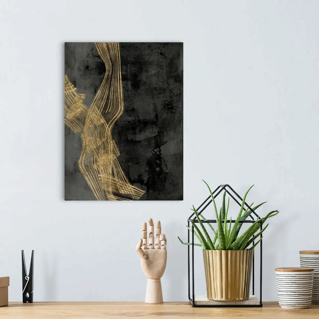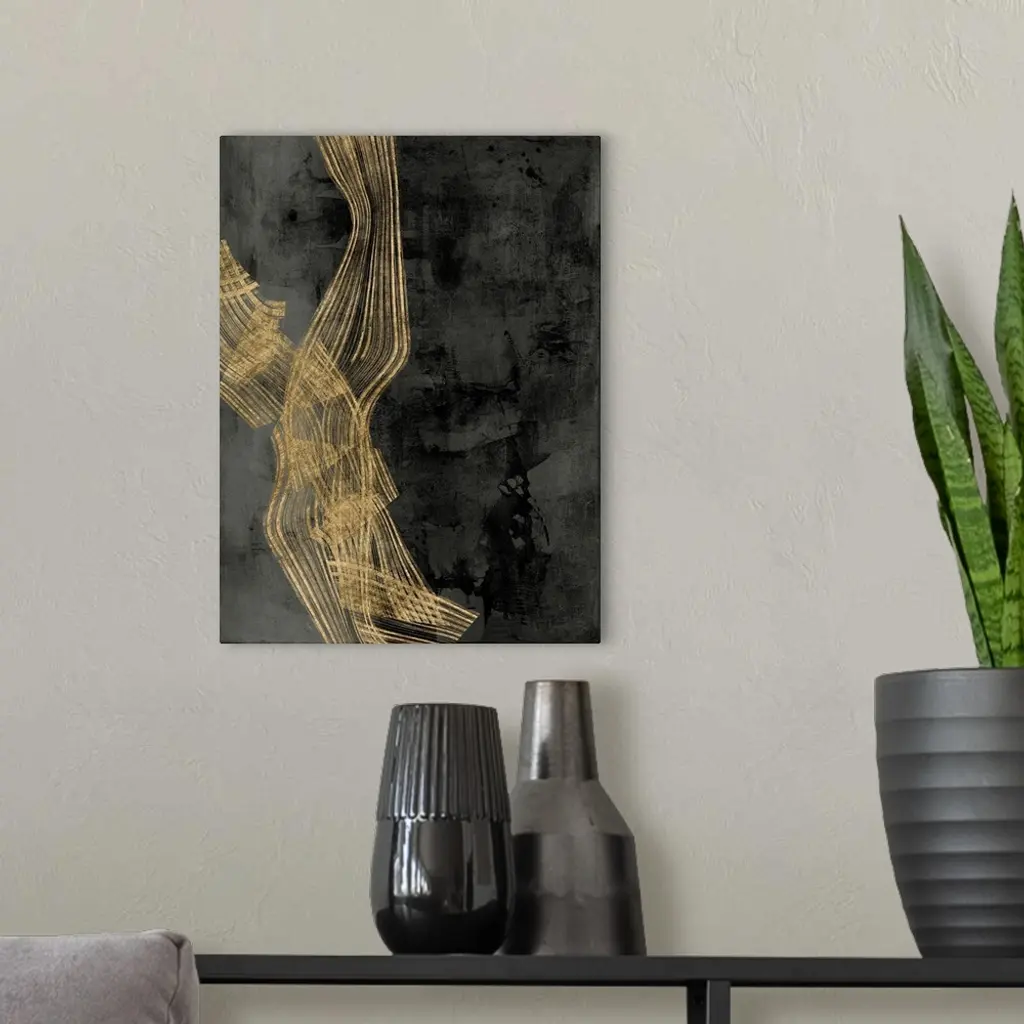 Abstract contemporary artwork with gold wavy lines crossing through dark grey.