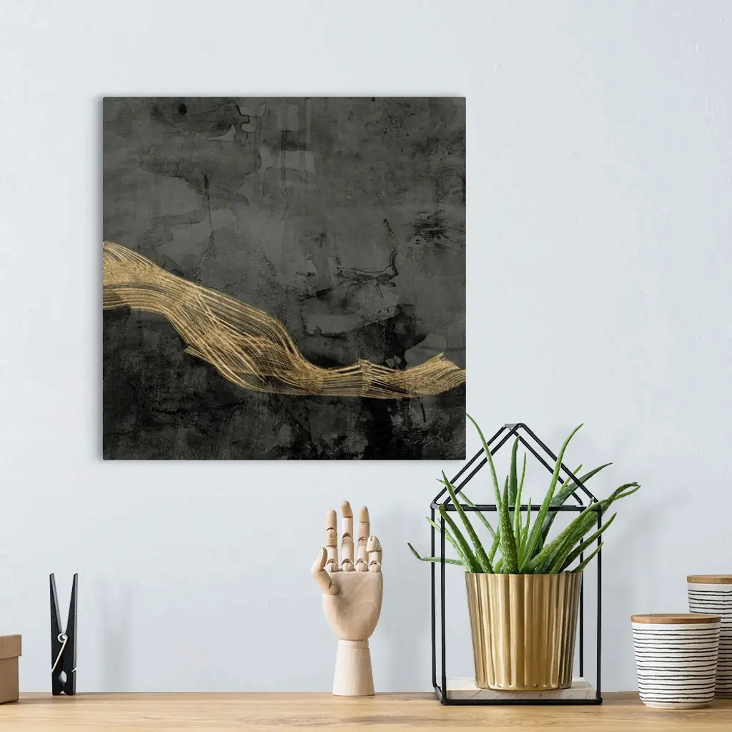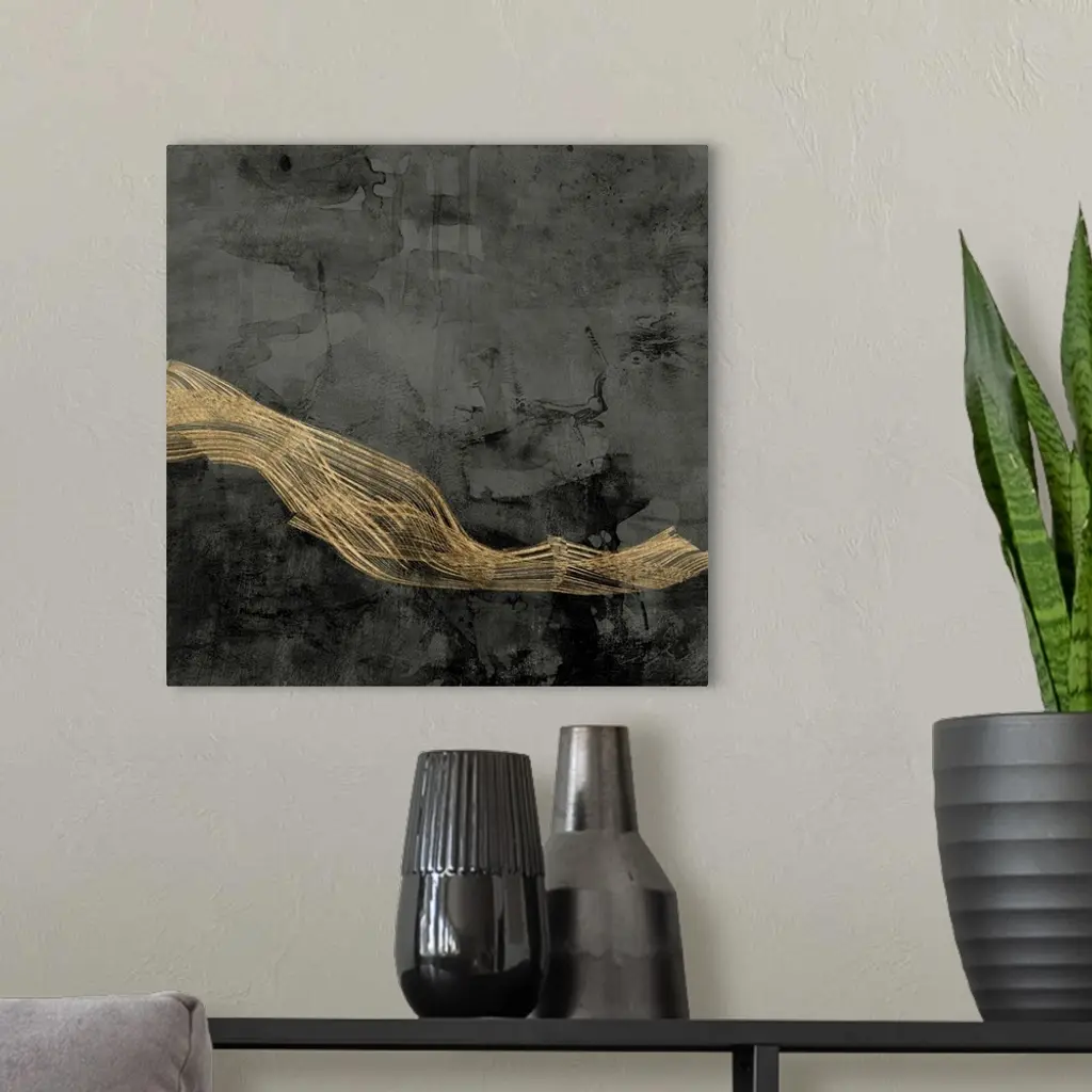 Abstract contemporary artwork with gold wavy lines crossing through dark grey.