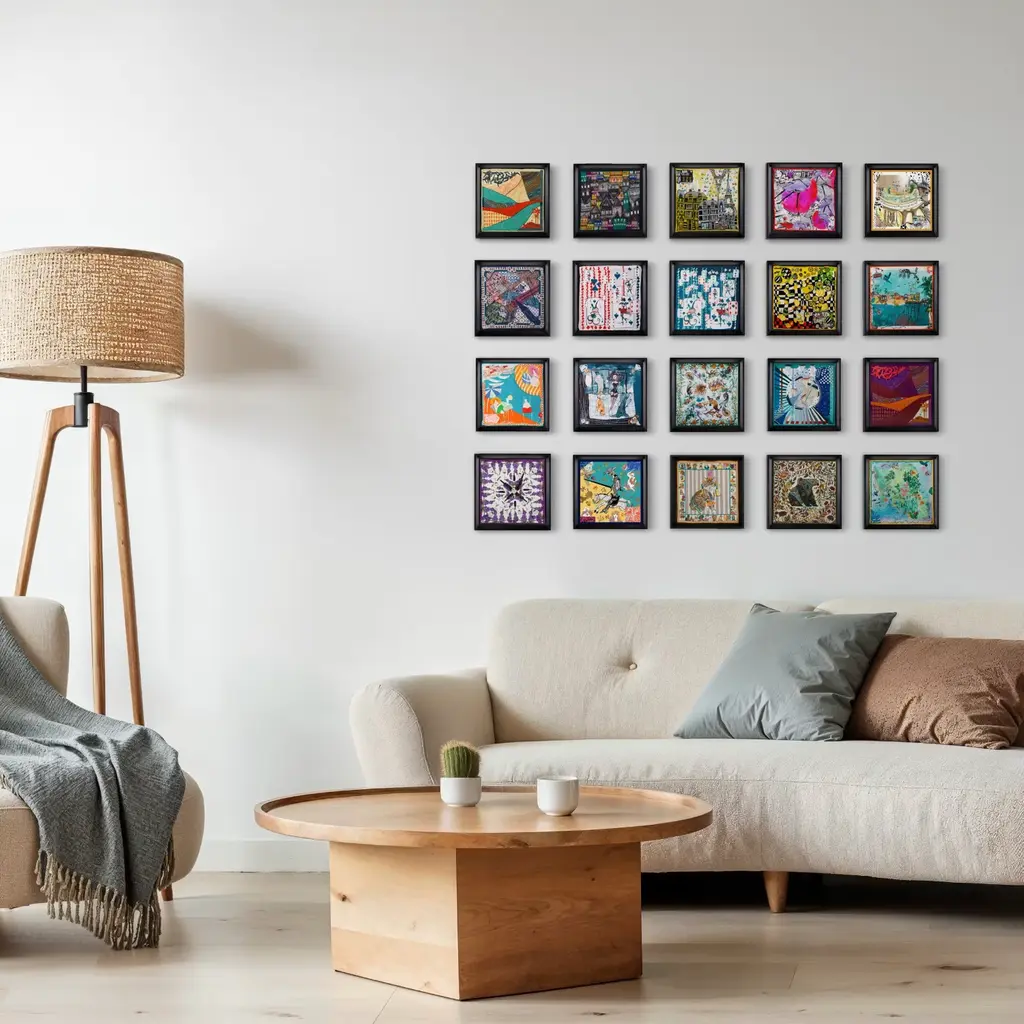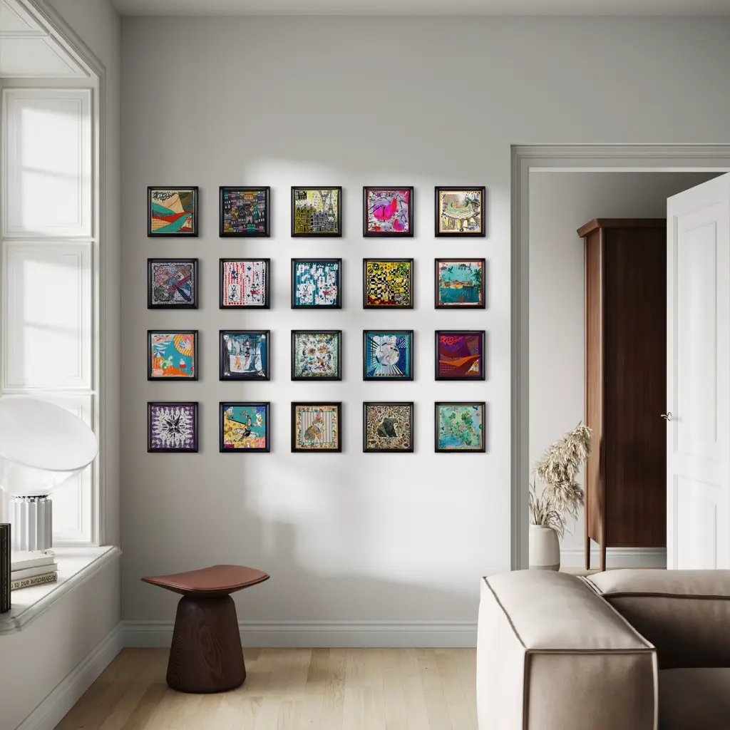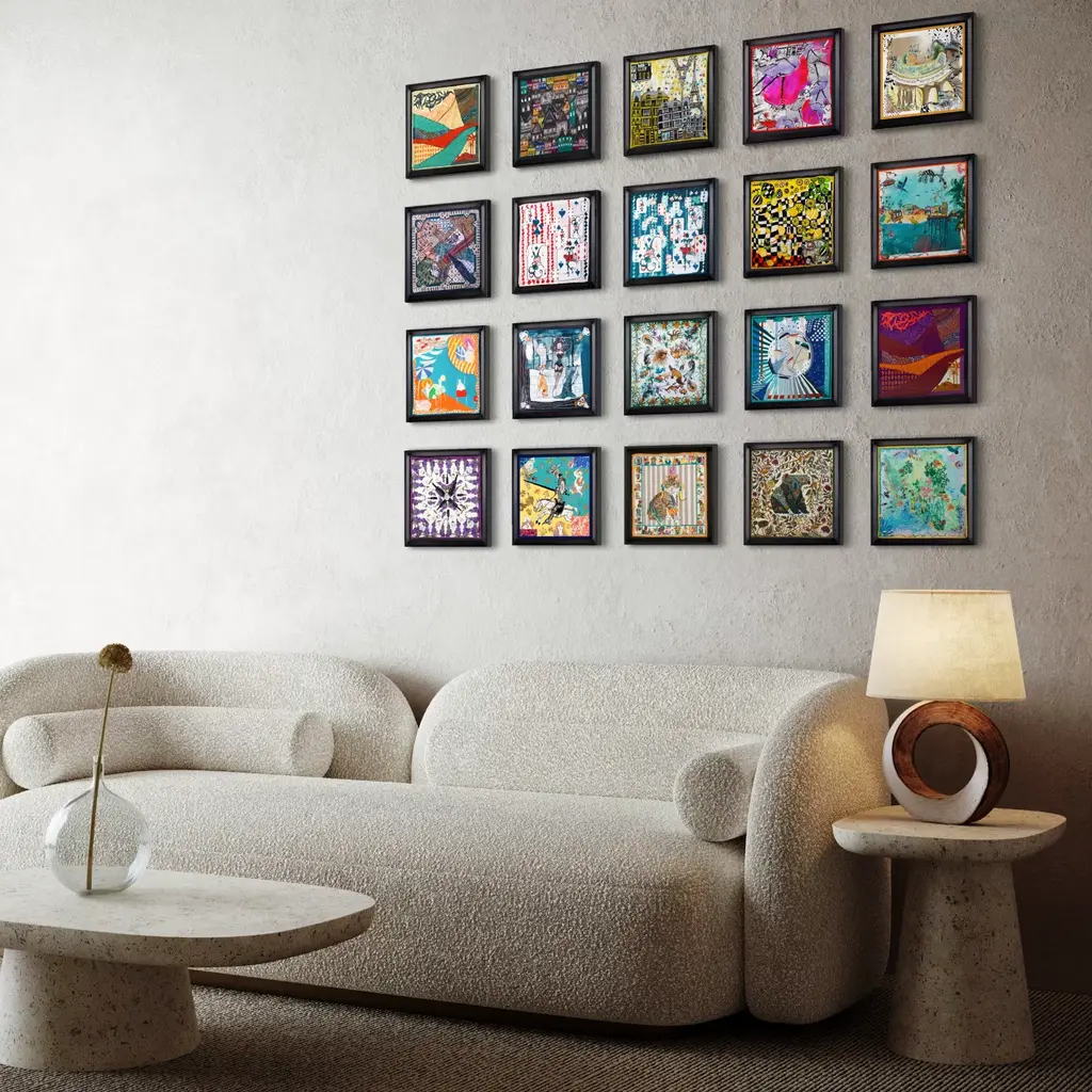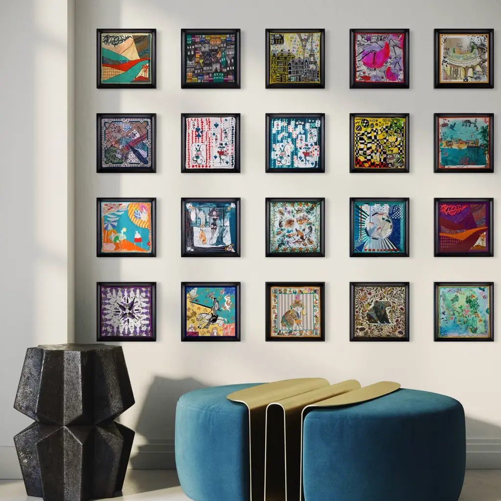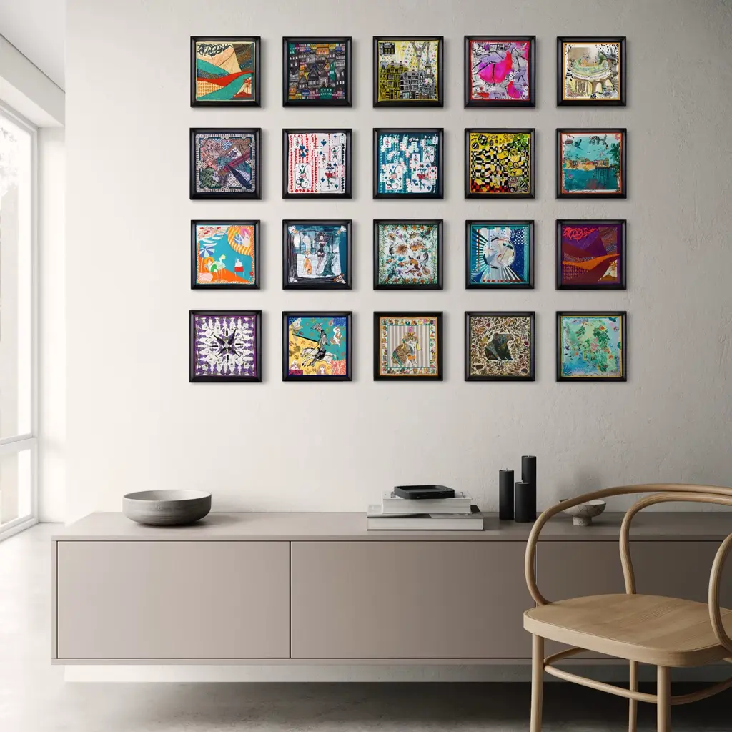 The dimensions of the artwork shown in the photo reflect the actual size.Material: 100% silk interior, 100% ayous wood frame.Set: Consists of 20 pieces.Dimensions: Each piece measures 24x24 cm.Wall Coverage: Approximately 120 cm x 120 cm when all 20 pieces are hung.Details: Hand-stitched edges on scarves.Design Story: The collection features iconic landmarks, cultures, and histories from around the world, including the Colosseum in Rome, the Colorful Houses of Alsace, the beaches of Hawaii, St. Tropez, the love locks of Paris, the Moulin Rouge woman, Sophia Loren and her dog, Las Vegas, Bordeaux wines, Limoncello, the Venice Carnival, the Amalfi Coast, Australian koala and more..