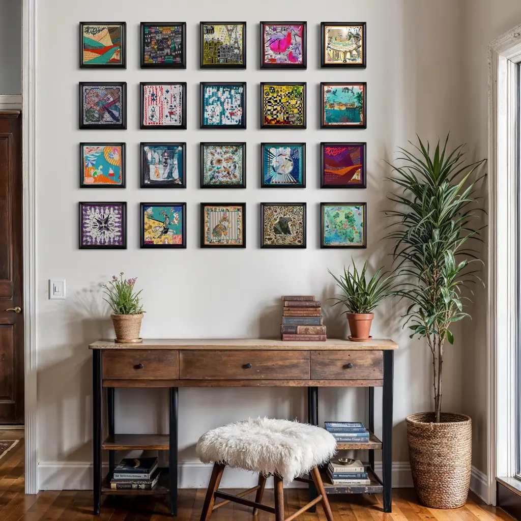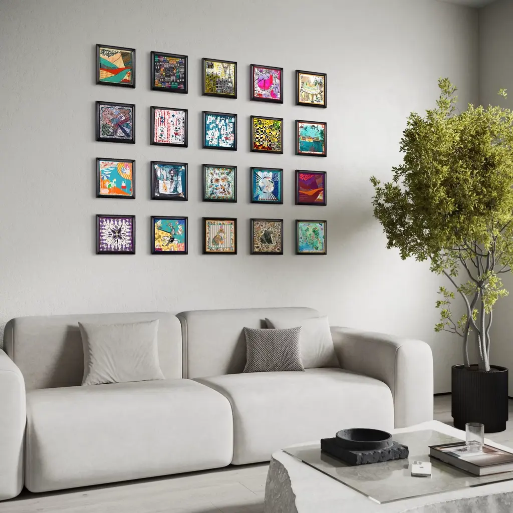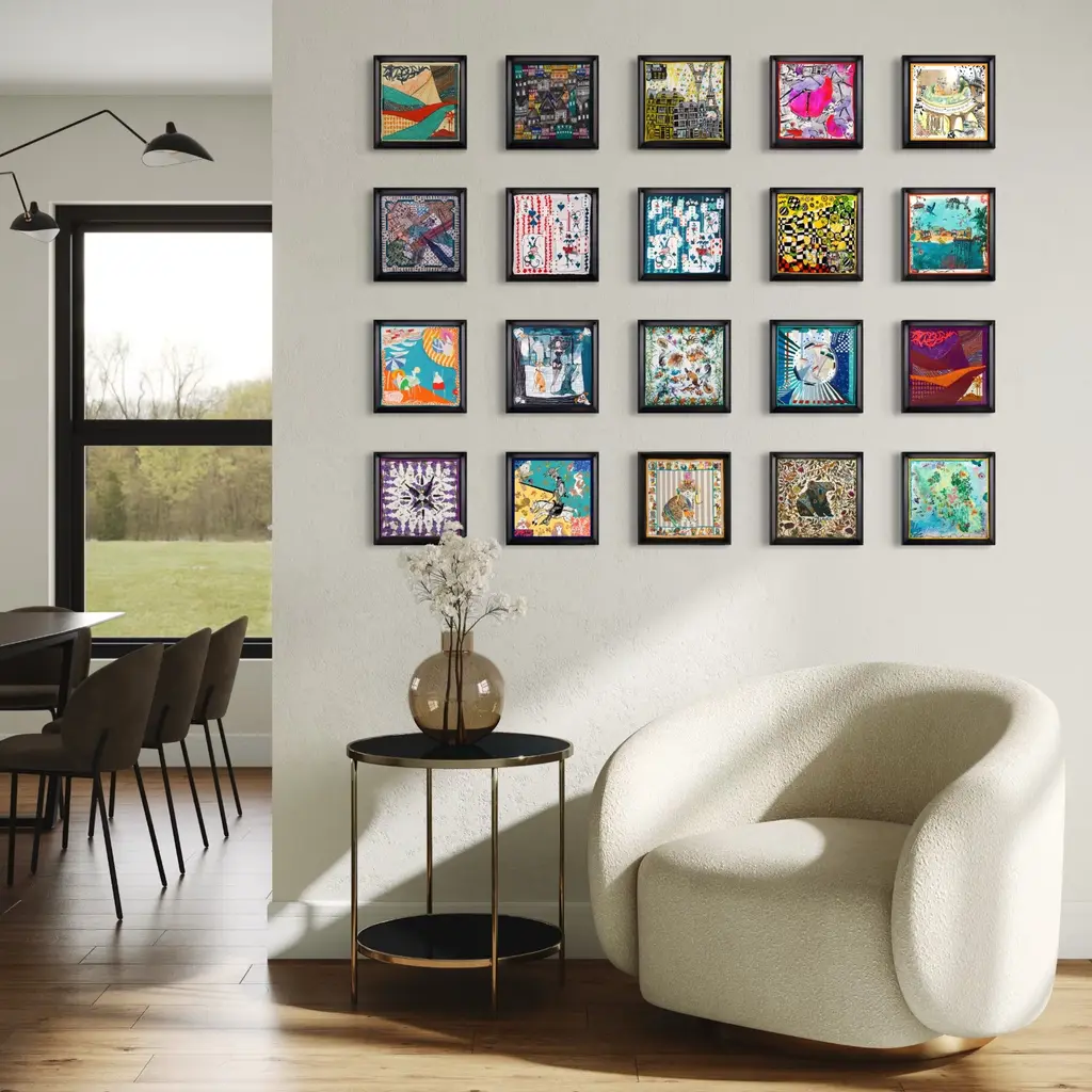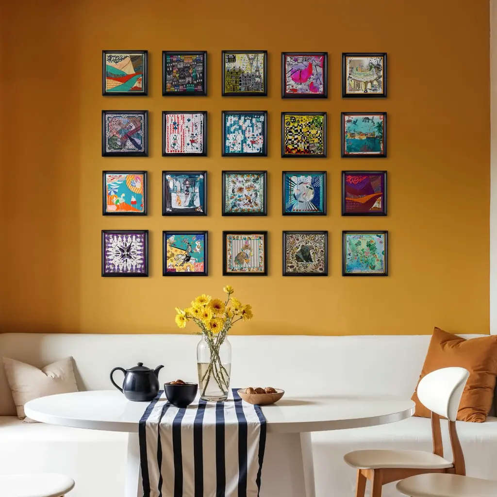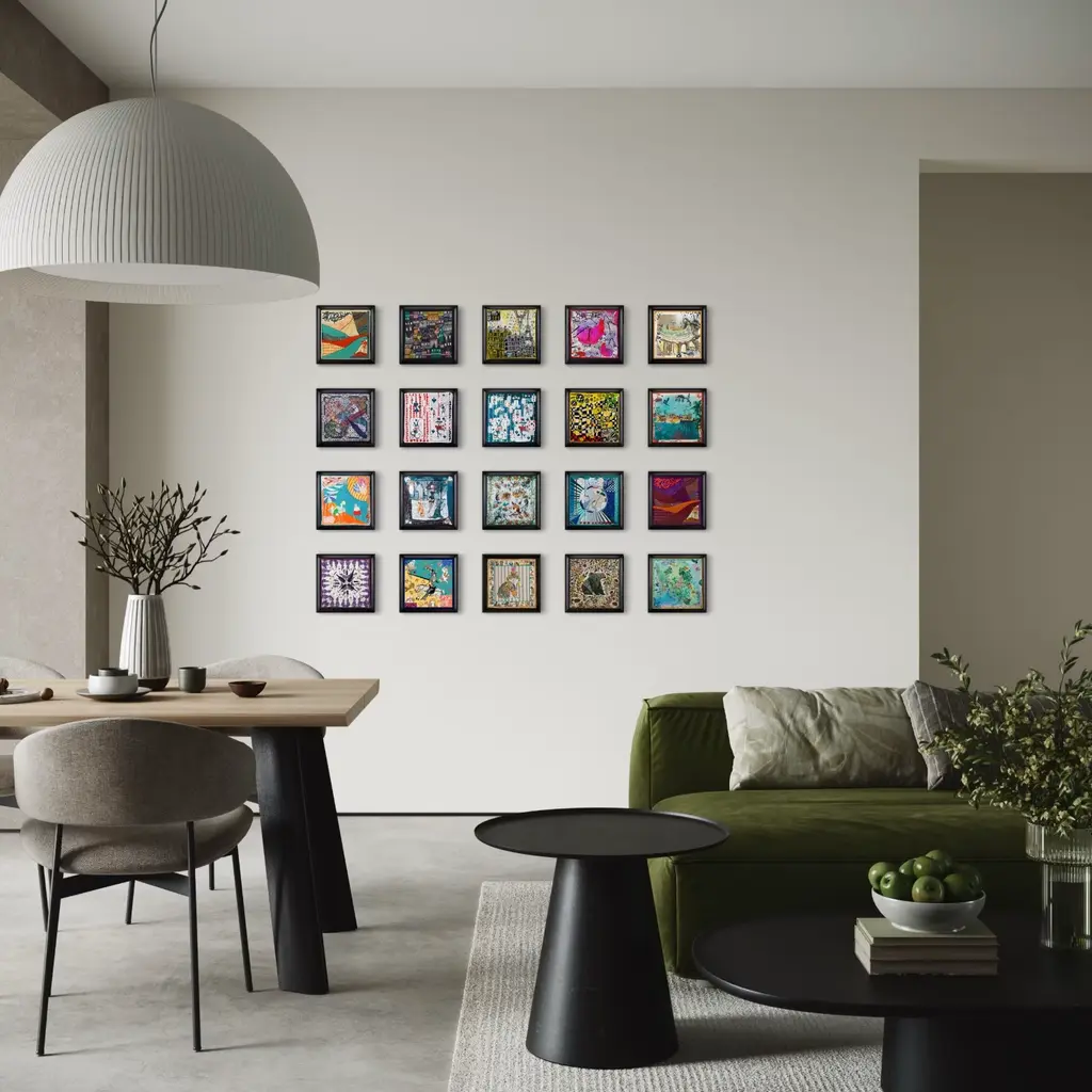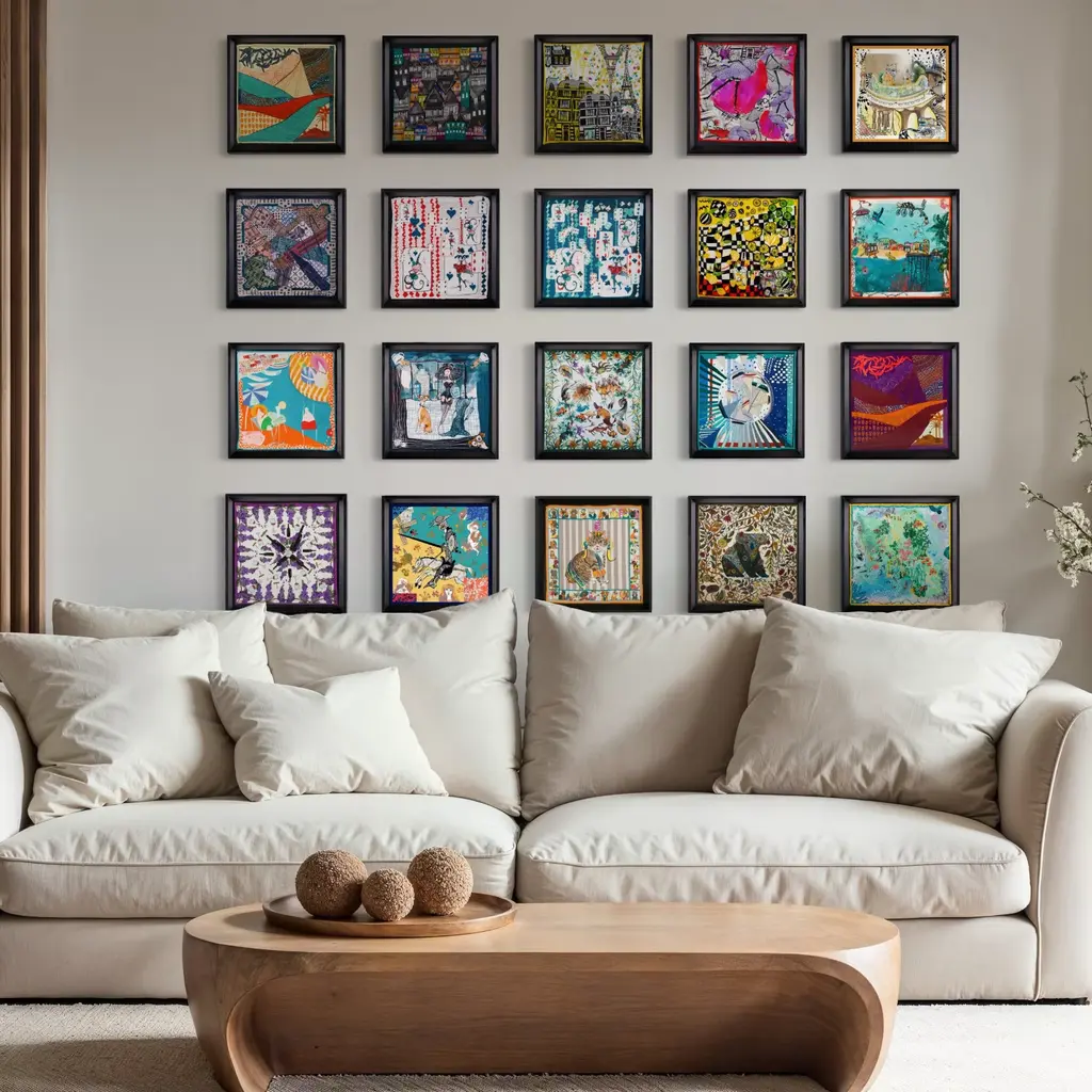 The dimensions of the artwork shown in the photo reflect the actual size.Material: 100% silk interior, 100% ayous wood frame.Set: Consists of 20 pieces.Dimensions: Each piece measures 24x24 cm.Wall Coverage: Approximately 120 cm x 120 cm when all 20 pieces are hung.Details: Hand-stitched edges on scarves.Design Story: The collection features iconic landmarks, cultures, and histories from around the world, including the Colosseum in Rome, the Colorful Houses of Alsace, the beaches of Hawaii, St. Tropez, the love locks of Paris, the Moulin Rouge woman, Sophia Loren and her dog, Las Vegas, Bordeaux wines, Limoncello, the Venice Carnival, the Amalfi Coast, Australian koala and more..