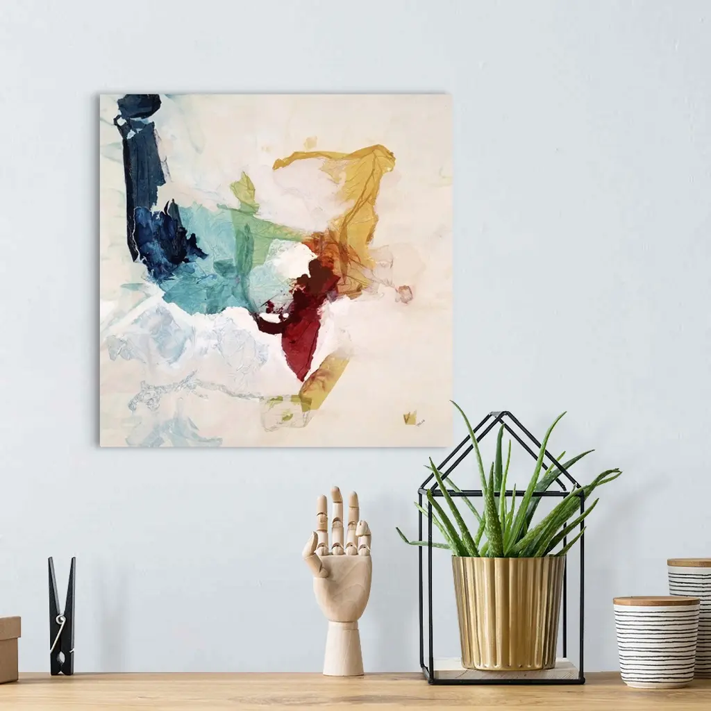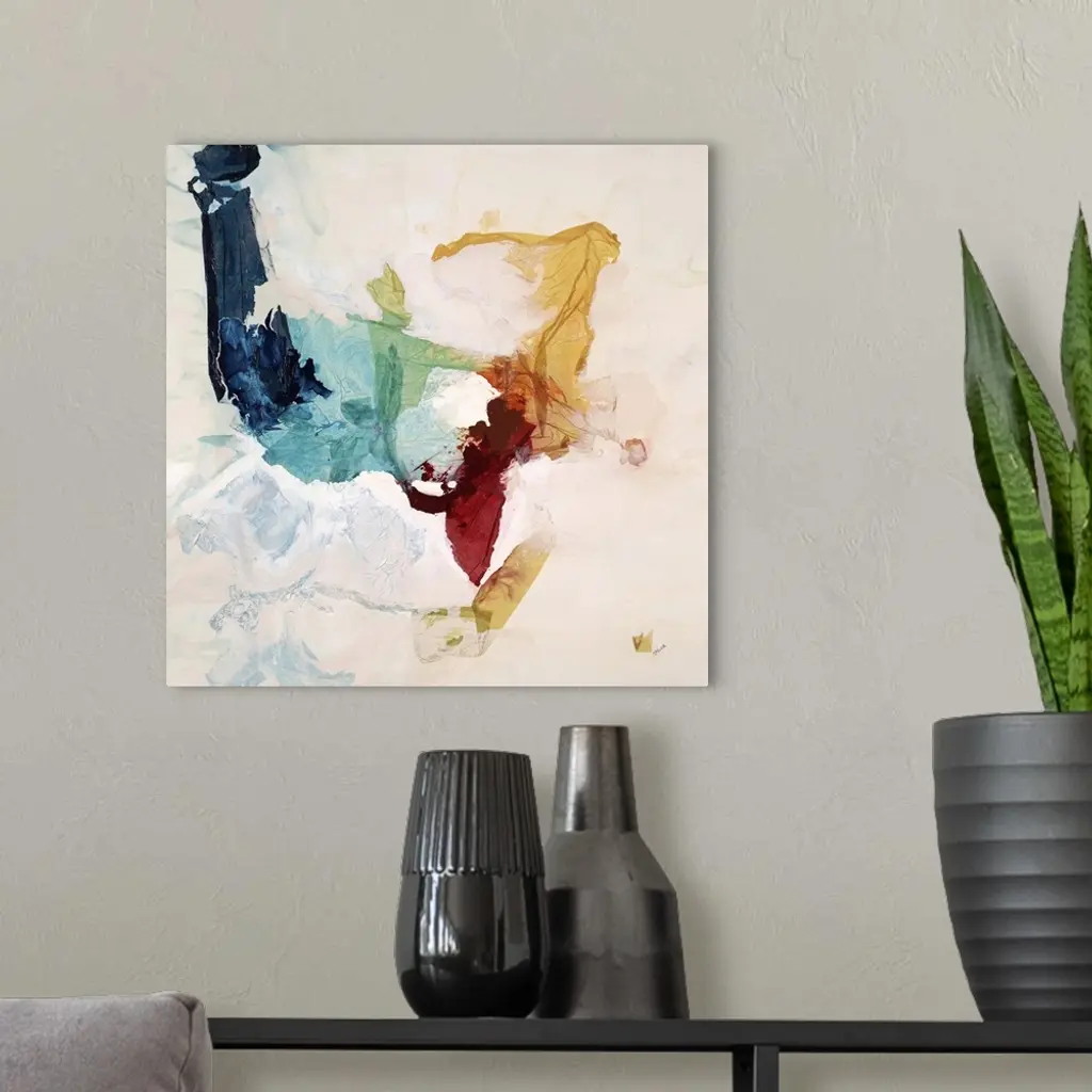 Abstract painting using a spectrum of colors appearing as if they are flowing and tumbling through the air.