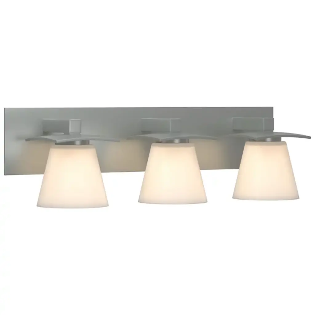 Each glass shade on the Hubbardton Forge Wren Vanity Light is defined by a simple hand-forged plate--square in shape, with just a slight curve downward. This vanity light is available with either incandescent or energy efficient fluorescent lamping. The glass shade, which has an acid-etched exterior and White interior casing, is offered in several colors and the handcrafted plate and stem come in a choice of distinctive finishes.