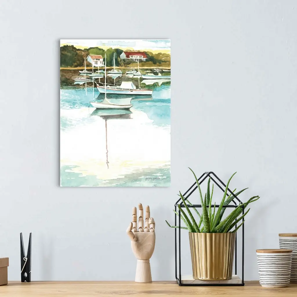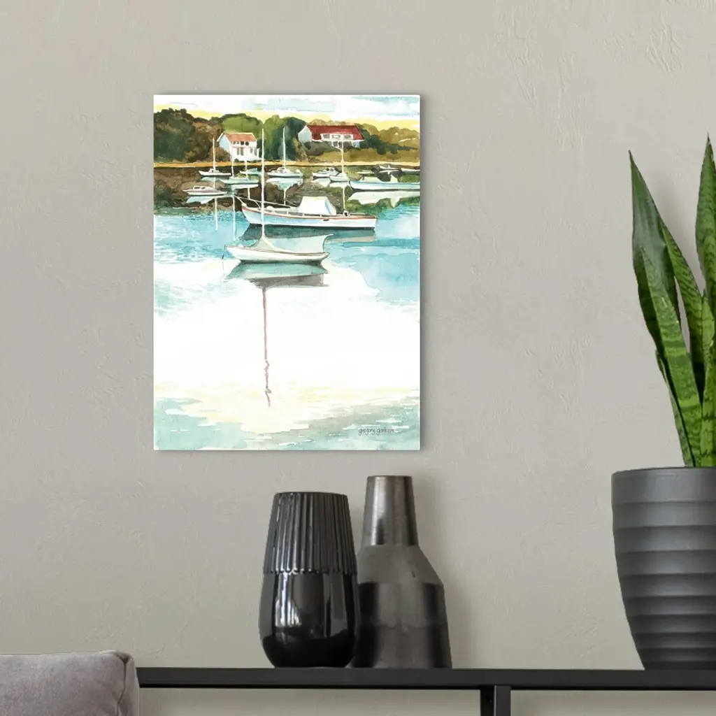 Contemporary watercolor painting of Wychmere Harbor with several boats anchored in the water.