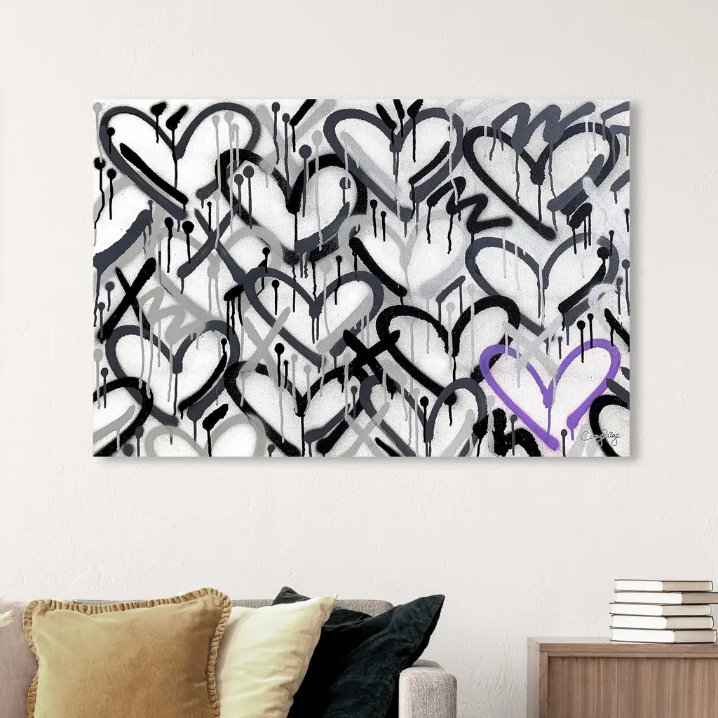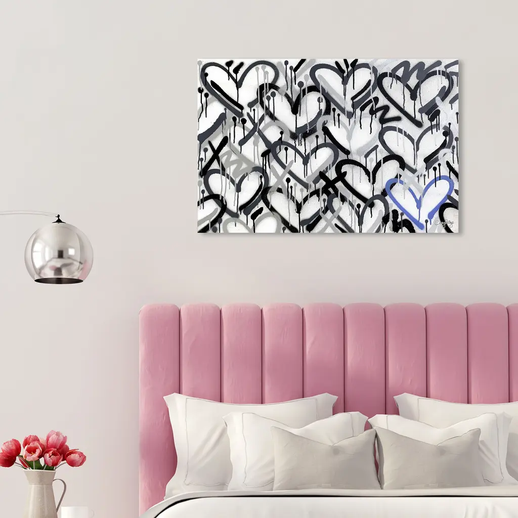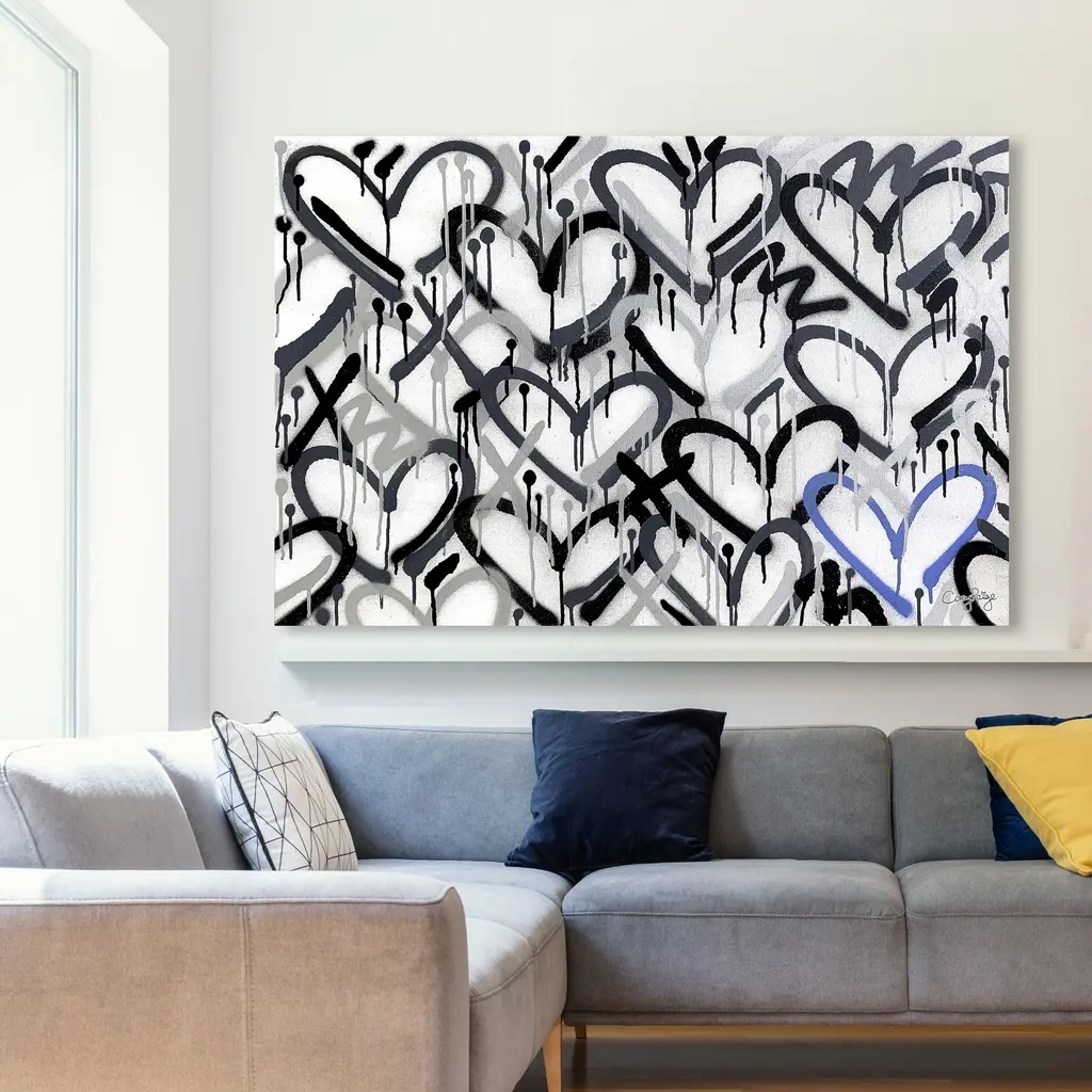 Invoke chromatic contemplation with this chic abstract wall art piece. Transform any room's wall into a beautiful focal point, through shape and color any space in your home or office will feel instantly alive. Corey Paige - Hearts Grays with Blue Accent, is a skillfully made Modern & Contemporary art piece by real artists. With an overarching Black color, this fine art print by Oliver Gal is the perfect finishing touch to your home décor theme. Features: This art piece has a horizontal orientation Abstract design with a Paint theme to bring you the perfect wall art Sustainable and forest friendly canvas print Professionally hand stretched in a 0.75 inch-thick sustainable wood frame Arrives ready to hang with pre-installed hooks for easy hanging. Nail and hanger also included Printed using ultra-premium and fade resistant inks to guarantee high definition and vivid colors Available in several size options Proudly made in the USA
