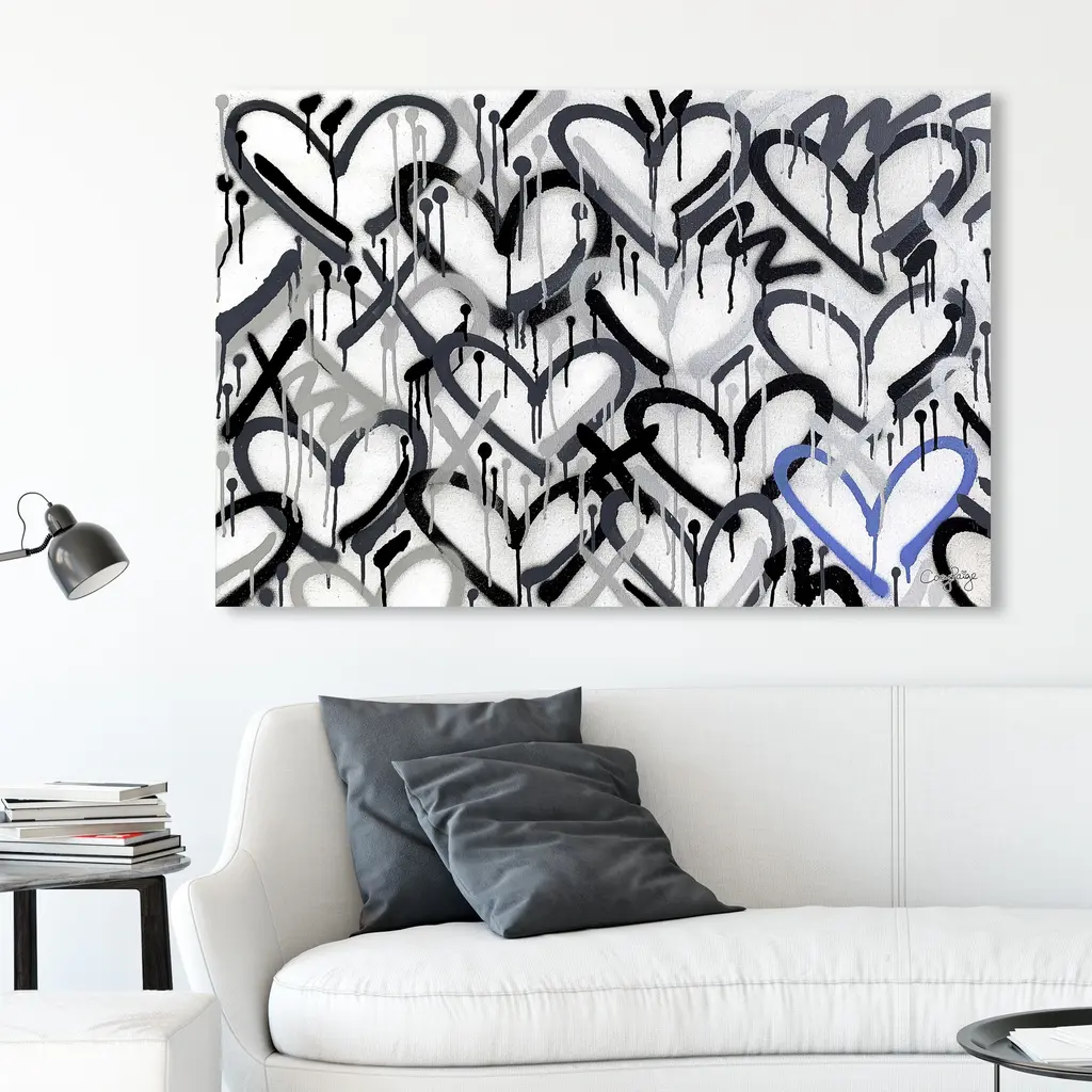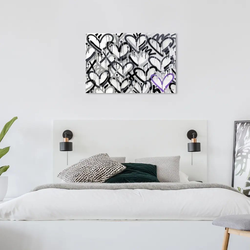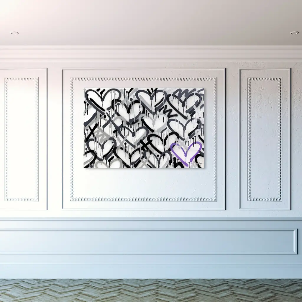 Invoke chromatic contemplation with this chic abstract wall art piece. Transform any room's wall into a beautiful focal point, through shape and color any space in your home or office will feel instantly alive. Corey Paige - Hearts Grays with Purple Accent, is a skillfully made Modern & Contemporary art piece by real artists. With an overarching Black color, this fine art print by Oliver Gal is the perfect finishing touch to your home décor theme. Features: This art piece has a horizontal orientation Abstract design with a Paint theme to bring you the perfect wall art Sustainable and forest friendly canvas print Professionally hand stretched in a 0.75 inch-thick sustainable wood frame Arrives ready to hang with pre-installed hooks for easy hanging. Nail and hanger also included Printed using ultra-premium and fade resistant inks to guarantee high definition and vivid colors Available in several size options Proudly made in the USA