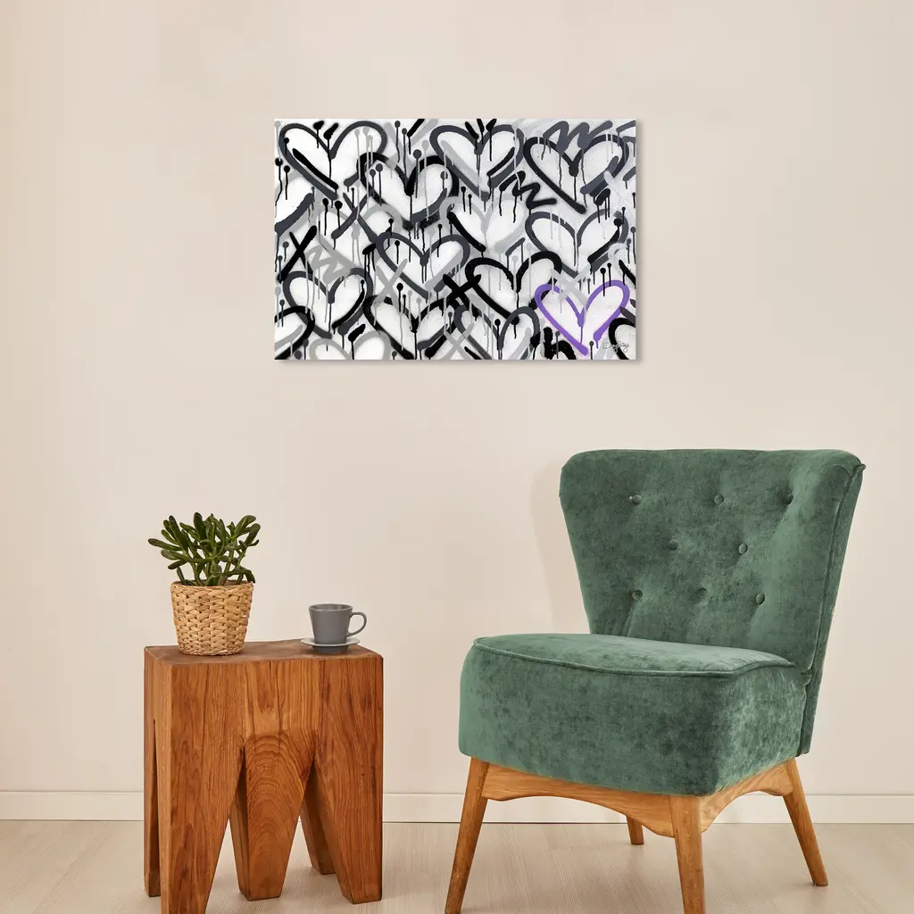 Invoke chromatic contemplation with this chic abstract wall art piece. Transform any room's wall into a beautiful focal point, through shape and color any space in your home or office will feel instantly alive. Corey Paige - Hearts Grays with Purple Accent, is a skillfully made Modern & Contemporary art piece by real artists. With an overarching Black color, this fine art print by Oliver Gal is the perfect finishing touch to your home décor theme. Features: This art piece has a horizontal orientation Abstract design with a Paint theme to bring you the perfect wall art Sustainable and forest friendly canvas print Professionally hand stretched in a 0.75 inch-thick sustainable wood frame Arrives ready to hang with pre-installed hooks for easy hanging. Nail and hanger also included Printed using ultra-premium and fade resistant inks to guarantee high definition and vivid colors Available in several size options Proudly made in the USA