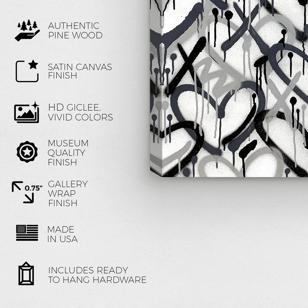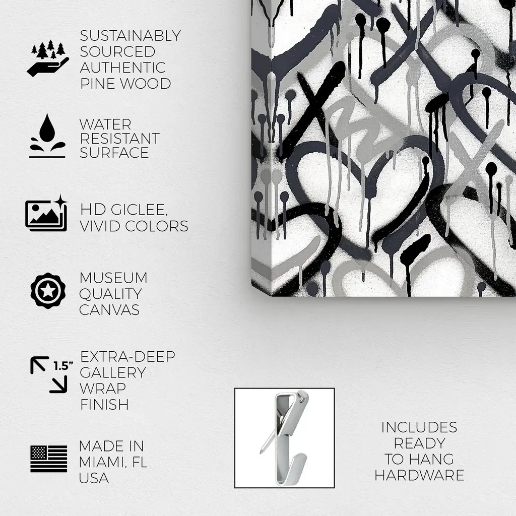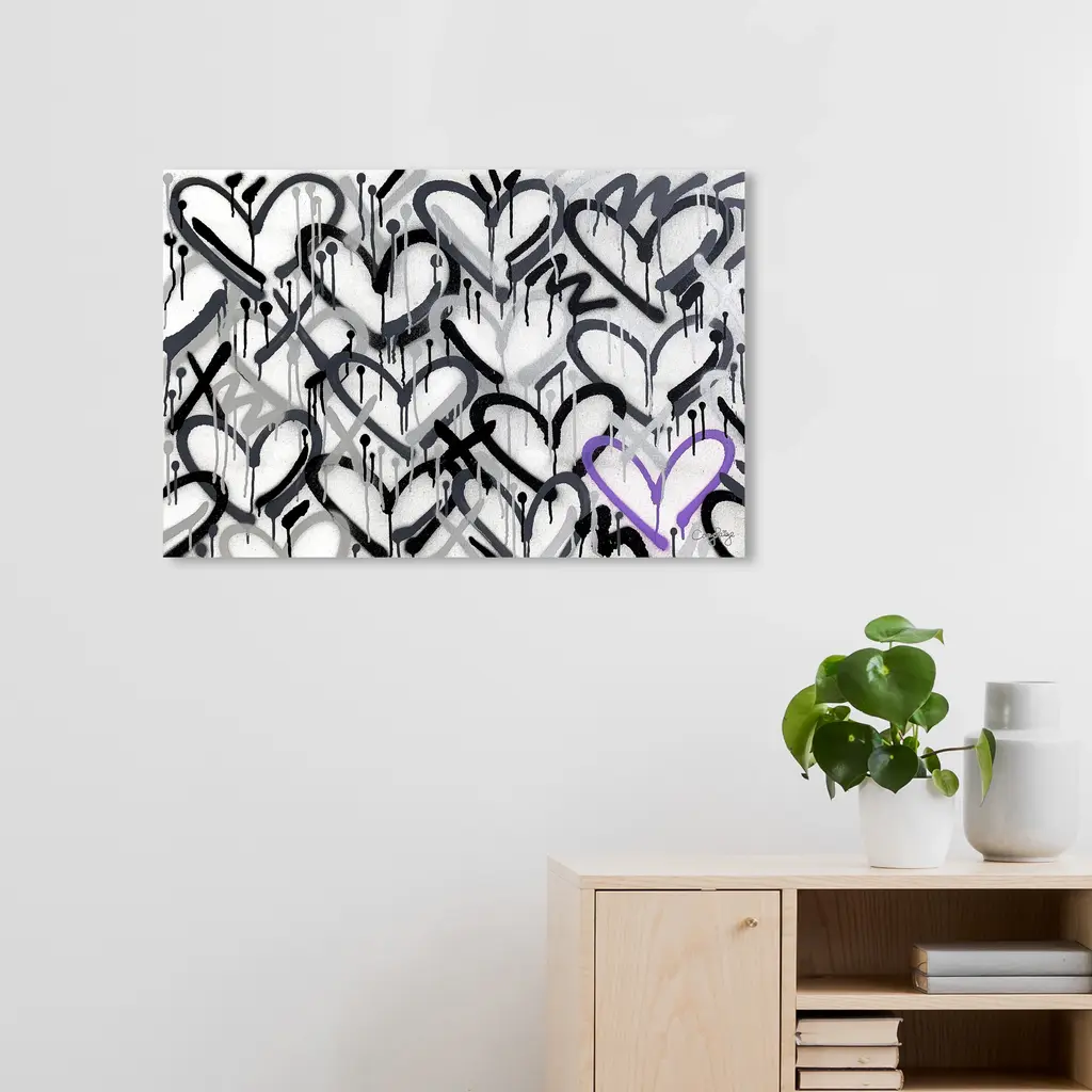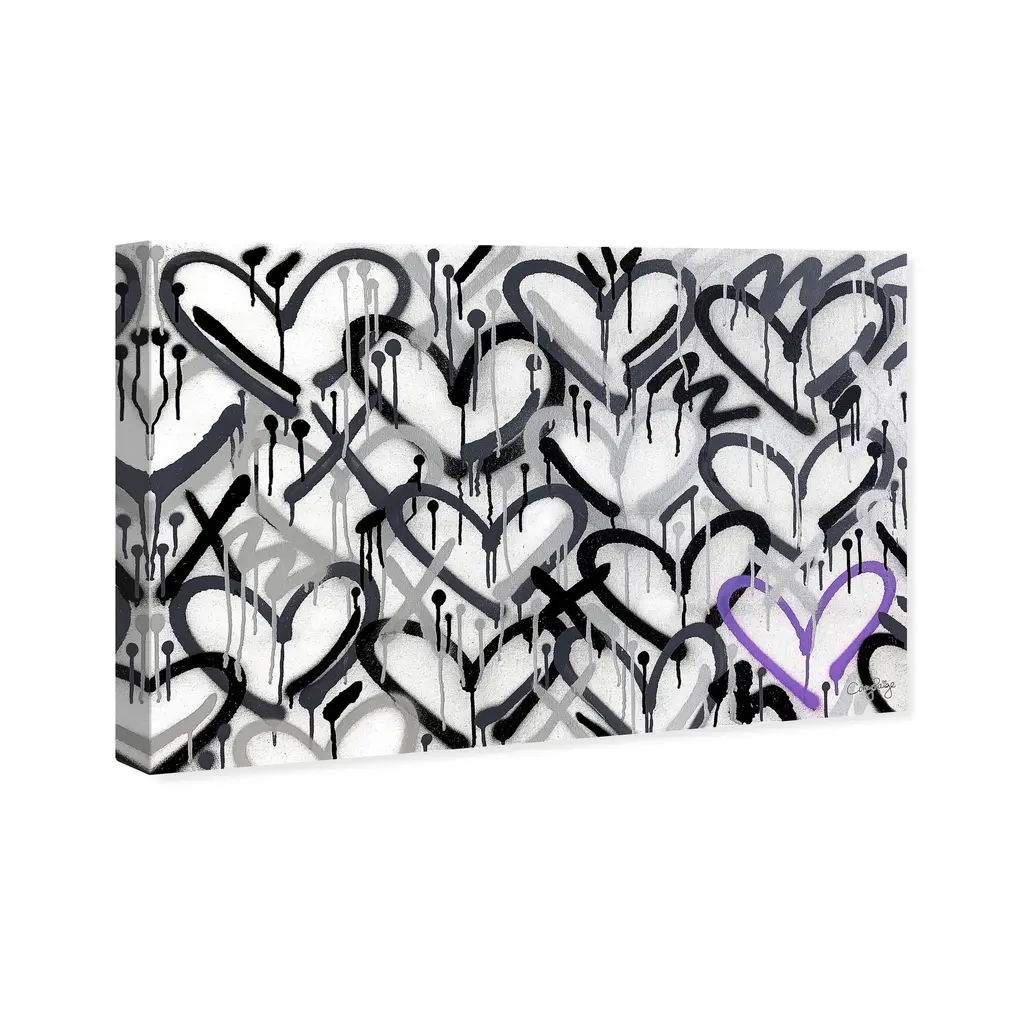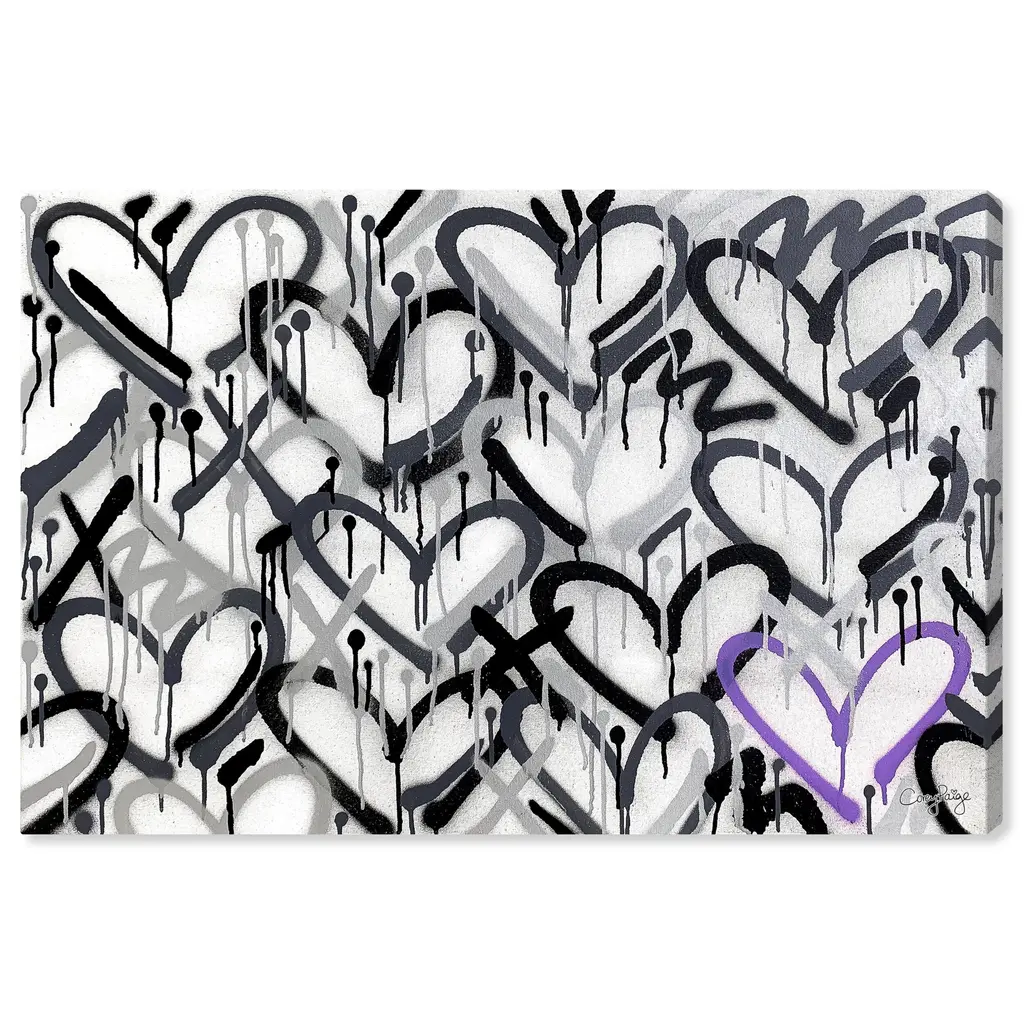 Invoke chromatic contemplation with this chic abstract wall art piece. Transform any room's wall into a beautiful focal point, through shape and color any space in your home or office will feel instantly alive. Corey Paige - Hearts Grays with Purple Accent, is a skillfully made Modern & Contemporary art piece by real artists. With an overarching Black color, this fine art print by Oliver Gal is the perfect finishing touch to your home décor theme. Features: This art piece has a horizontal orientation Abstract design with a Paint theme to bring you the perfect wall art Sustainable and forest friendly canvas print Professionally hand stretched in a 0.75 inch-thick sustainable wood frame Arrives ready to hang with pre-installed hooks for easy hanging. Nail and hanger also included Printed using ultra-premium and fade resistant inks to guarantee high definition and vivid colors Available in several size options Proudly made in the USA