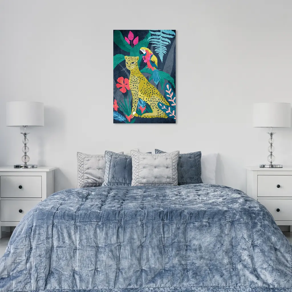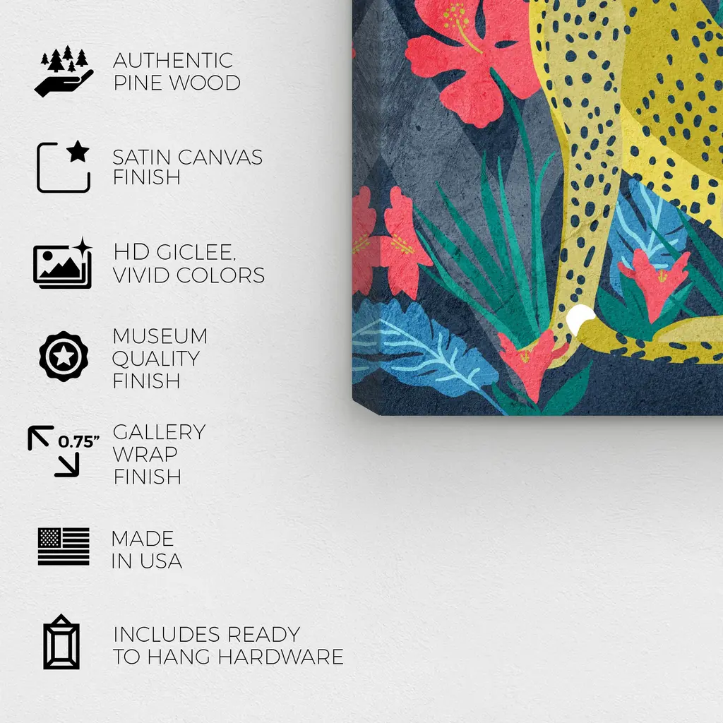 Cheetah on the Spot, is a skillfully made Tropical art piece by real artists. With an overarching Yellow color, this fine art print by Wynwood Studio Canvas is the perfect finishing touch to your home décor theme. Features: This art piece has a vertical orientation Animals design with a Felines theme to bring you the perfect wall art Sustainable and forest friendly canvas print Professionally hand stretched in a 0.75 inch-thick sustainable wood frame Arrives ready to hang with pre-installed hooks for easy hanging. Nail and hanger also included Printed using ultra-premium and fade resistant inks to guarantee high definition and vivid colors Available in several size options Proudly made in the USA