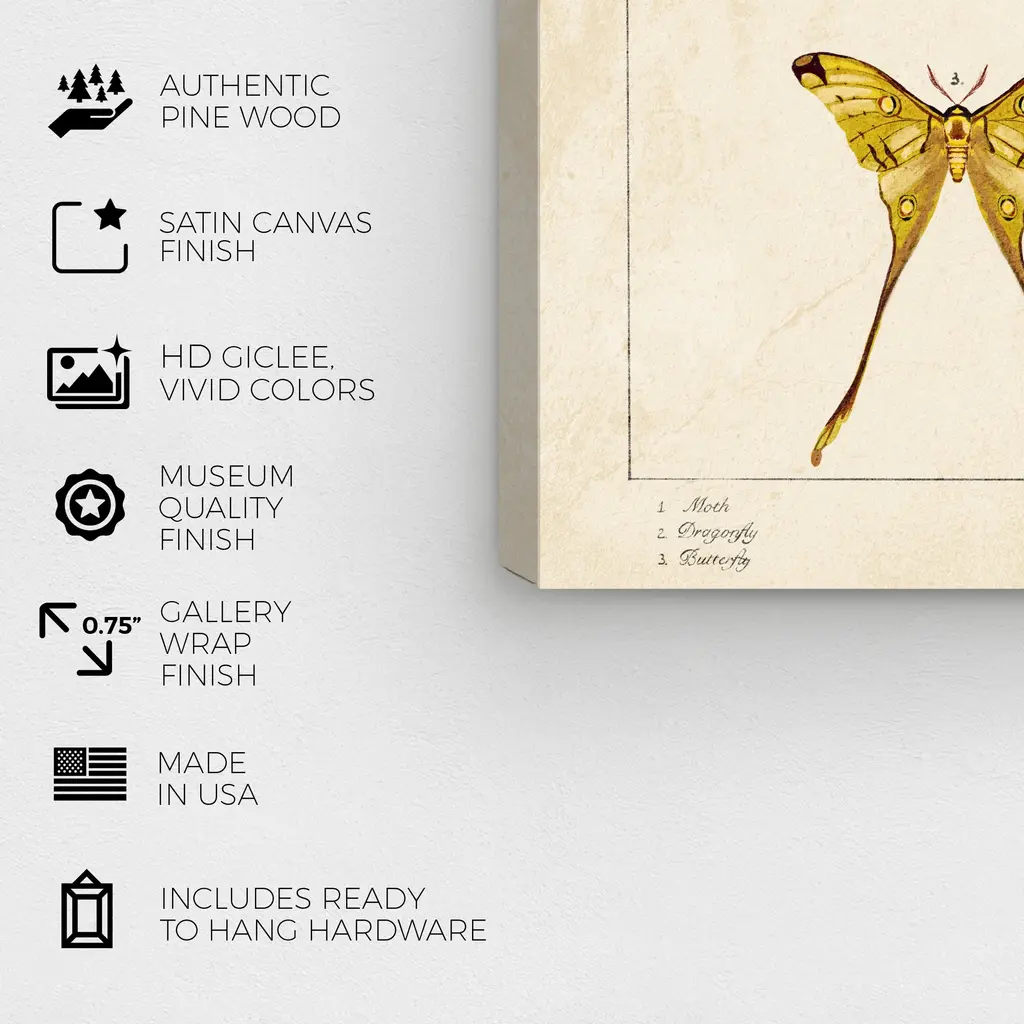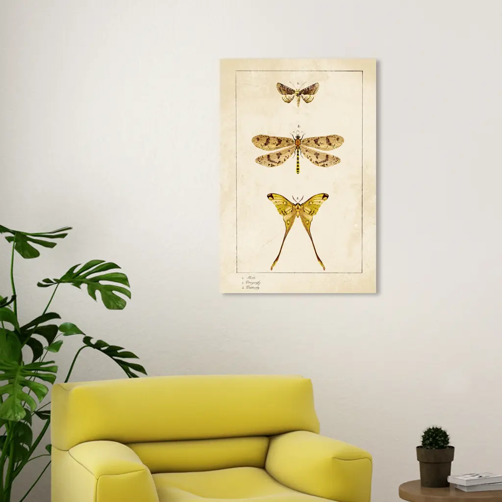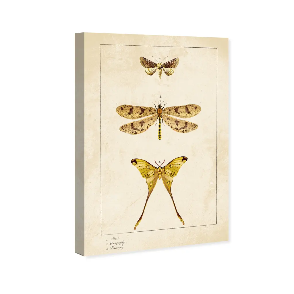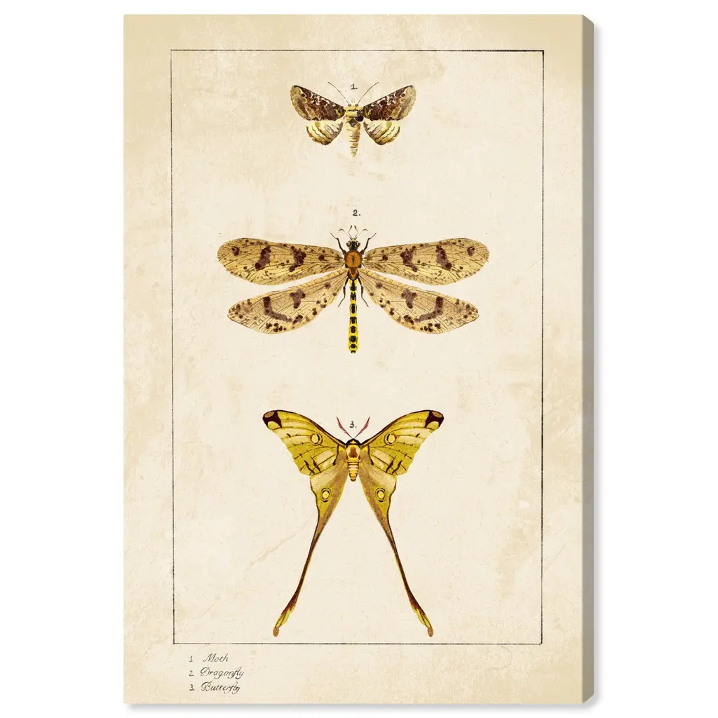 Three Vintage Winged Insects, is a skillfully made Mid-Century Modern art piece by real artists. With an overarching Gold color, this fine art print by Wynwood Studio Canvas is the perfect finishing touch to your home décor theme. Features: This art piece has a vertical orientation Animals design with a Insects theme to bring you the perfect wall art Sustainable and forest friendly canvas print Professionally hand stretched in a 0.75 inch-thick sustainable wood frame Arrives ready to hang with pre-installed hooks for easy hanging. Nail and hanger also included Printed using ultra-premium and fade resistant inks to guarantee high definition and vivid colors Available in several size options Proudly made in the USA