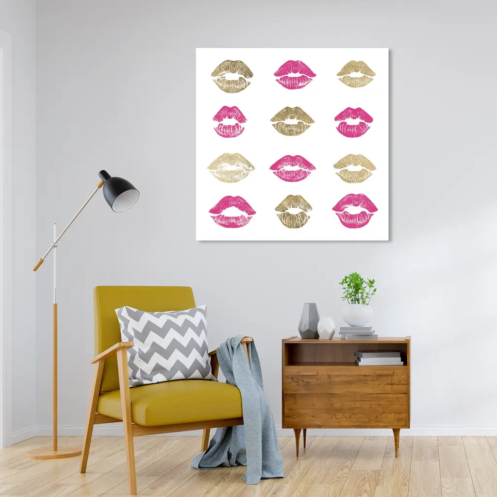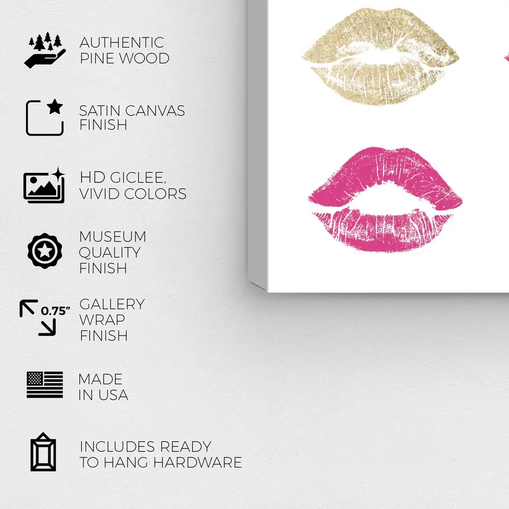 Marilyn 's Kiss, is a skillfully made Glam art piece by real artists. With an overarching Gold color, this fine art print by Wynwood Studio Canvas is the perfect finishing touch to your home décor theme. Features: This art piece has a square orientation Fashion design with a Makeup theme to bring you the perfect wall art Sustainable and forest friendly canvas print Professionally hand stretched in a 0.75 inch-thick sustainable wood frame Arrives ready to hang with pre-installed hooks for easy hanging. Nail and hanger also included Printed using ultra-premium and fade resistant inks to guarantee high definition and vivid colors Available in several size options Proudly made in the USA