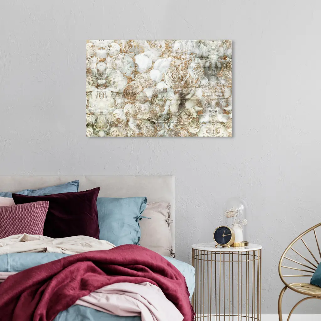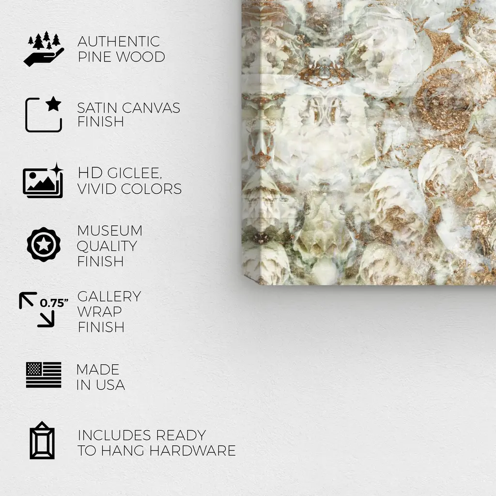 Golden White Roses, is a skillfully made Traditional art piece by real artists. With an overarching Gold color, this fine art print by Wynwood Studio Canvas is the perfect finishing touch to your home décor theme. Features: This art piece has a horizontal orientation Floral design with a Florals theme to bring you the perfect wall art Sustainable and forest friendly canvas print Professionally hand stretched in a 0.75 inch-thick sustainable wood frame Arrives ready to hang with pre-installed hooks for easy hanging. Nail and hanger also included Printed using ultra-premium and fade resistant inks to guarantee high definition and vivid colors Available in several size options Proudly made in the USA