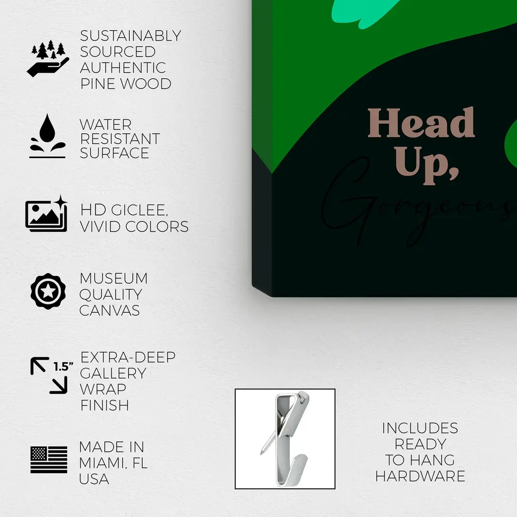 Let your wall decor speak words of wisdom to everyone who passes through with this typography and quotes wall art piece. Everything you need to express but with a modern and chic style. These playful scripts and sayings will give your home or workspace the hint of inspiration it was missingHead Up Gorgeous, is a skillfully made Modern & Contemporary art piece by real artists. With an overarching Pink color, this fine art print by Wynwood Studio Canvas is the perfect finishing touch to your home décor theme. Features: This art piece has a vertical orientation Typography and Symbols design with a Empowered Women Quotes and Sayings theme to bring you the perfect wall art Sustainable and forest friendly canvas print Professionally hand stretched in a 0.75 inch-thick sustainable wood frame Arrives ready to hang with pre-installed hooks for easy hanging. Nail and hanger also included Printed using ultra-premium and fade resistant inks to guarantee high definition and vivid colors Available in several size options Proudly made in the USA