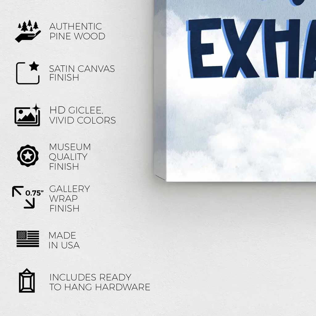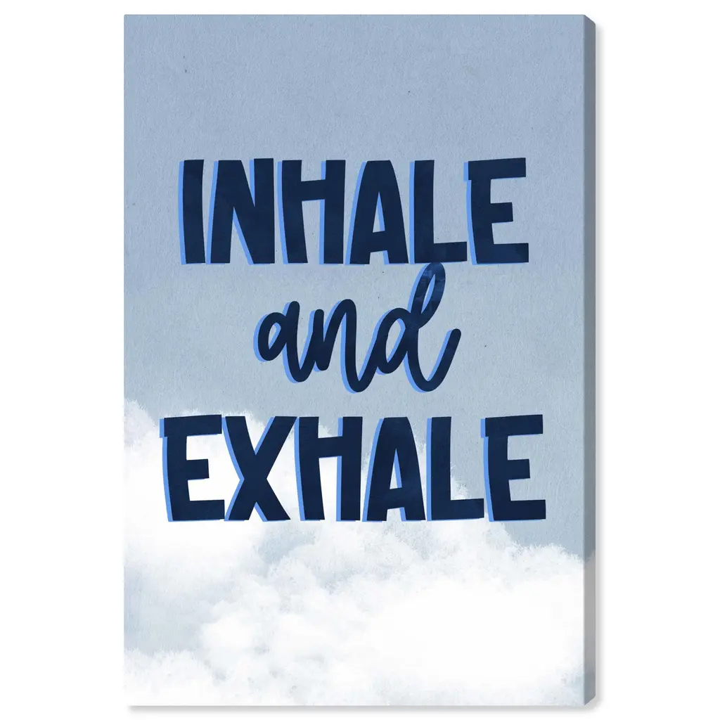 Inhale and Exhale, is a skillfully made art piece by real artists. With an overarching Blue color, this fine art print by Wynwood Studio Canvas is the perfect finishing touch to your home décor theme. Features: This art piece has a vertical orientation Typography and Symbols design with a Quotes and Sayings theme to bring you the perfect wall art Sustainable and forest friendly canvas print Professionally hand stretched in a 0.75 inch-thick sustainable wood frame Arrives ready to hang with pre-installed hooks for easy hanging. Nail and hanger also included Printed using ultra-premium and fade resistant inks to guarantee high definition and vivid colors Available in several size options Proudly made in the USA