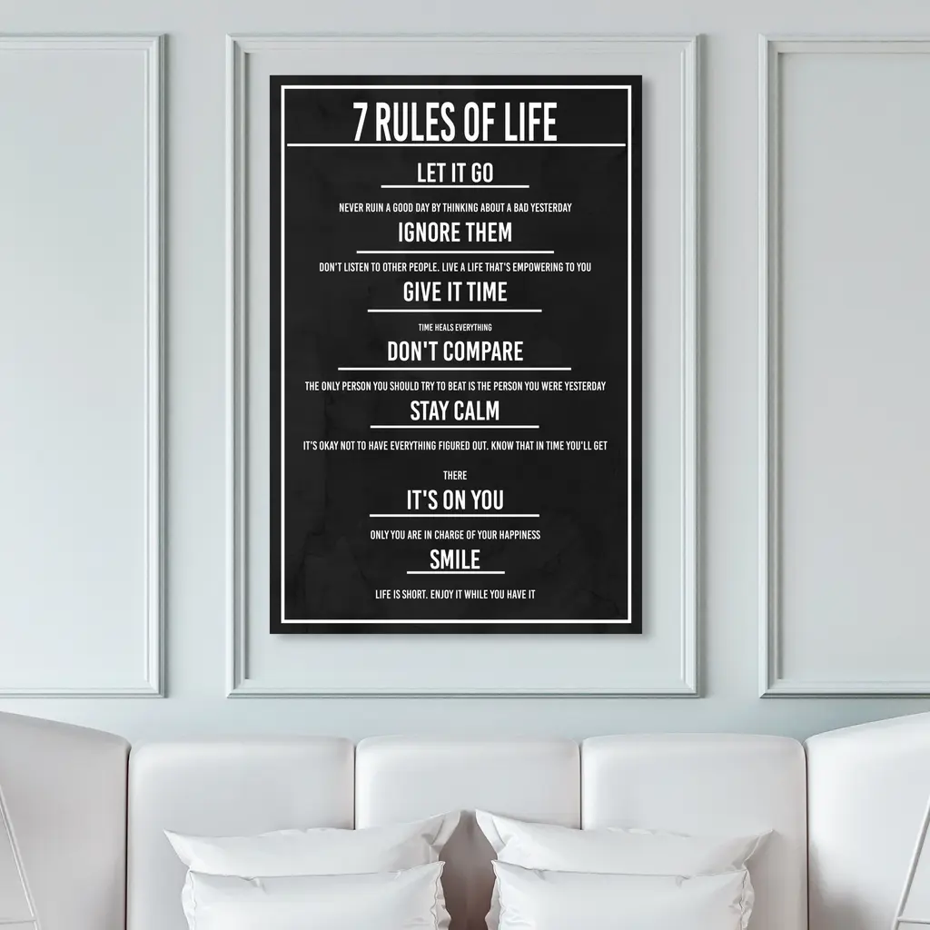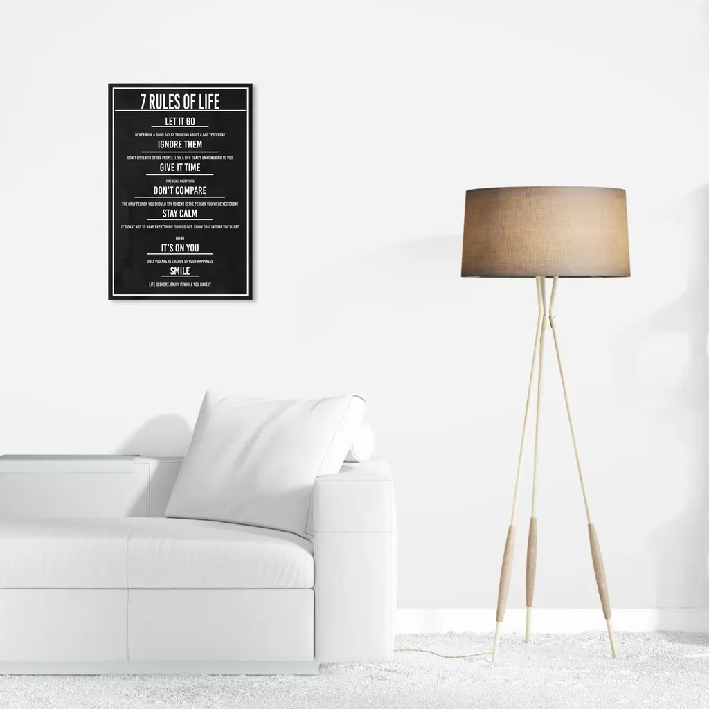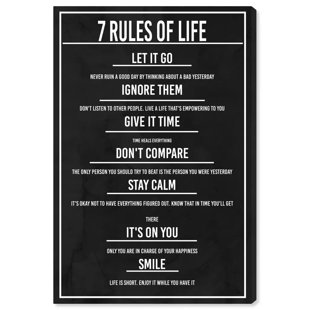 7 Rules of Life Dusk, is a skillfully made Modern & Contemporary art piece by real artists. With an overarching Black color, this fine art print by Wynwood Studio Canvas is the perfect finishing touch to your home décor theme. Features: This art piece has a vertical orientation Fashion design with a Lifestyle theme to bring you the perfect wall art Sustainable and forest friendly canvas print Professionally hand stretched in a 0.75 inch-thick sustainable wood frame Arrives ready to hang with pre-installed hooks for easy hanging. Nail and hanger also included Printed using ultra-premium and fade resistant inks to guarantee high definition and vivid colors Available in several size options Proudly made in the USA