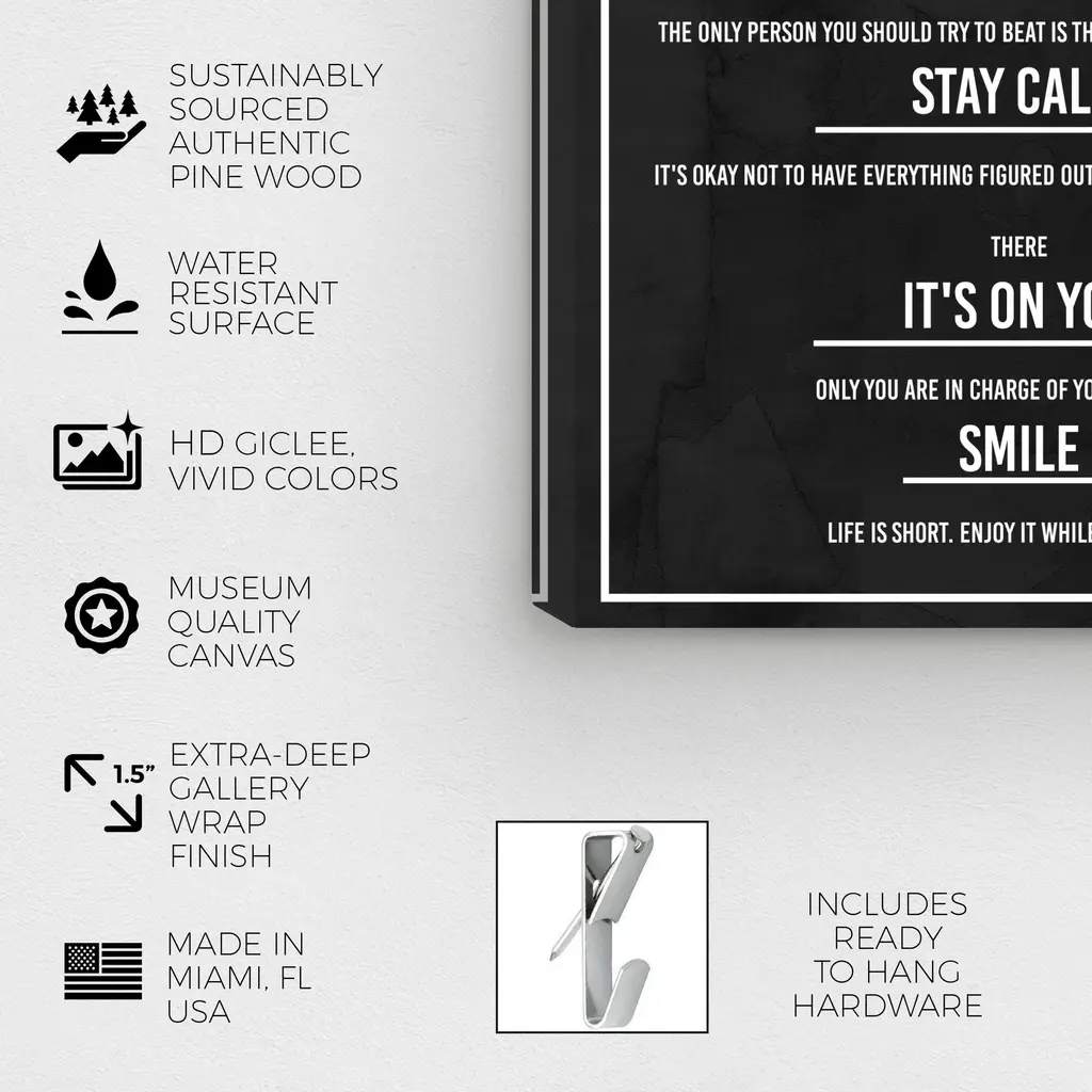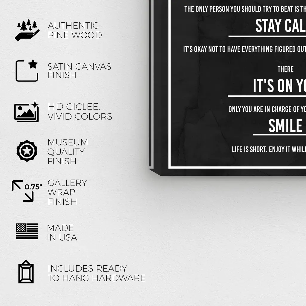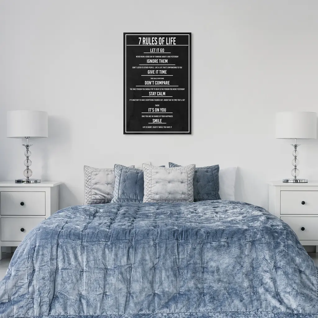 7 Rules of Life Dusk, is a skillfully made Modern & Contemporary art piece by real artists. With an overarching Black color, this fine art print by Wynwood Studio Canvas is the perfect finishing touch to your home décor theme. Features: This art piece has a vertical orientation Fashion design with a Lifestyle theme to bring you the perfect wall art Sustainable and forest friendly canvas print Professionally hand stretched in a 0.75 inch-thick sustainable wood frame Arrives ready to hang with pre-installed hooks for easy hanging. Nail and hanger also included Printed using ultra-premium and fade resistant inks to guarantee high definition and vivid colors Available in several size options Proudly made in the USA