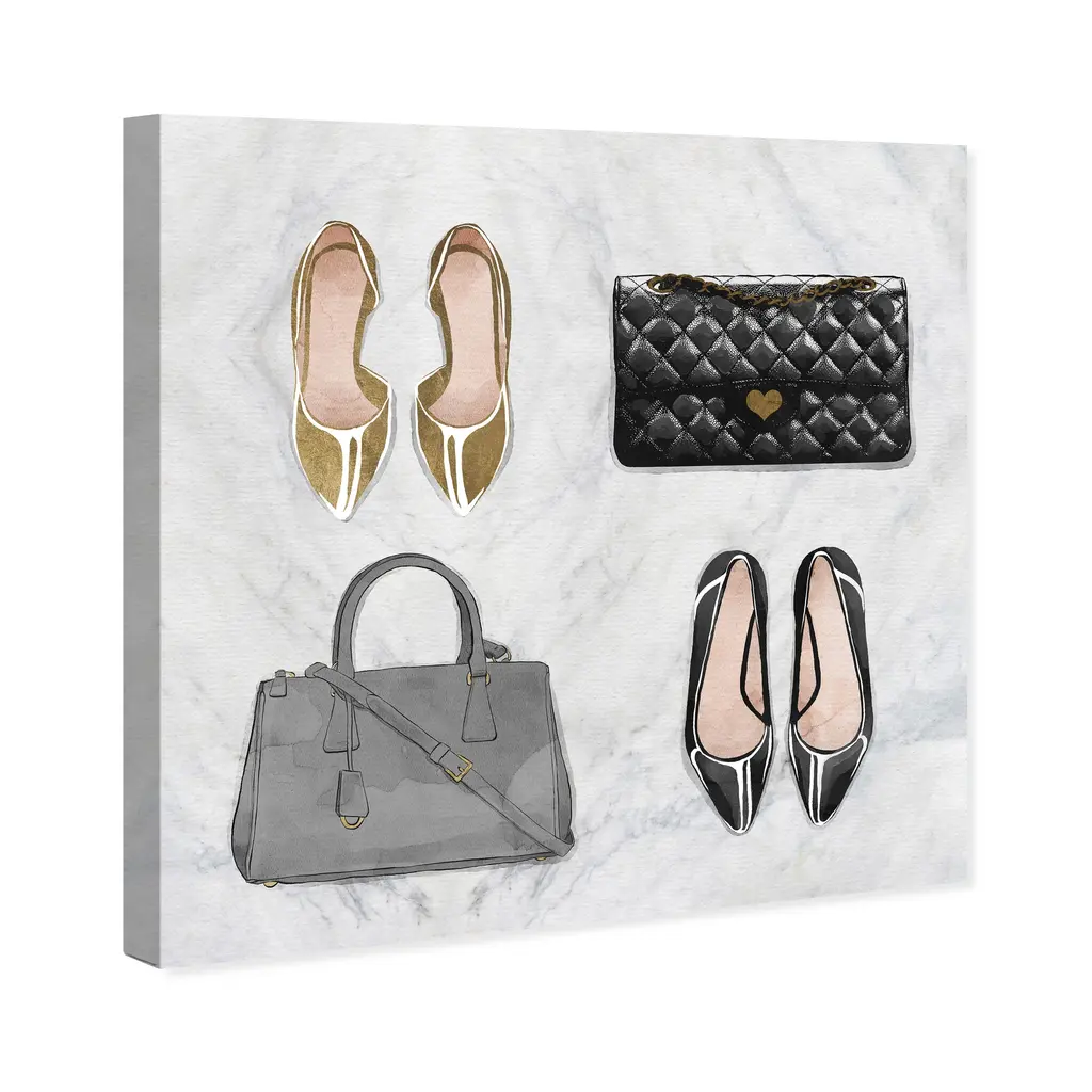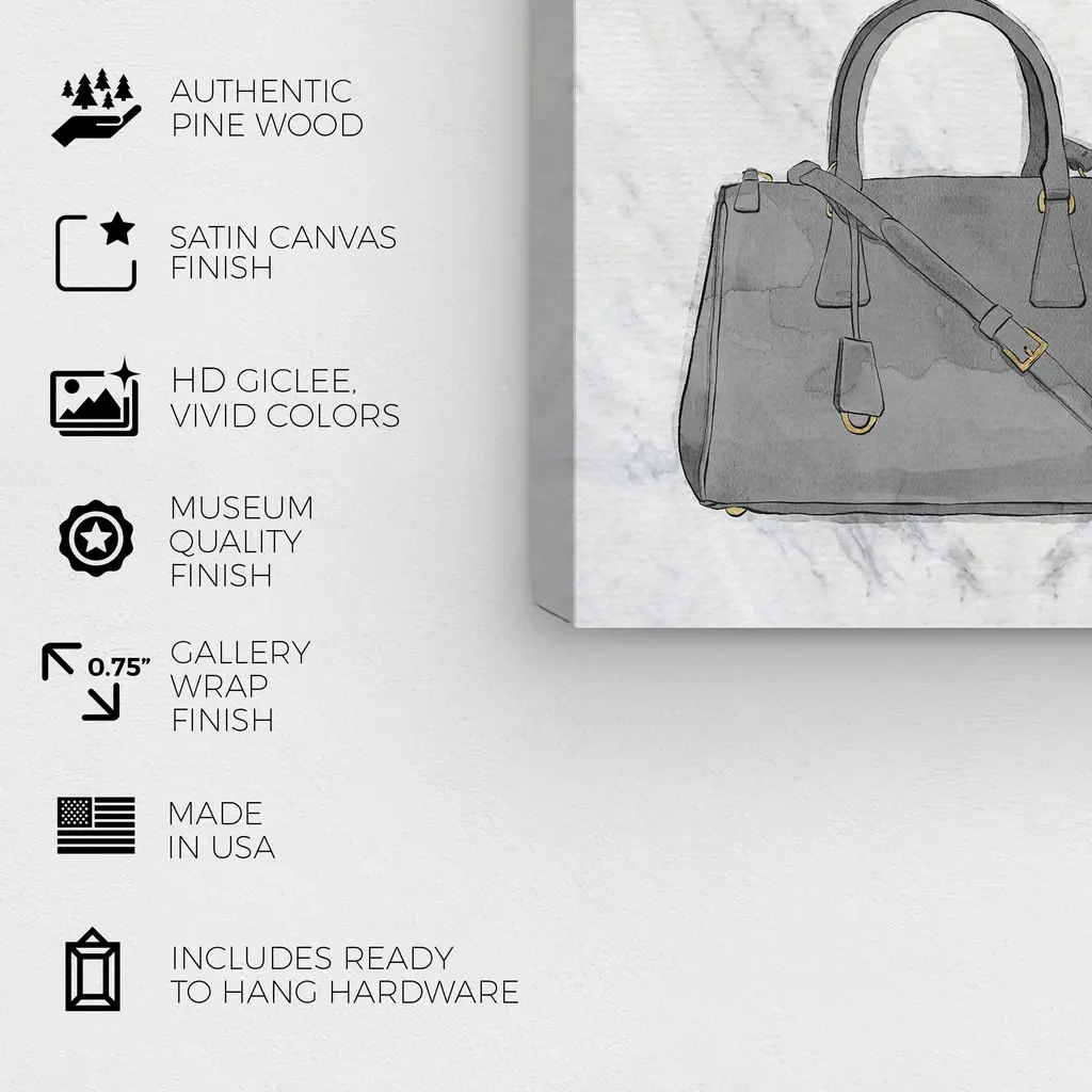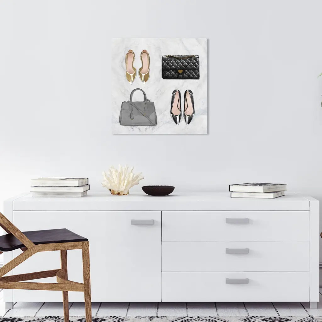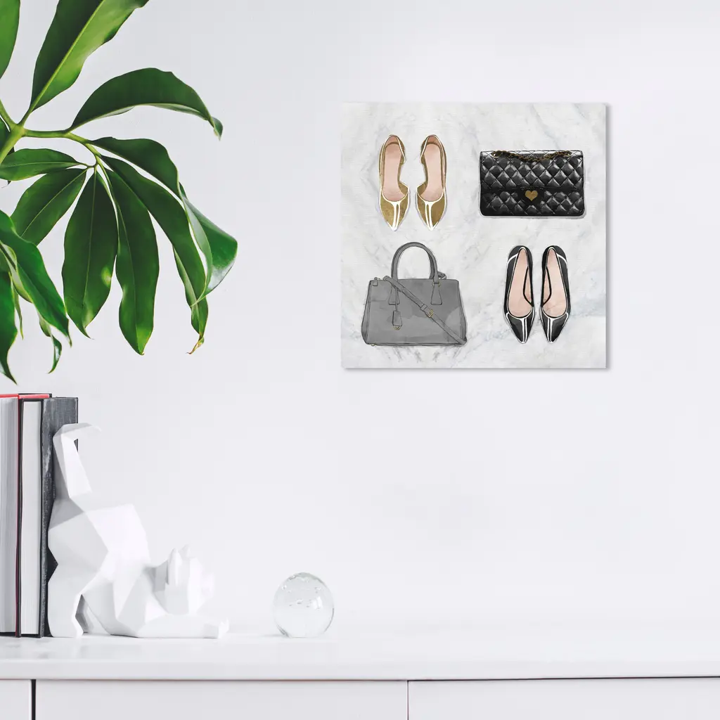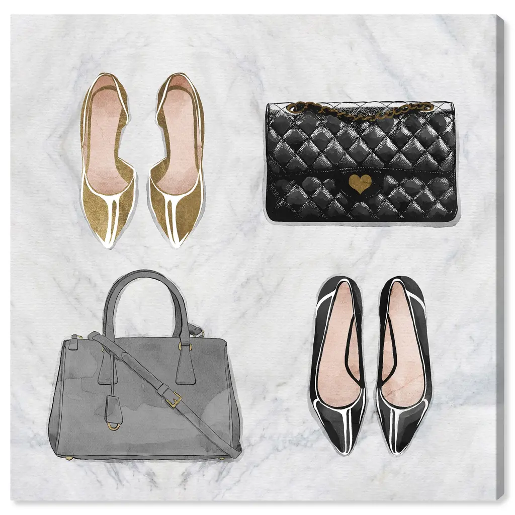 My To Go To Styles, is a skillfully made Glam art piece by real artists. With an overarching Gold color, this fine art print by Wynwood Studio Prints is the perfect finishing touch to your home décor theme. Features: This art piece has a square orientation Fashion design with a Handbags theme to bring you the perfect wall art Sustainable and forest friendly canvas print Professionally hand stretched in a 0.75 inch-thick sustainable wood frame Arrives ready to hang with pre-installed hooks for easy hanging. Nail and hanger also included Printed using ultra-premium and fade resistant inks to guarantee high definition and vivid colors Available in several size options Proudly made in the USA