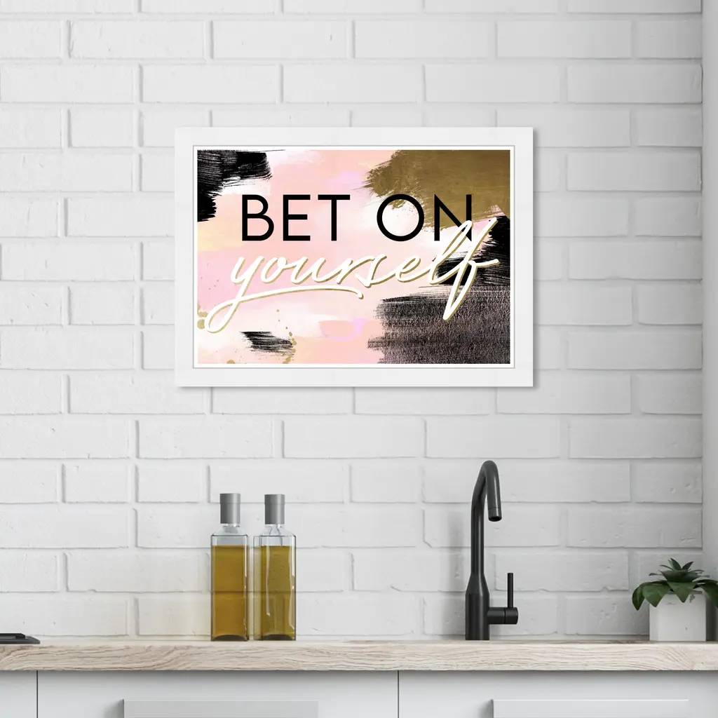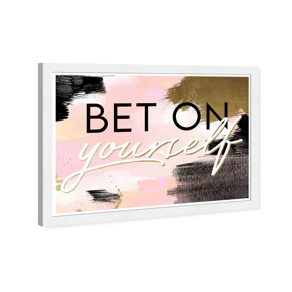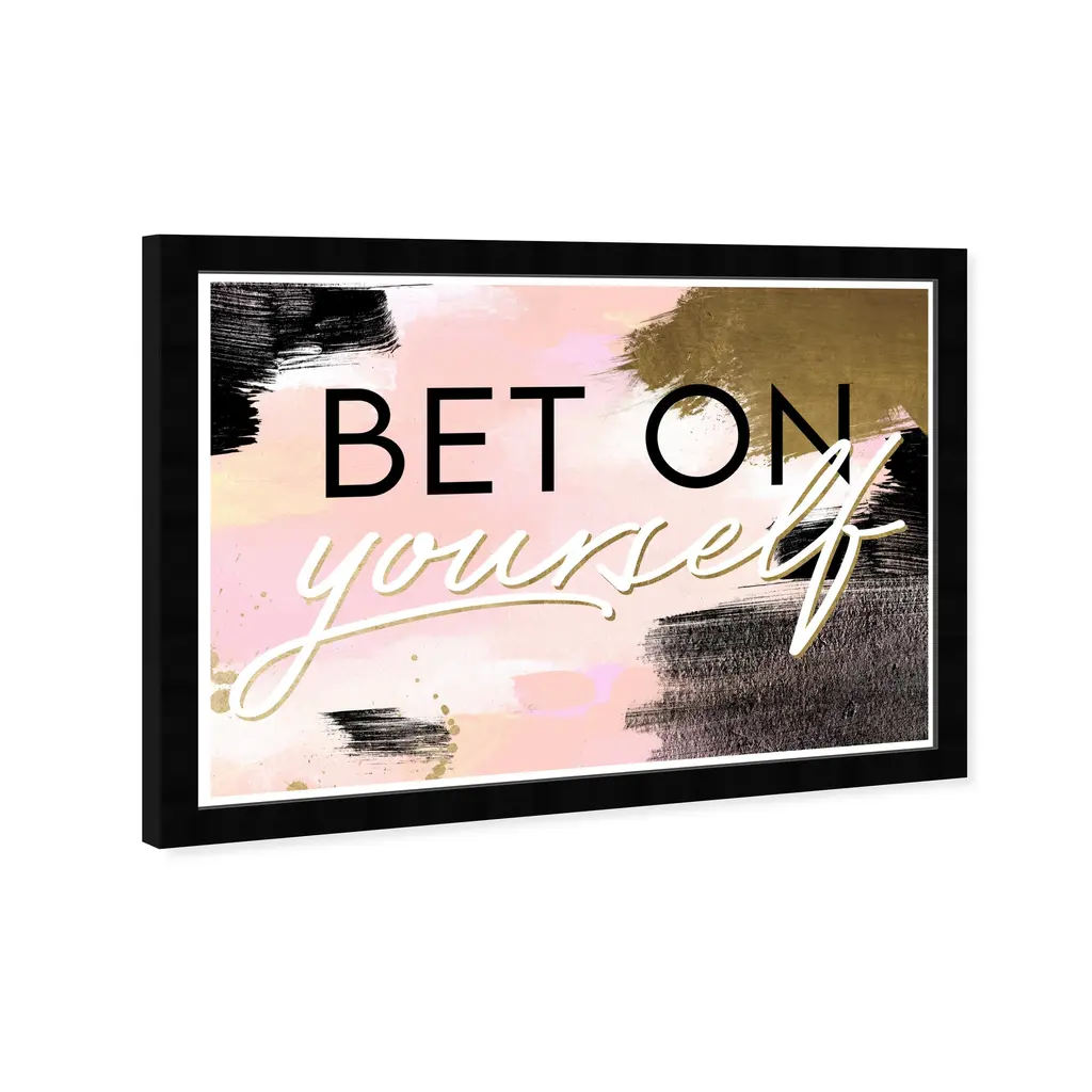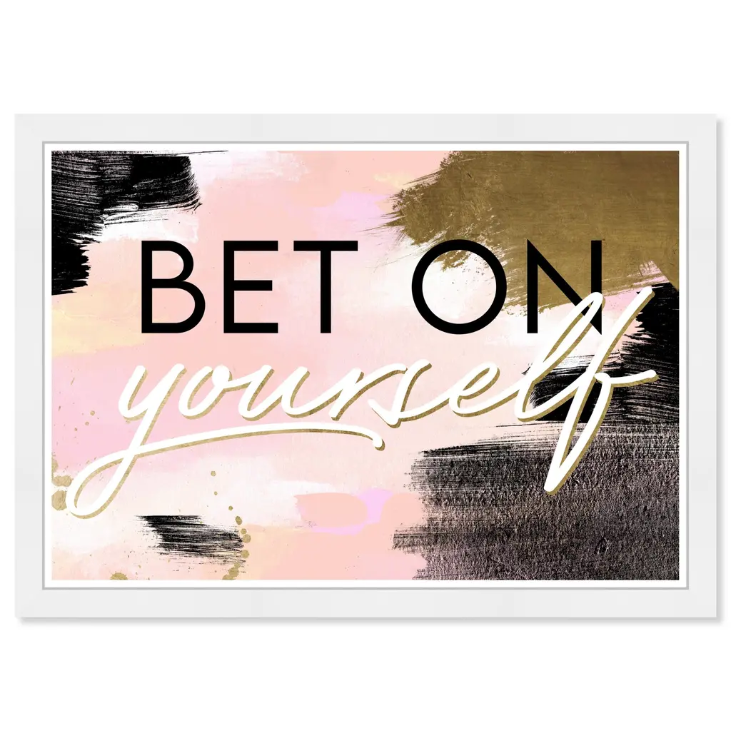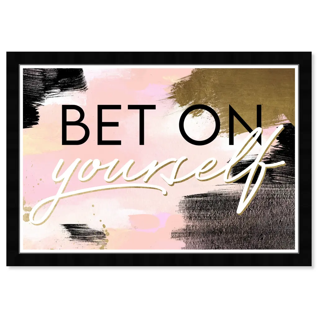 Let your wall decor speak words of wisdom to everyone who passes through with this typography and quotes wall art piece. Everything you need to express but with a modern and chic style. These playful scripts and sayings will give your home or workspace the hint of inspiration it was missingBet On Yourself Blush, is a skillfully made Glam art piece by real artists. With an overarching Pink color, this fine art print by Wynwood Studio Prints is the perfect finishing touch to your home décor theme. Features: This art piece has a horizontal orientation Typography and Symbols design with a Empowered Women Quotes and Sayings theme to bring you the perfect wall art Sustainable and forest friendly framed print Professionally hand framed in black picture frame Arrives ready to hang with pre-installed hooks for easy hanging. Nail and hanger also included Printed using ultra-premium and fade resistant inks to guarantee high definition and vivid colors Available in several size options Proudly made in the USA