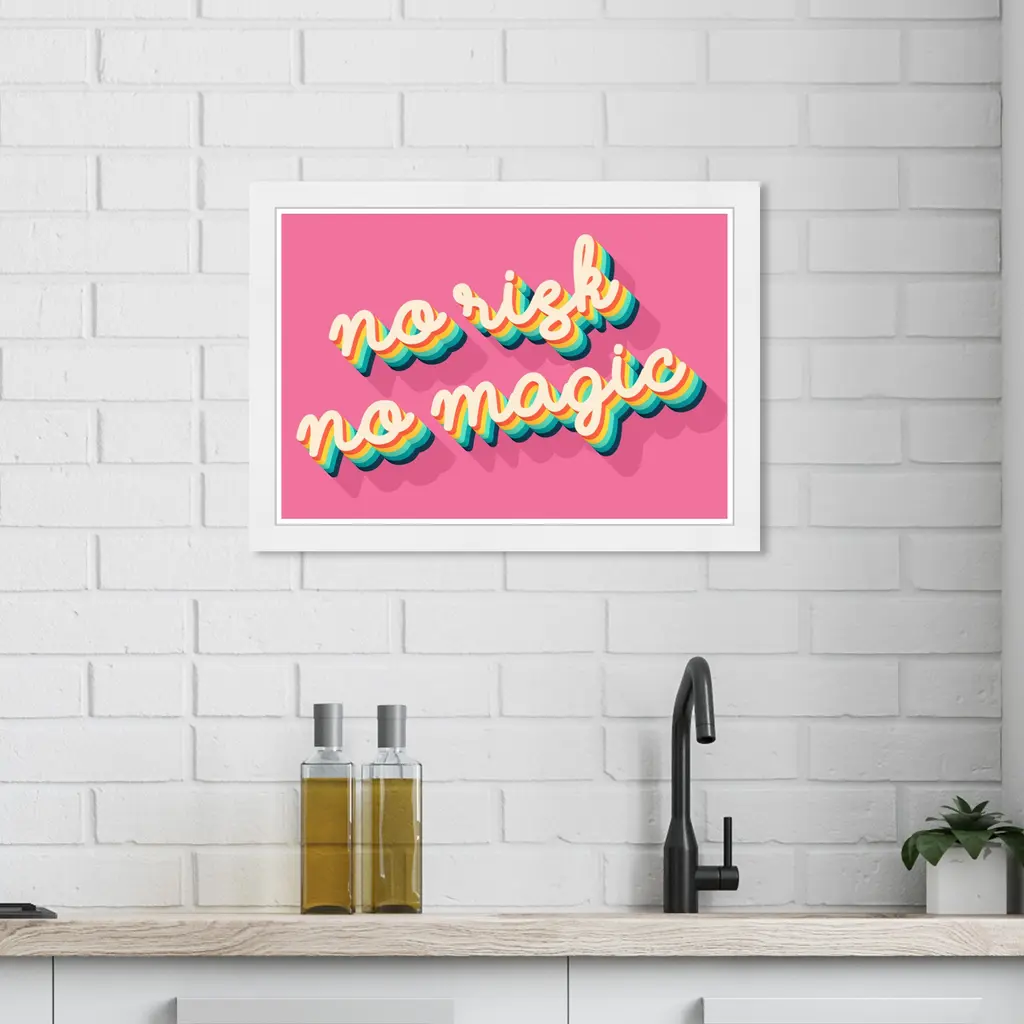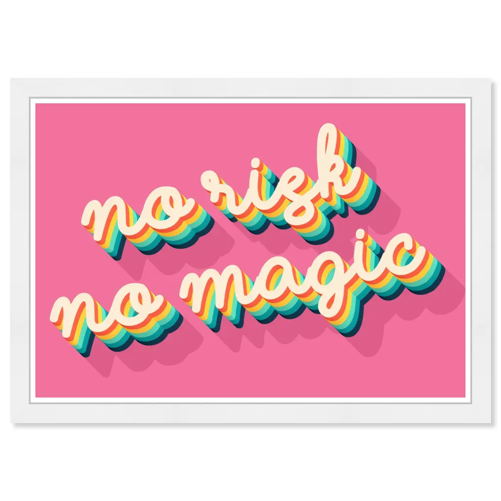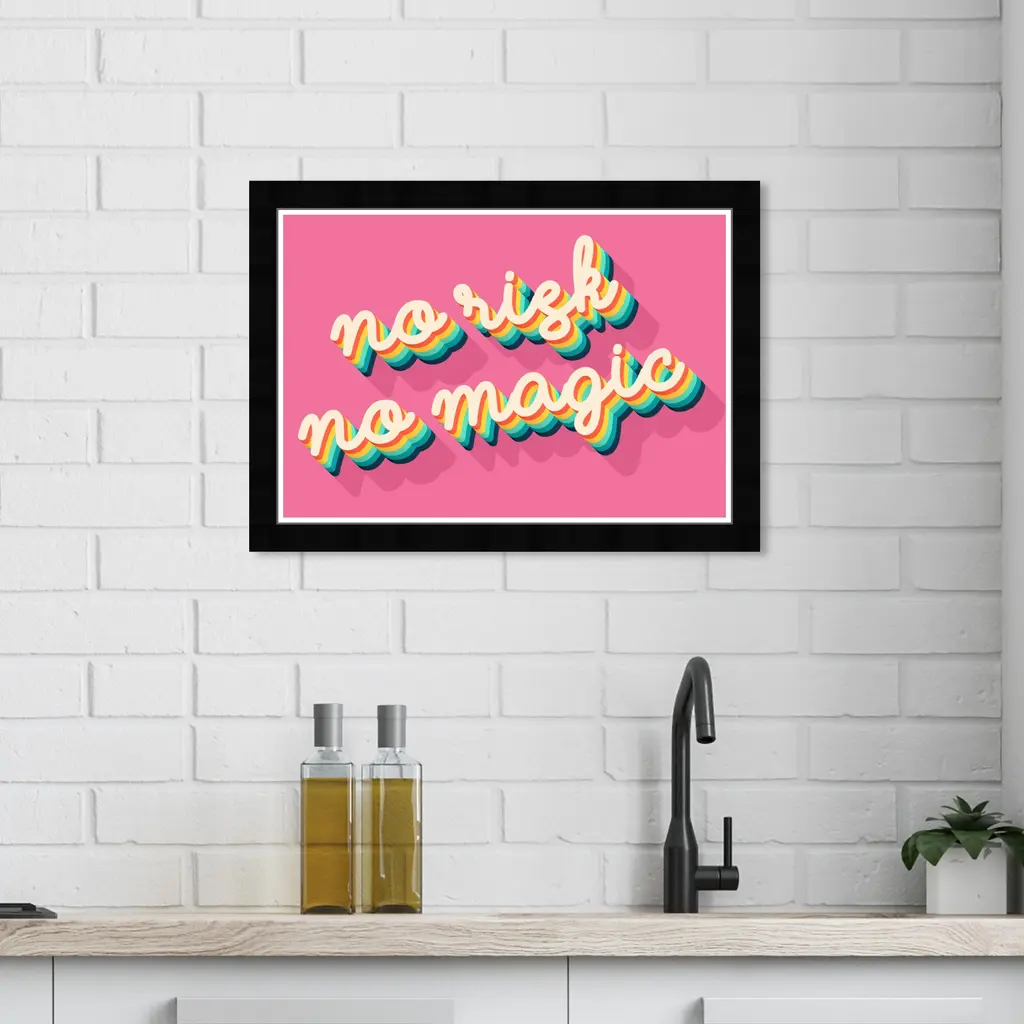No Risk No Magic Pink, is a skillfully made Modern & Contemporary art piece by real artists. With an overarching Pink color, this fine art print by Wynwood Studio Prints is the perfect finishing touch to your home décor theme. Features: This art piece has a horizontal orientation Typography and Symbols design with a Quotes and Sayings theme to bring you the perfect wall art Sustainable and forest friendly framed print Professionally hand framed in black picture frame Arrives ready to hang with pre-installed hooks for easy hanging. Nail and hanger also included Printed using ultra-premium and fade resistant inks to guarantee high definition and vivid colors Available in several size options Proudly made in the USA